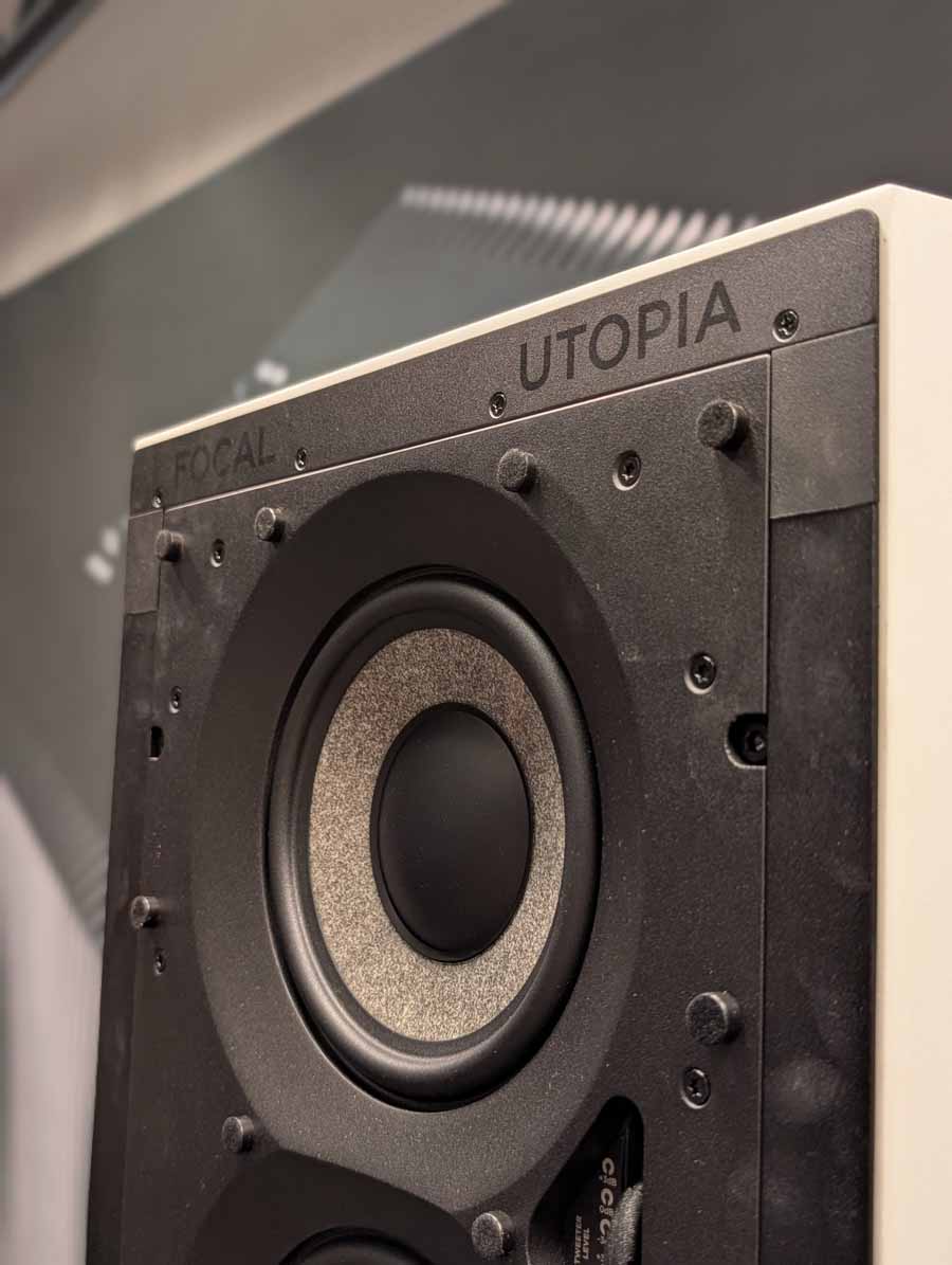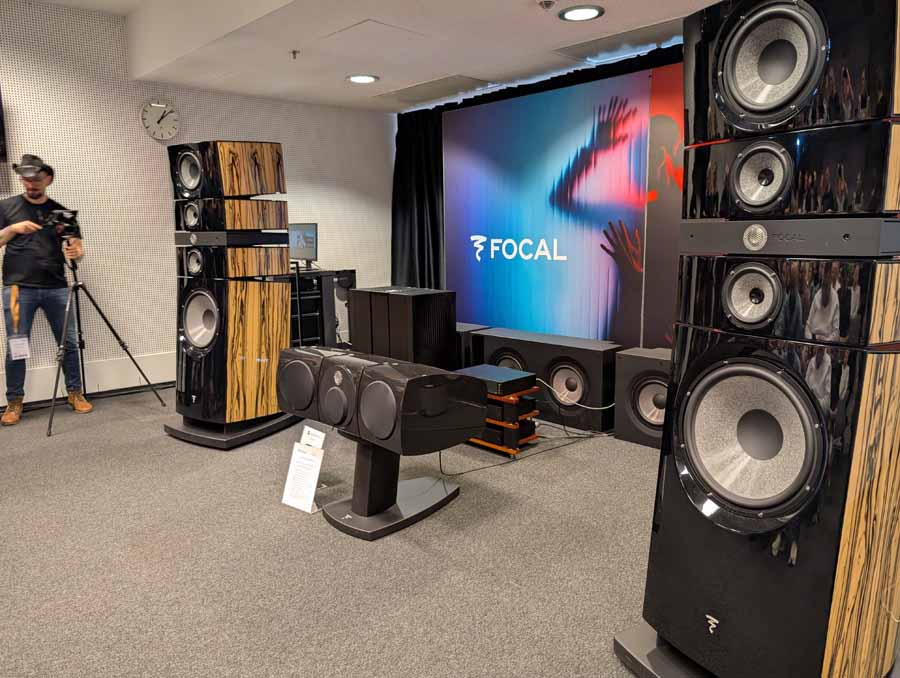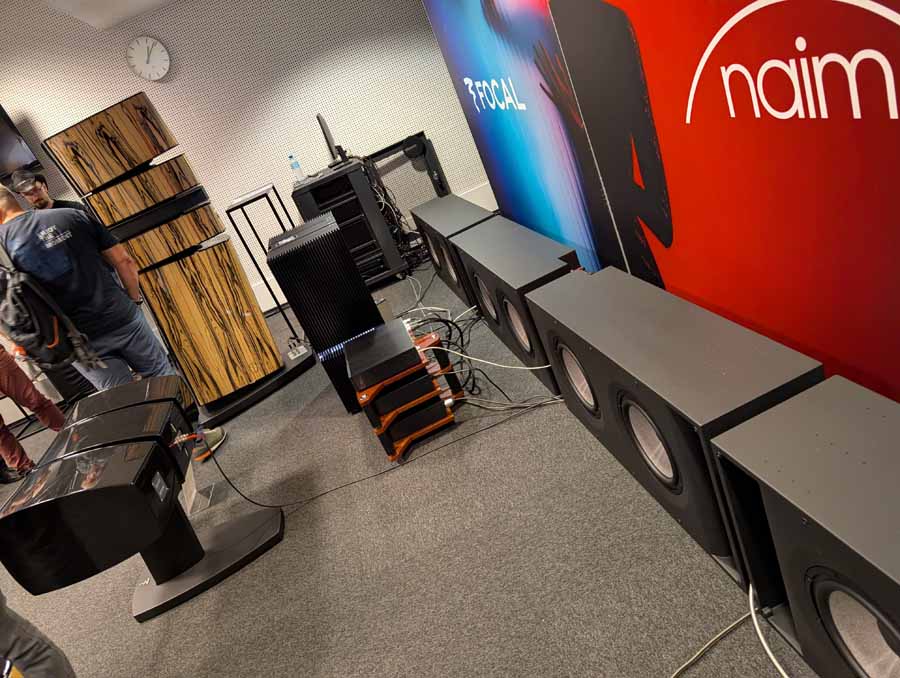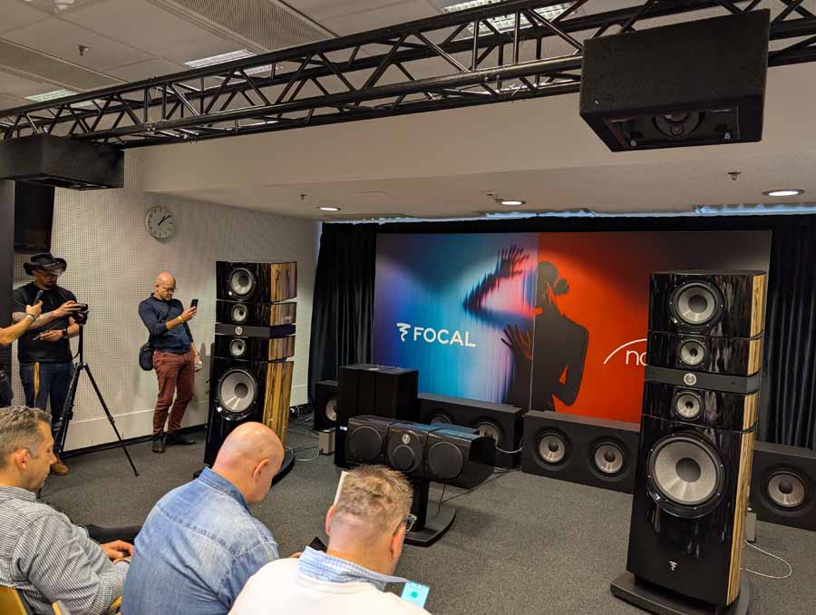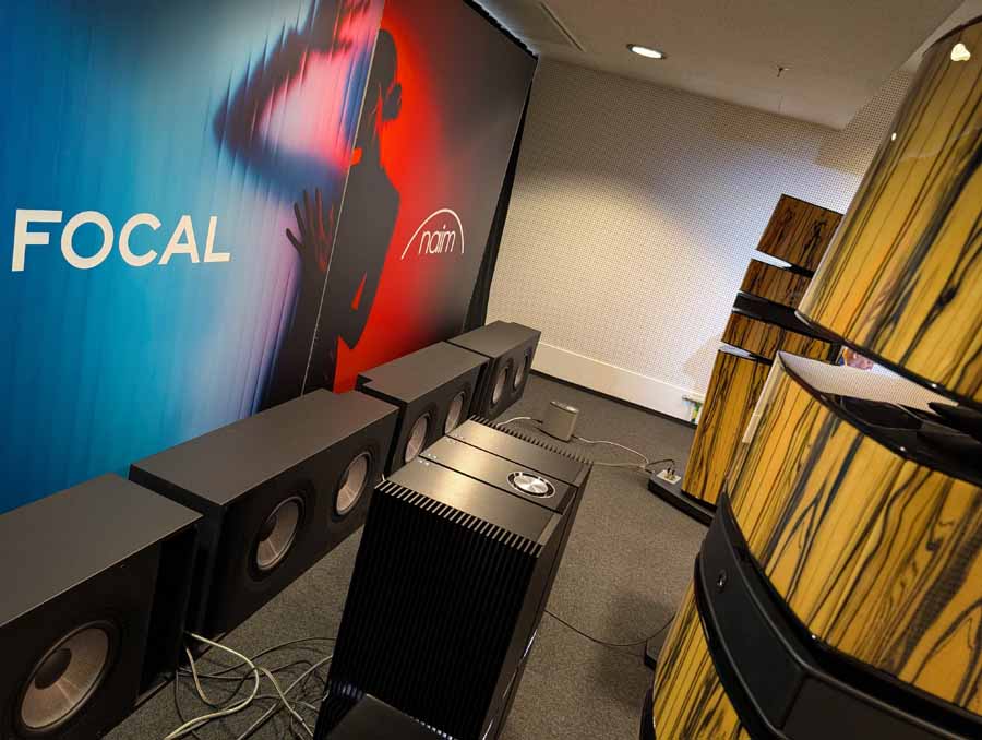 Visitors found a full Dolby Atmos installation using Focal Grande Utopia EM Evo loudspeakers which was another very, very busy room. Specially prepared Atmos soundtracks and a truss mounted speaker array created an immersive setup. The front channels used Focal Grande Utopia EM Evo, with a Viva Center Utopia Evo, four 1000 IW LCR Utopia with 1000 IW SUB for surrounds, and an overhead layer of 1000 IC LCR 5. Low frequencies came from four Focal Cinema Utopia subwoofers powered by four Naim CI NAP 101 amplifiers.