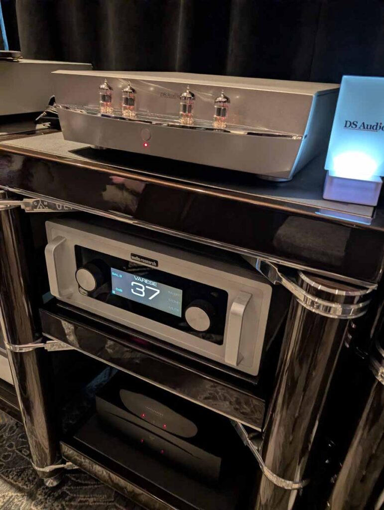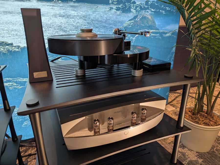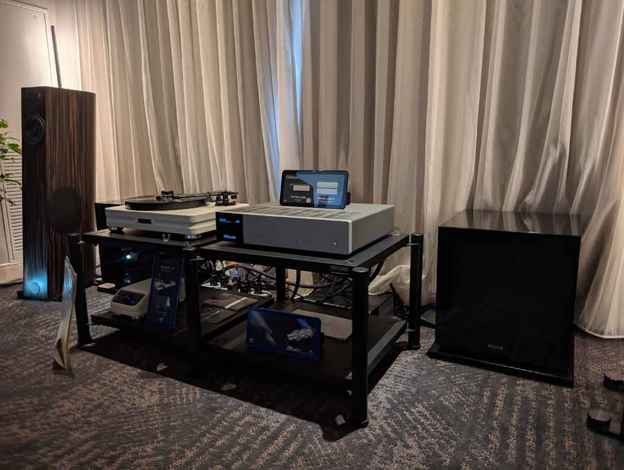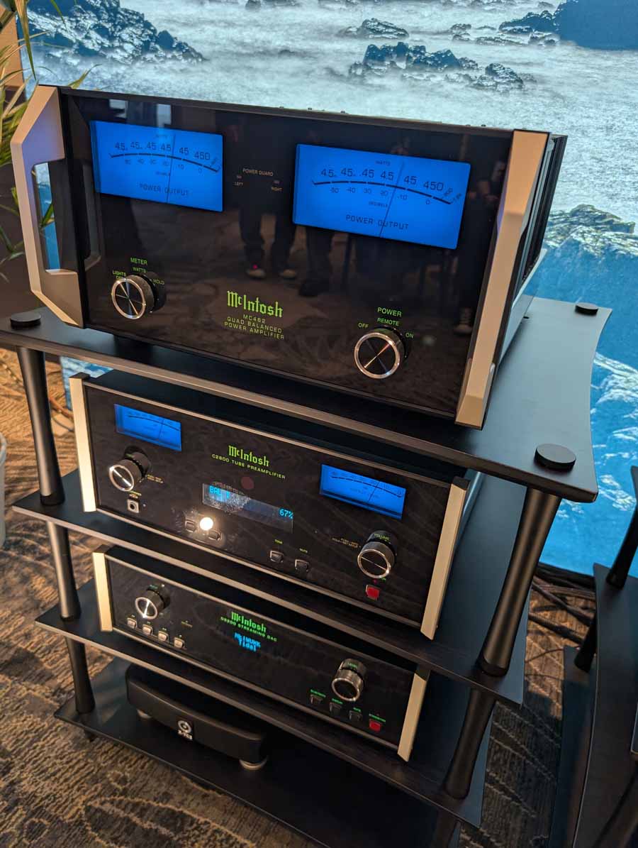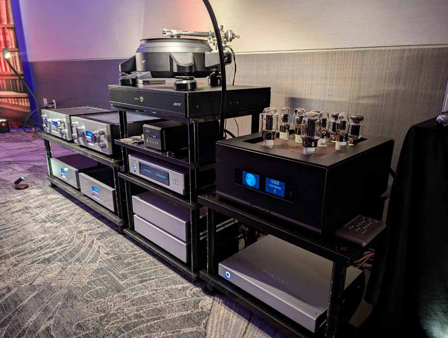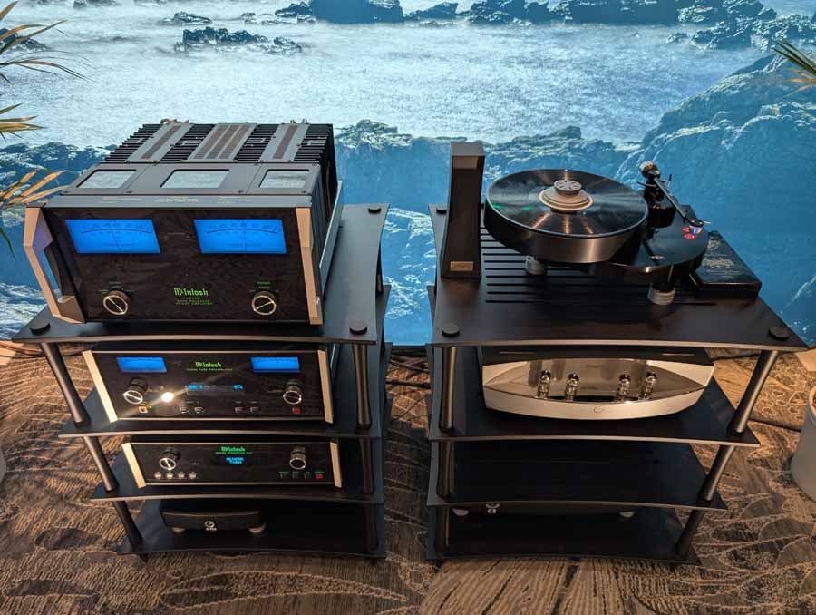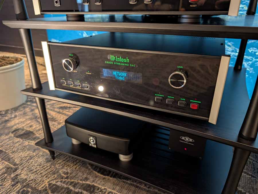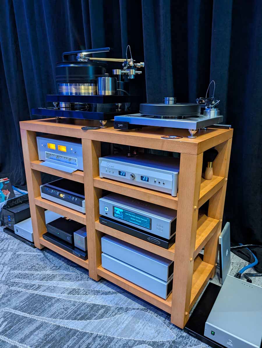 They had the DS200 streaming DAC, C2800 preamp, and MC462 power amp from McIntosh, with and AMG turntable, DS Audio optical cartridge, and DS Audio phono stage, with Ansuz cabling and power conditioning.