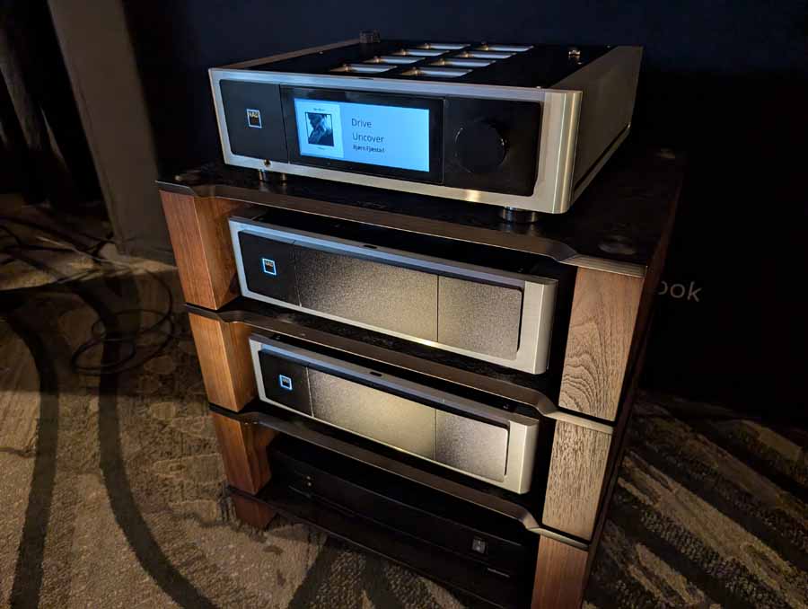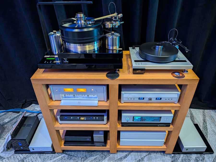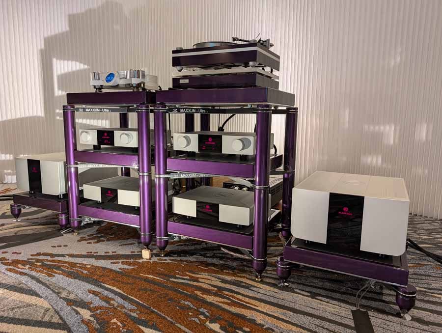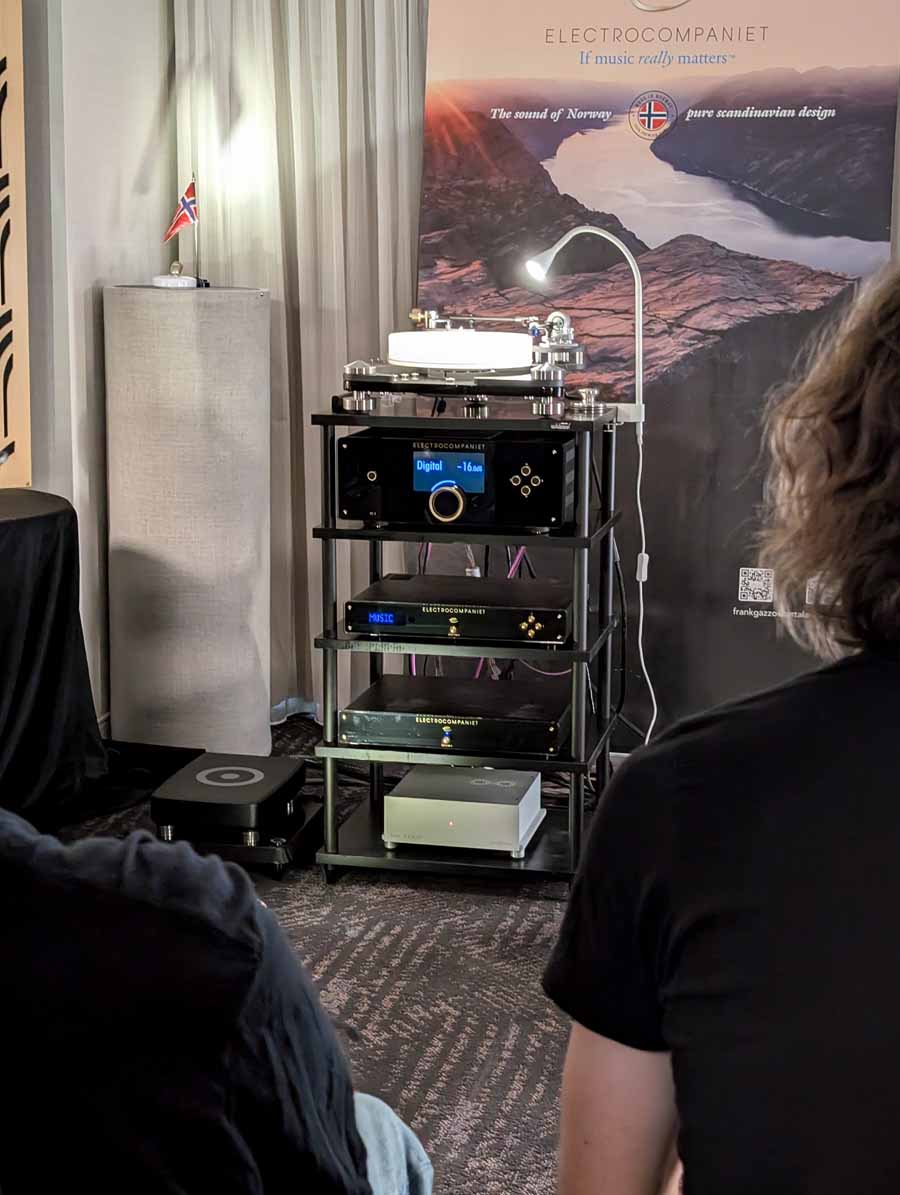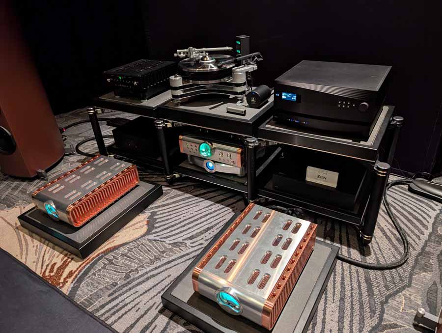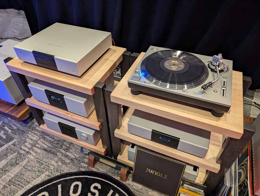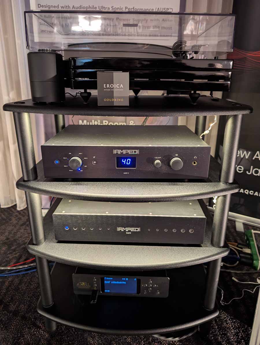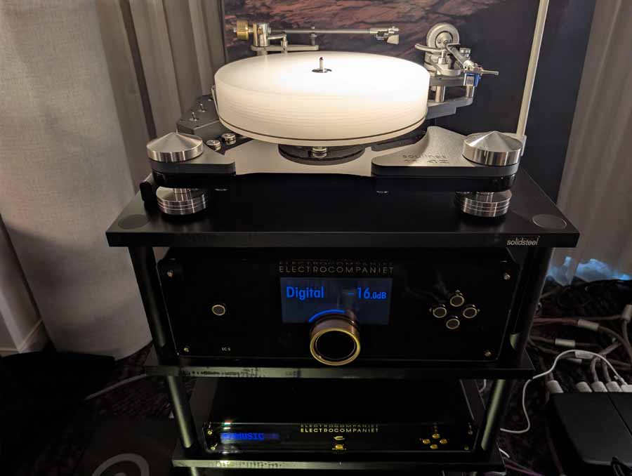They had the DS200 streaming DAC, C2800 preamp, and MC462 power amp from McIntosh, with and AMG turntable, DS Audio optical cartridge, and DS Audio phono stage, with Ansuz cabling and power conditioning.