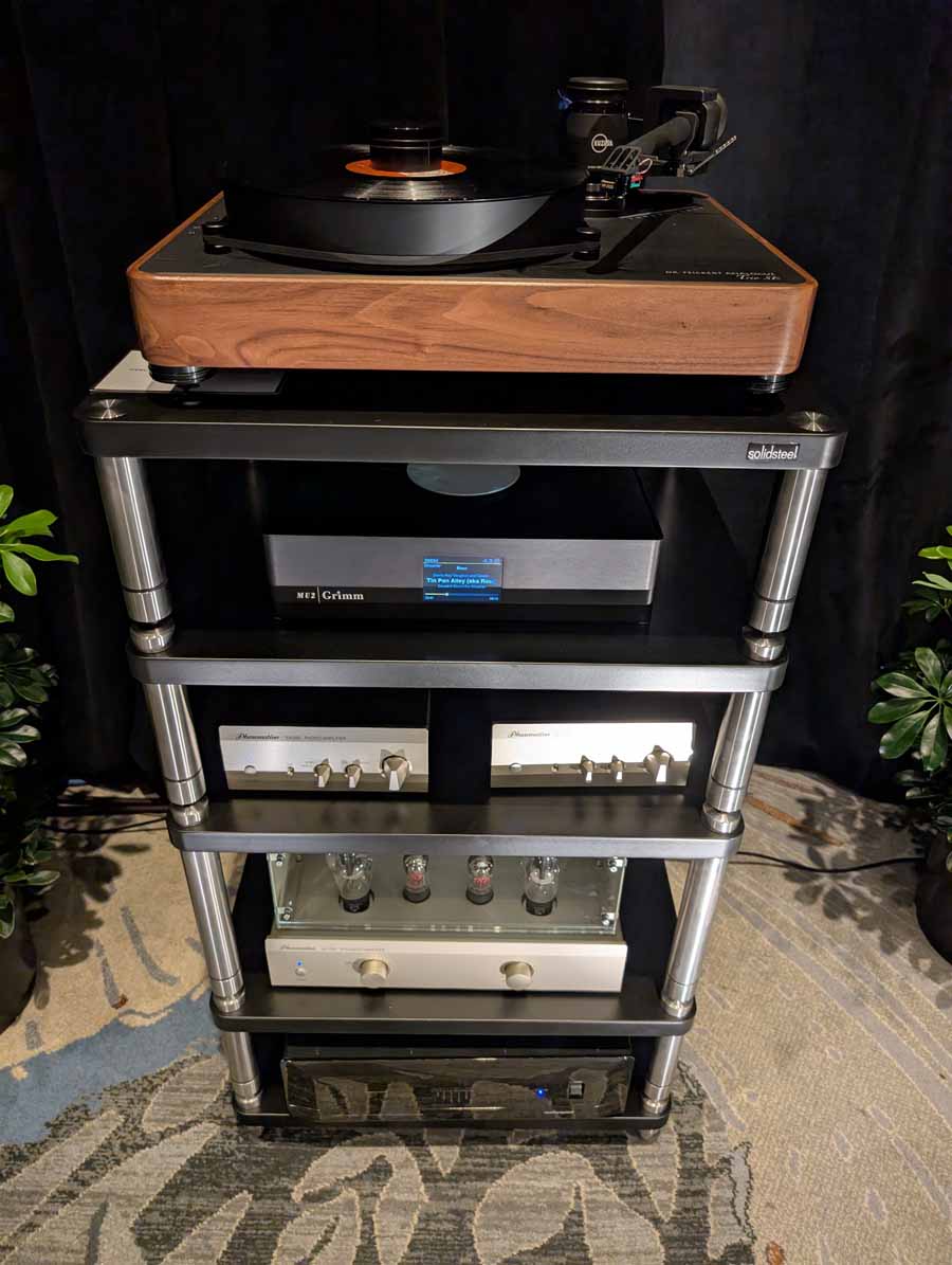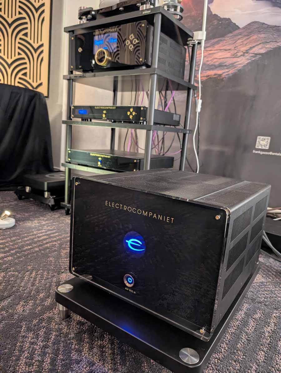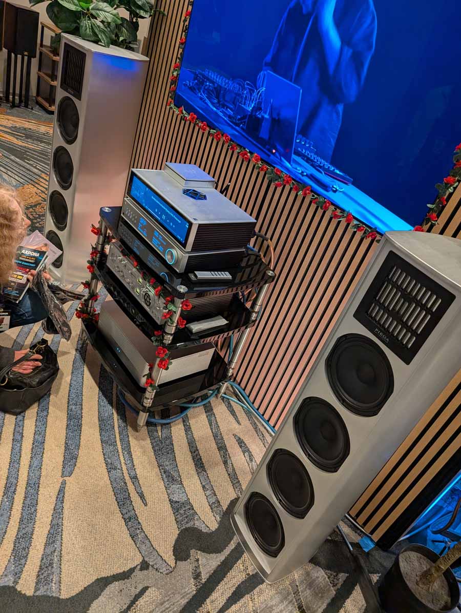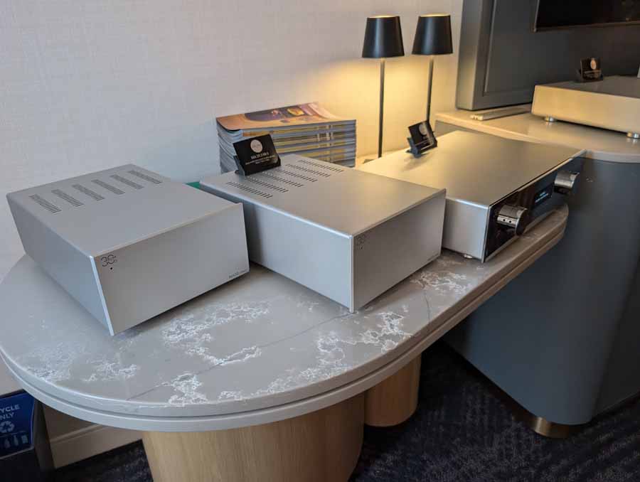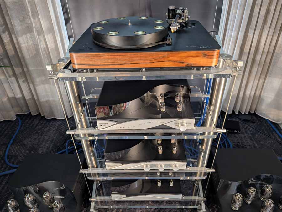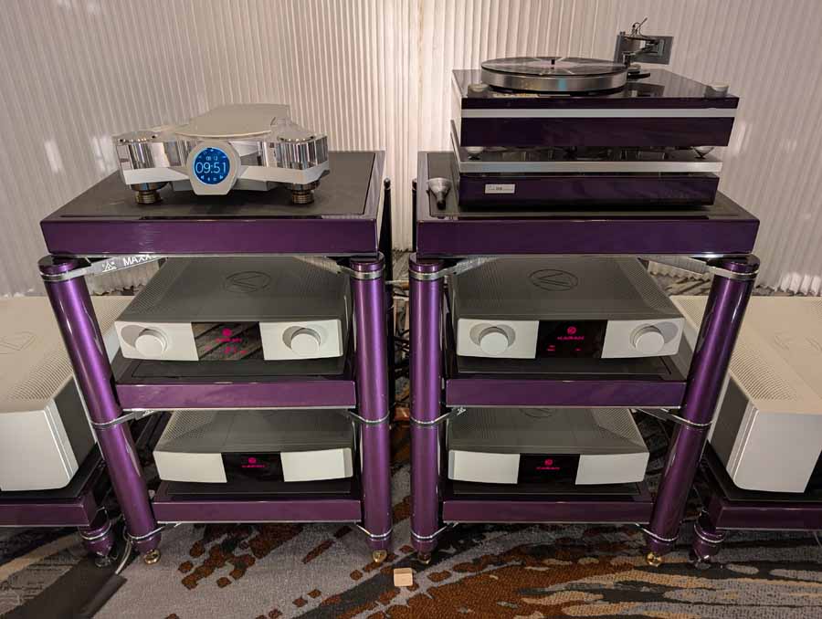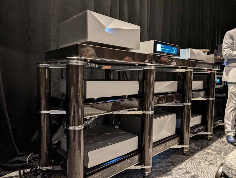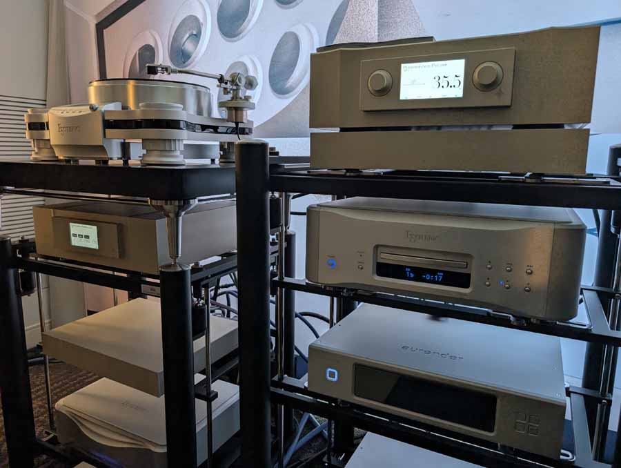 They had the DS200 streaming DAC, C2800 preamp, and MC462 power amp from McIntosh, with and AMG turntable, DS Audio optical cartridge, and DS Audio phono stage, with Ansuz cabling and power conditioning.