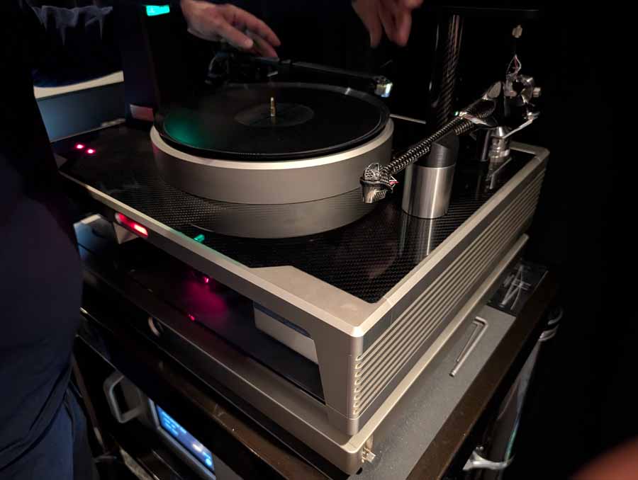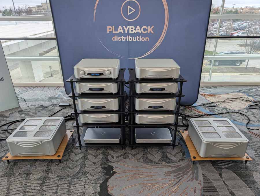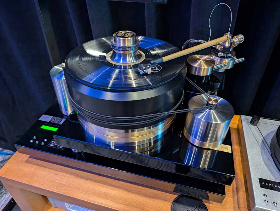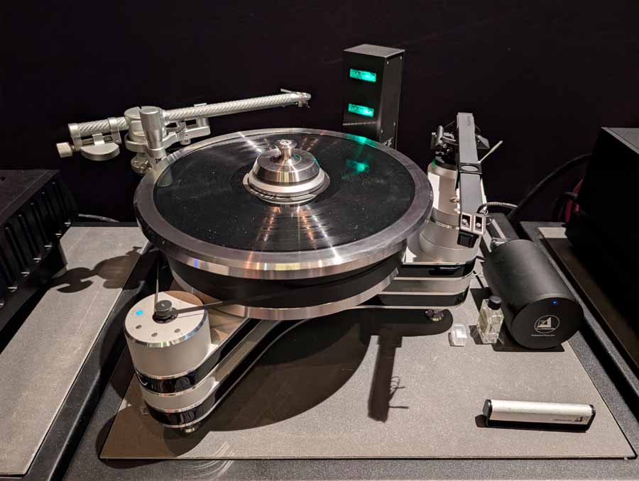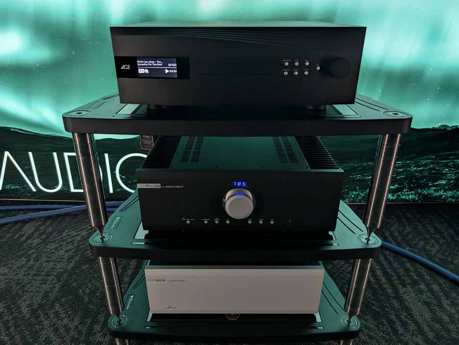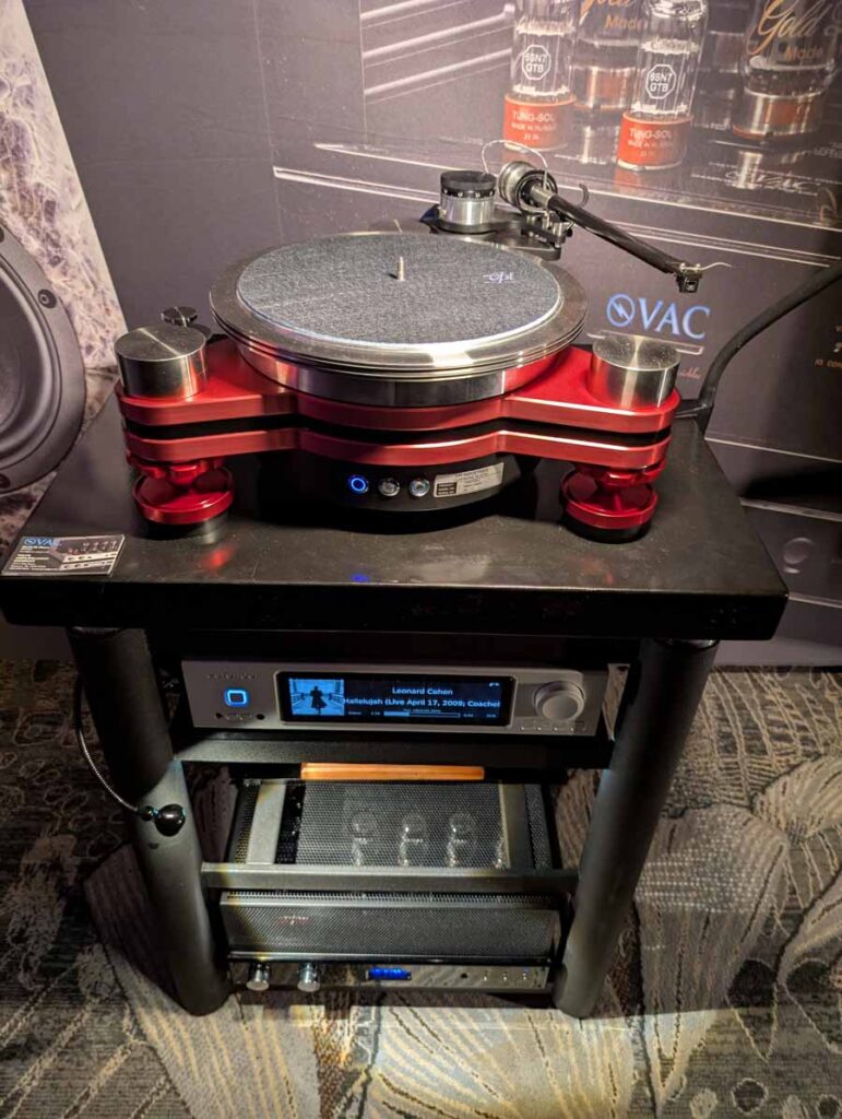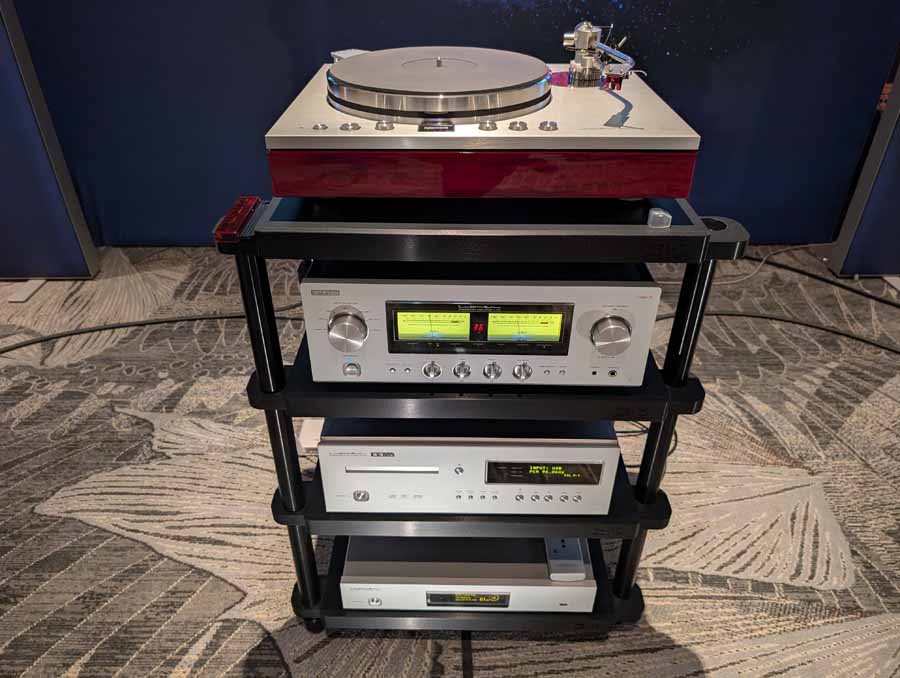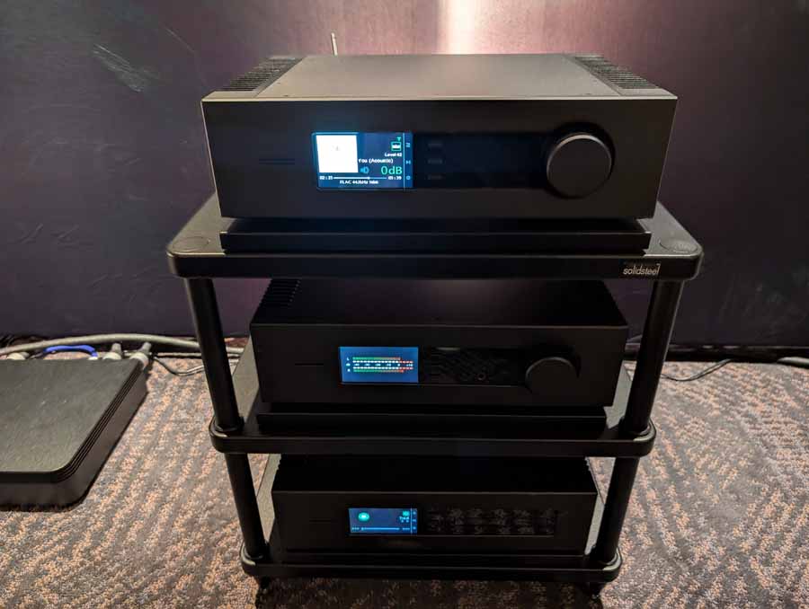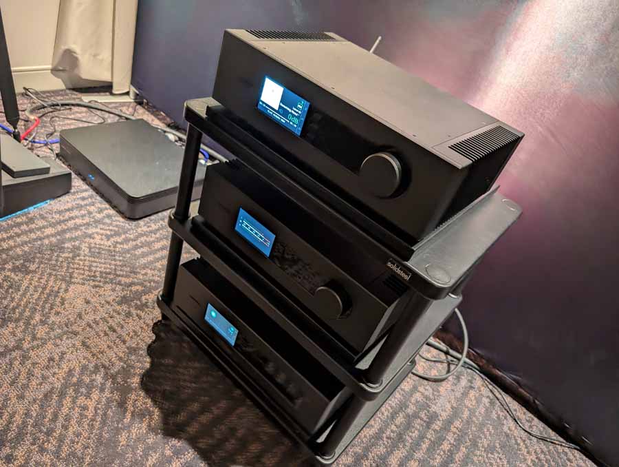 They had the DS200 streaming DAC, C2800 preamp, and MC462 power amp from McIntosh, with and AMG turntable, DS Audio optical cartridge, and DS Audio phono stage, with Ansuz cabling and power conditioning.
