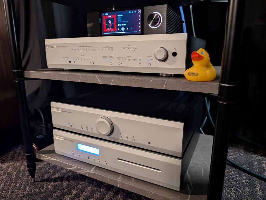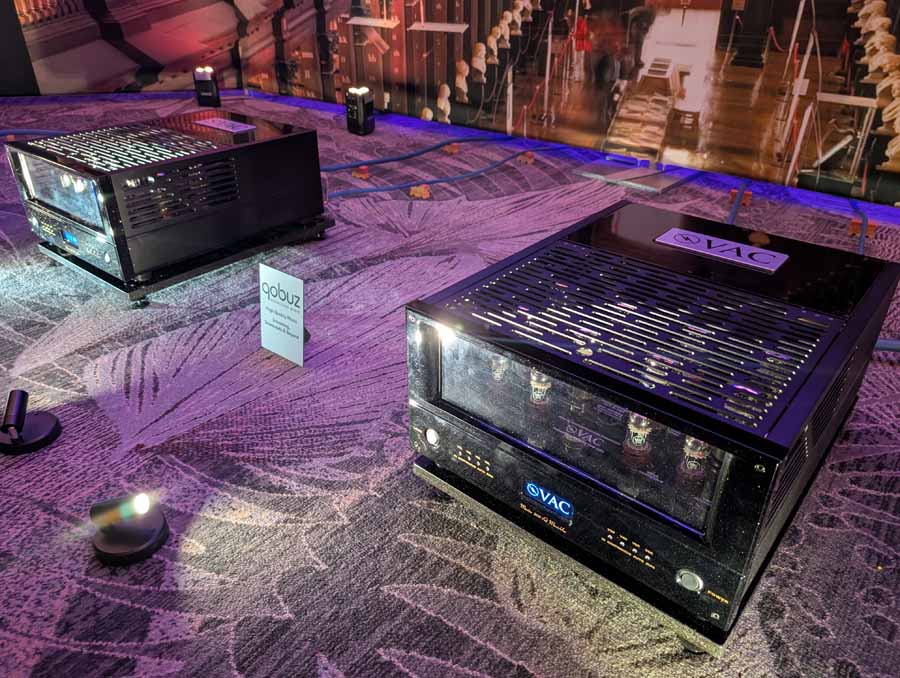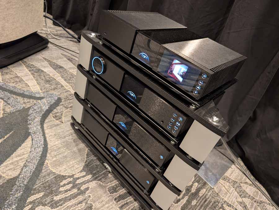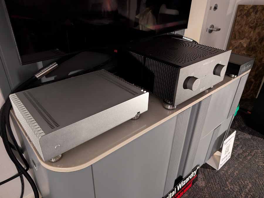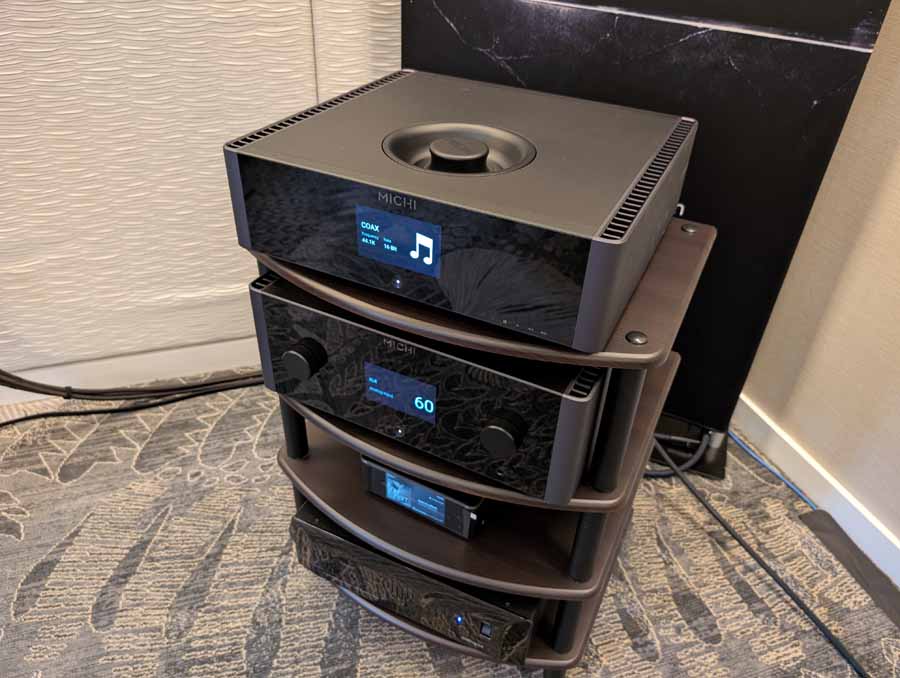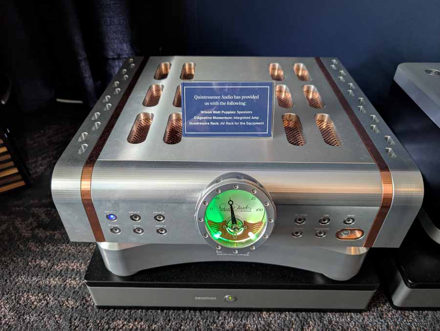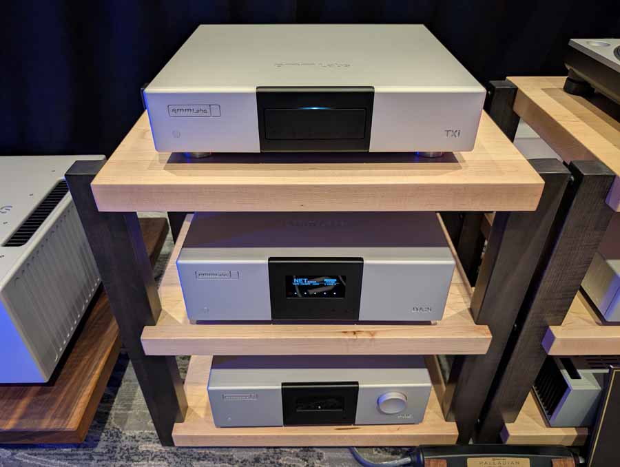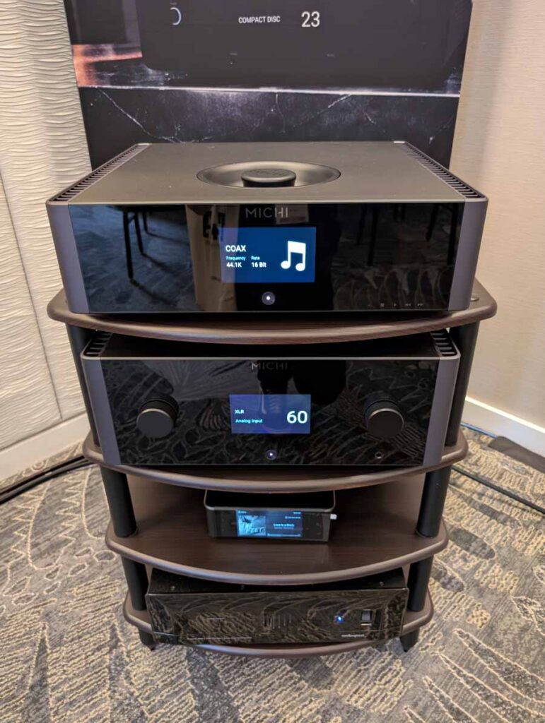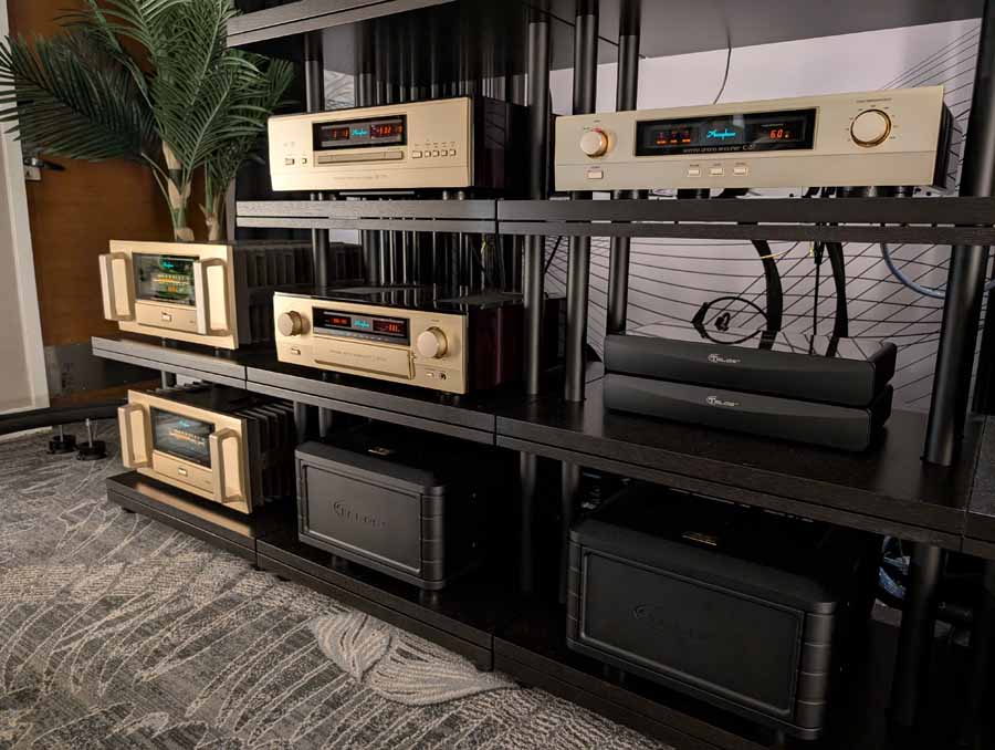 They had the DS200 streaming DAC, C2800 preamp, and MC462 power amp from McIntosh, with and AMG turntable, DS Audio optical cartridge, and DS Audio phono stage, with Ansuz cabling and power conditioning.