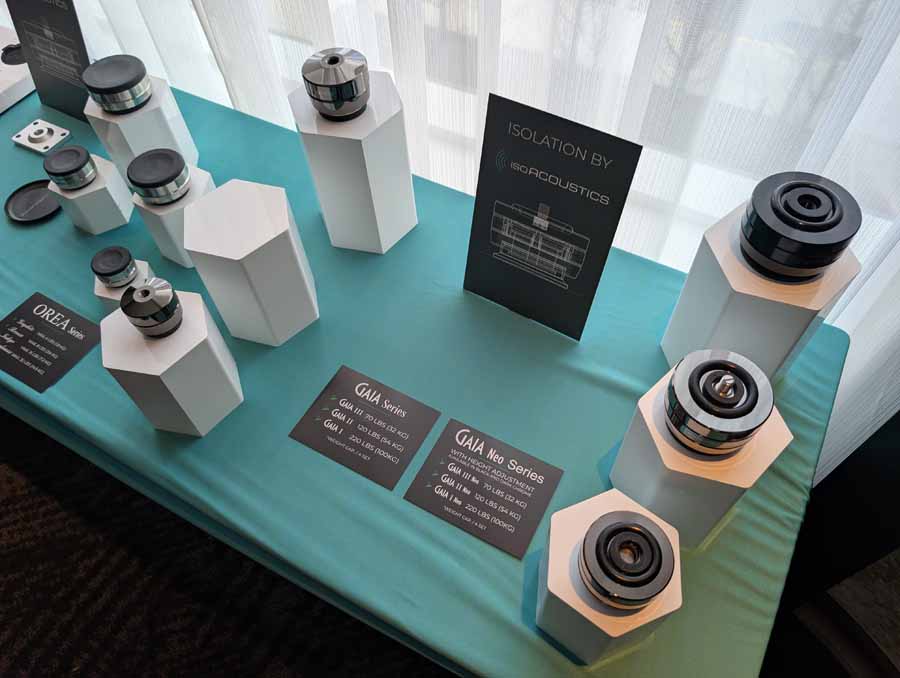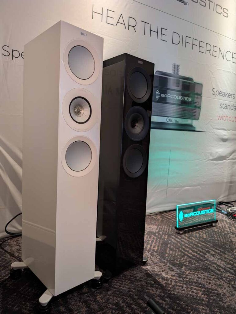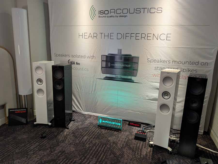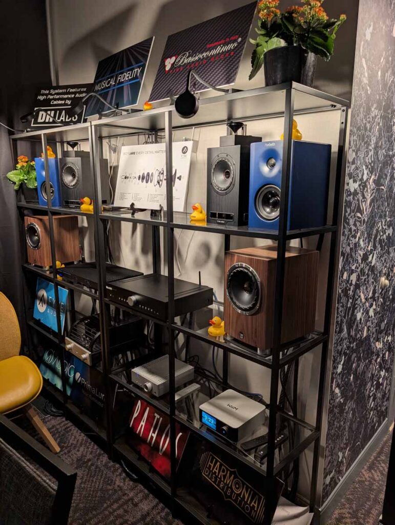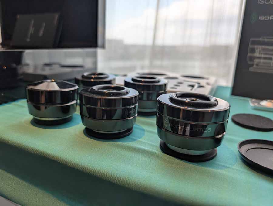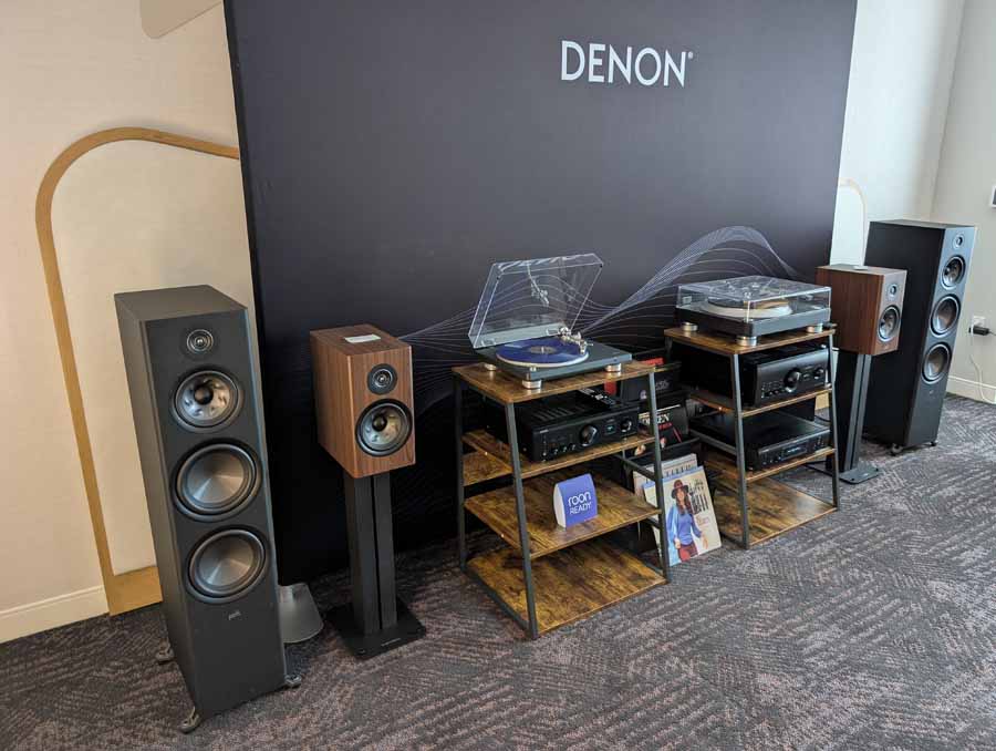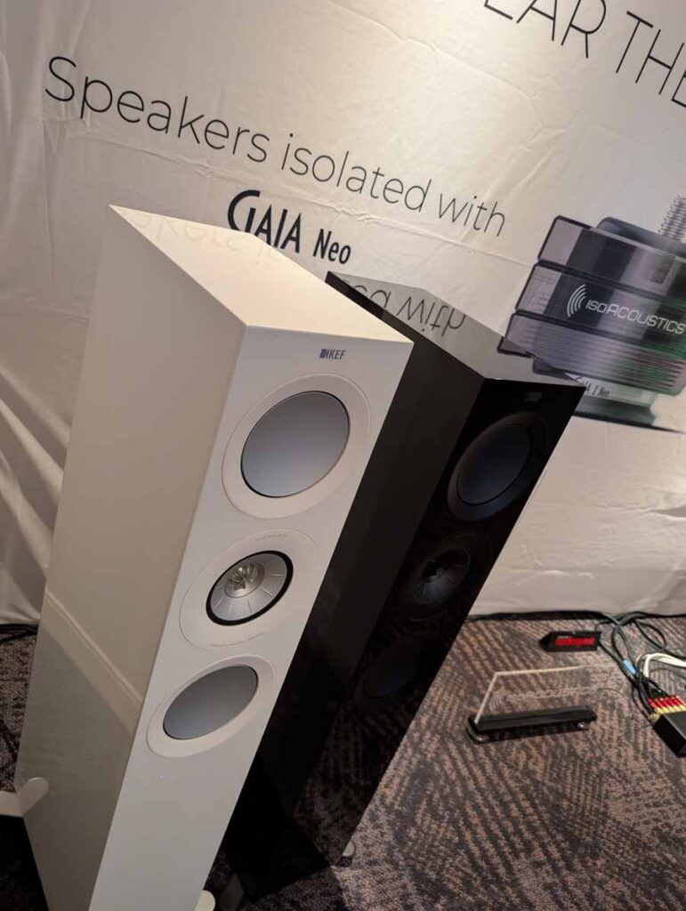 Isoacoustics had their usual range of excellent isolation products, alongside their A/B demo of the Gaia Neo feet – using two pairs of KEF R7 Meta speakers, one with Gaia Neo feet, the other using standard KEF feet. It’s a very effective demo, and the sound is noticeably more controlled and focussed with the Isoacoustics feet – they were using a Cambridge Audio EXN100 and EXA100 streamer / integrated amp stack to drive the speakers.