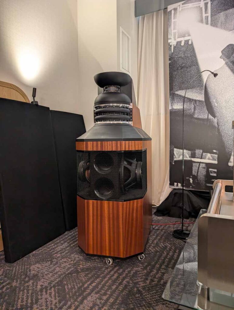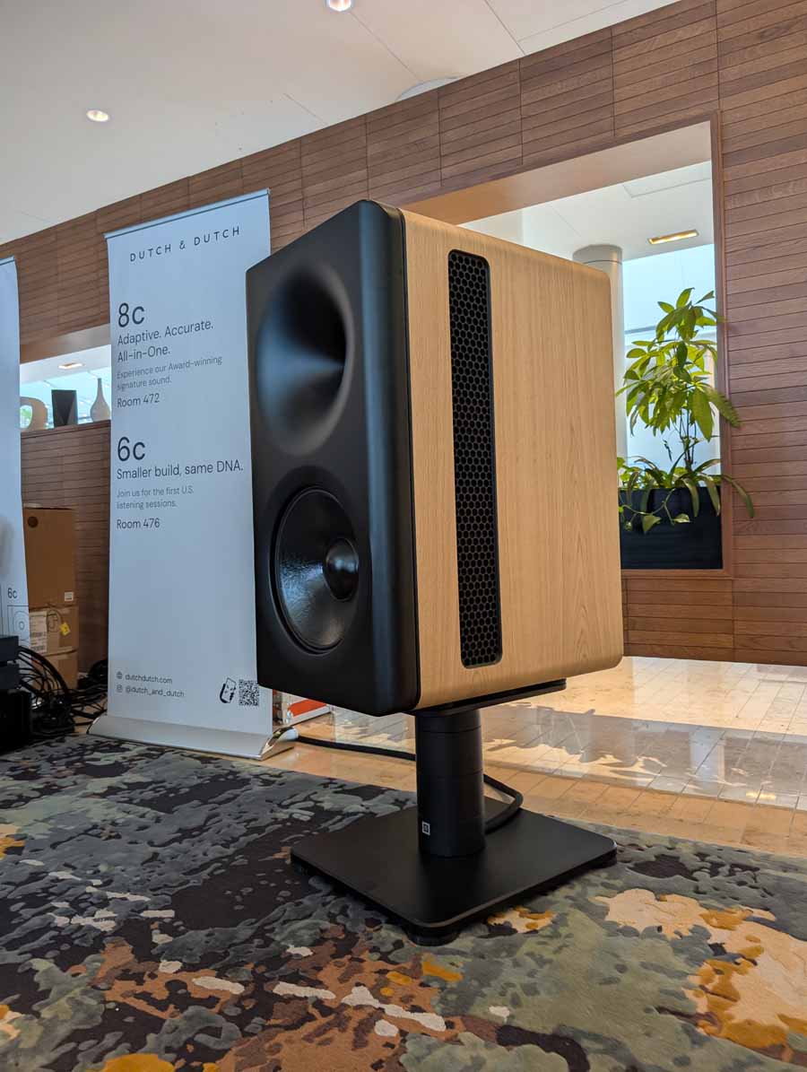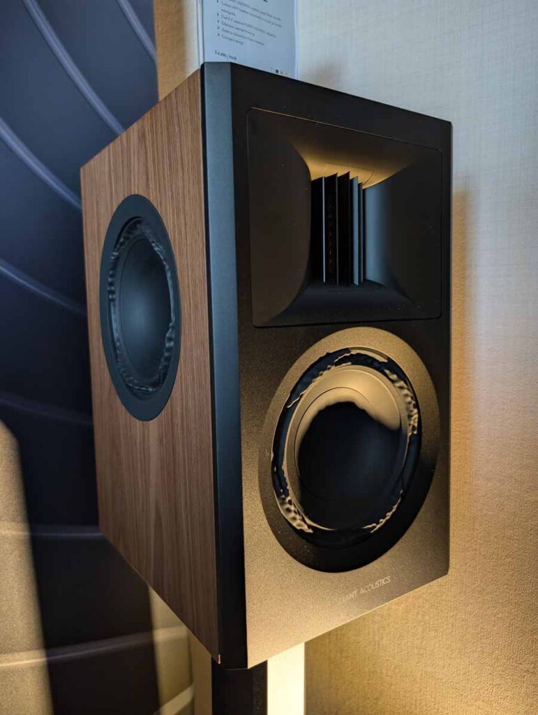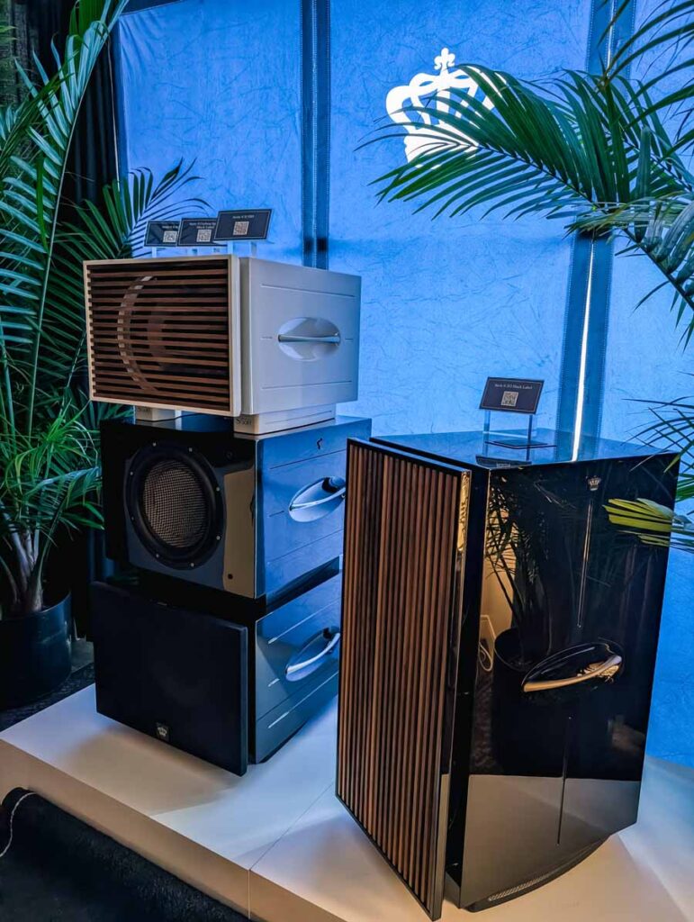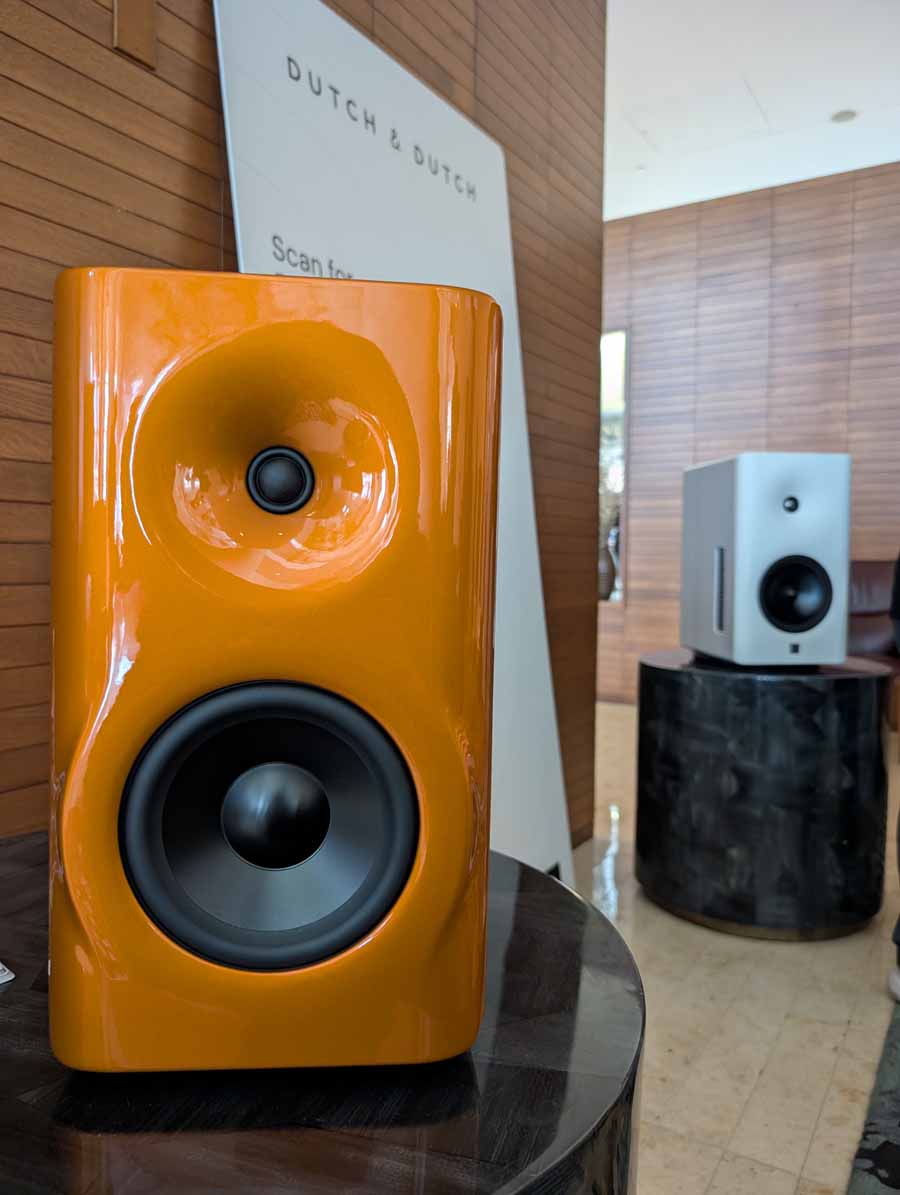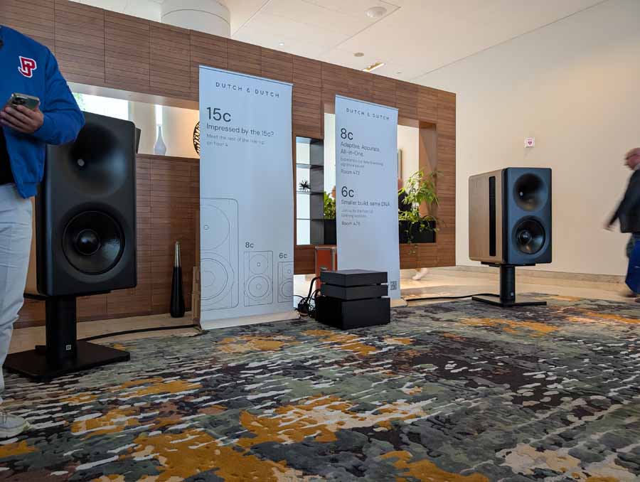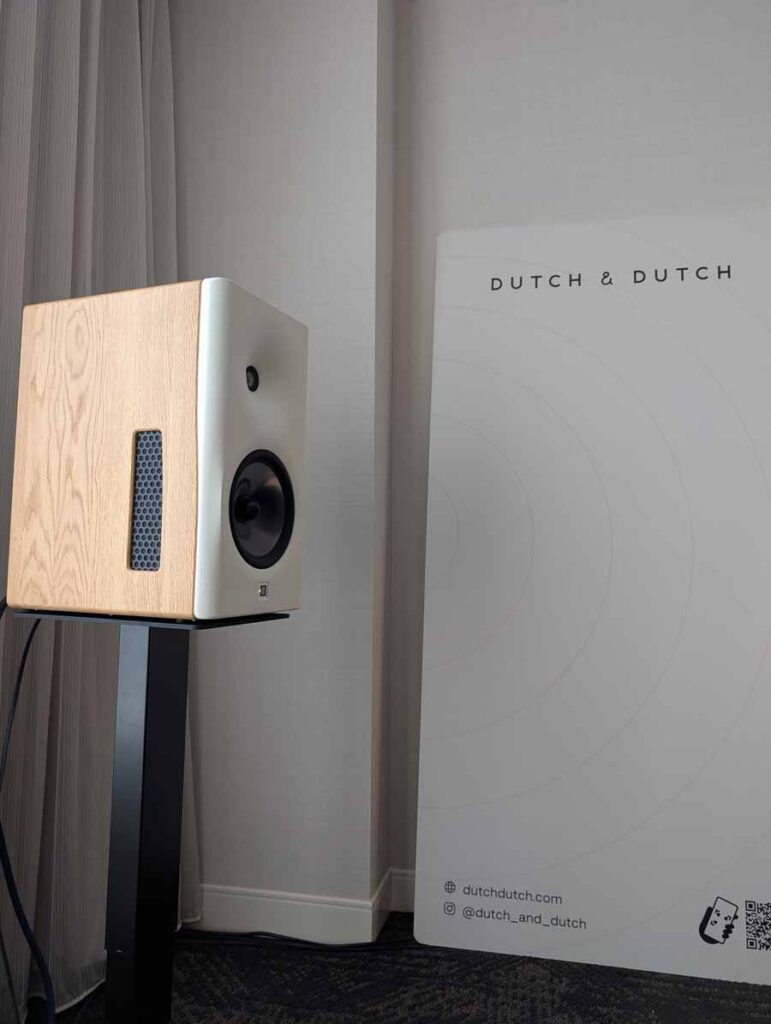Dutch & Dutch showcased their 15C speakers in the lobby, featuring two massive 15-inch subwoofers, a 15-inch midrange driver, and a 15-inch waveguide for the tweeter. This all-in-one system includes internal DACs, DSP, and room-matching technology, alongside a powerful streaming core. I did ask how low these went in the lobby, and they can reach down to 10Hz – these are huge speakers and need room to breathe, easily filling the massive lobby area when cranked up a bit.