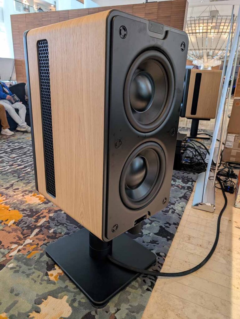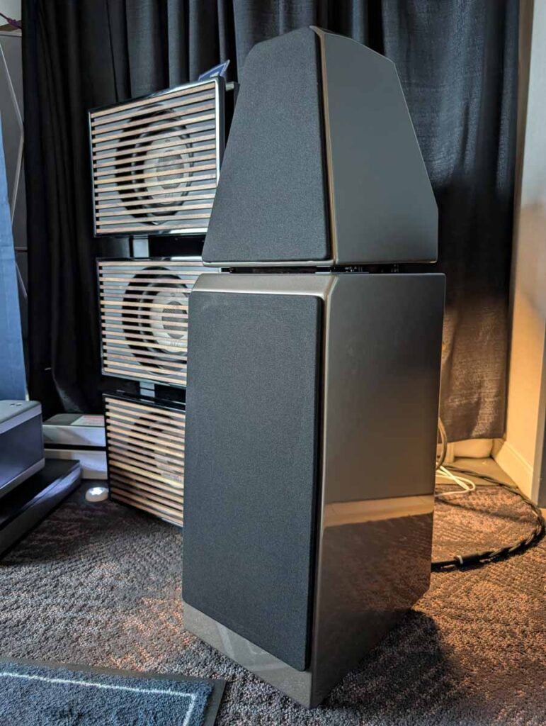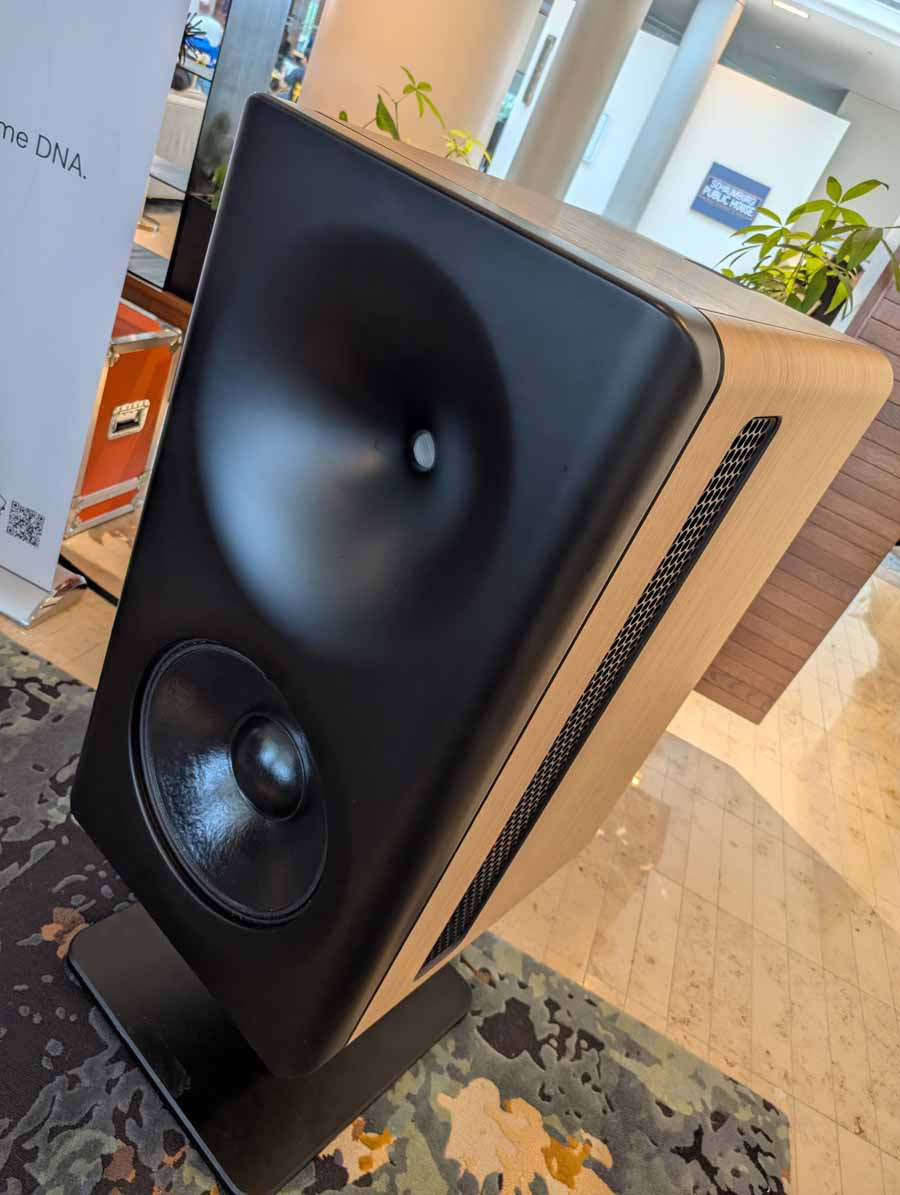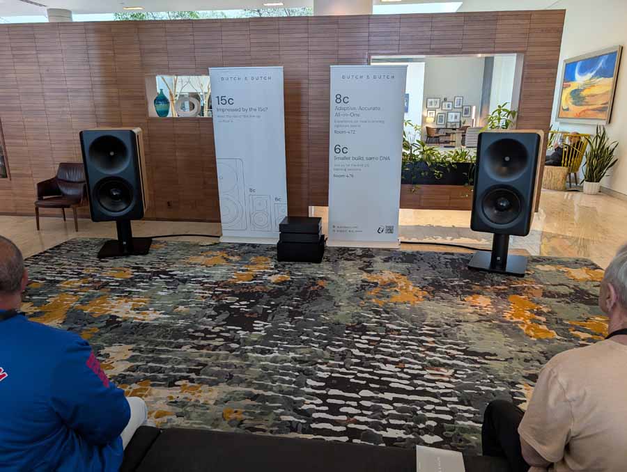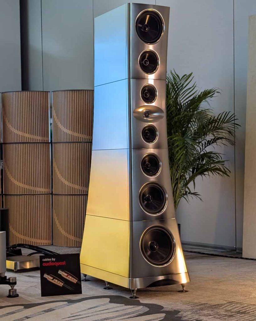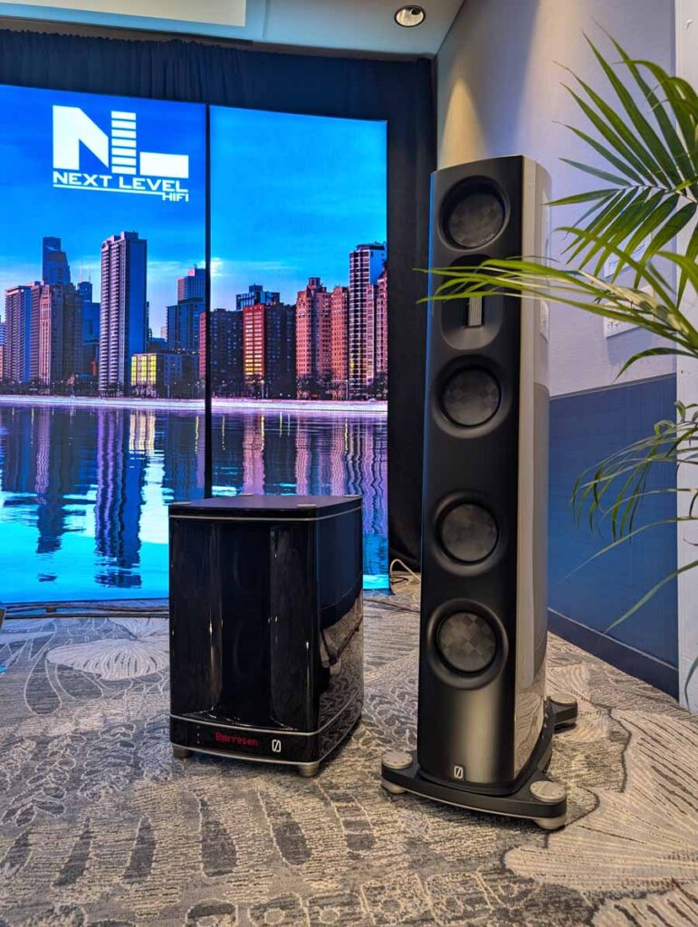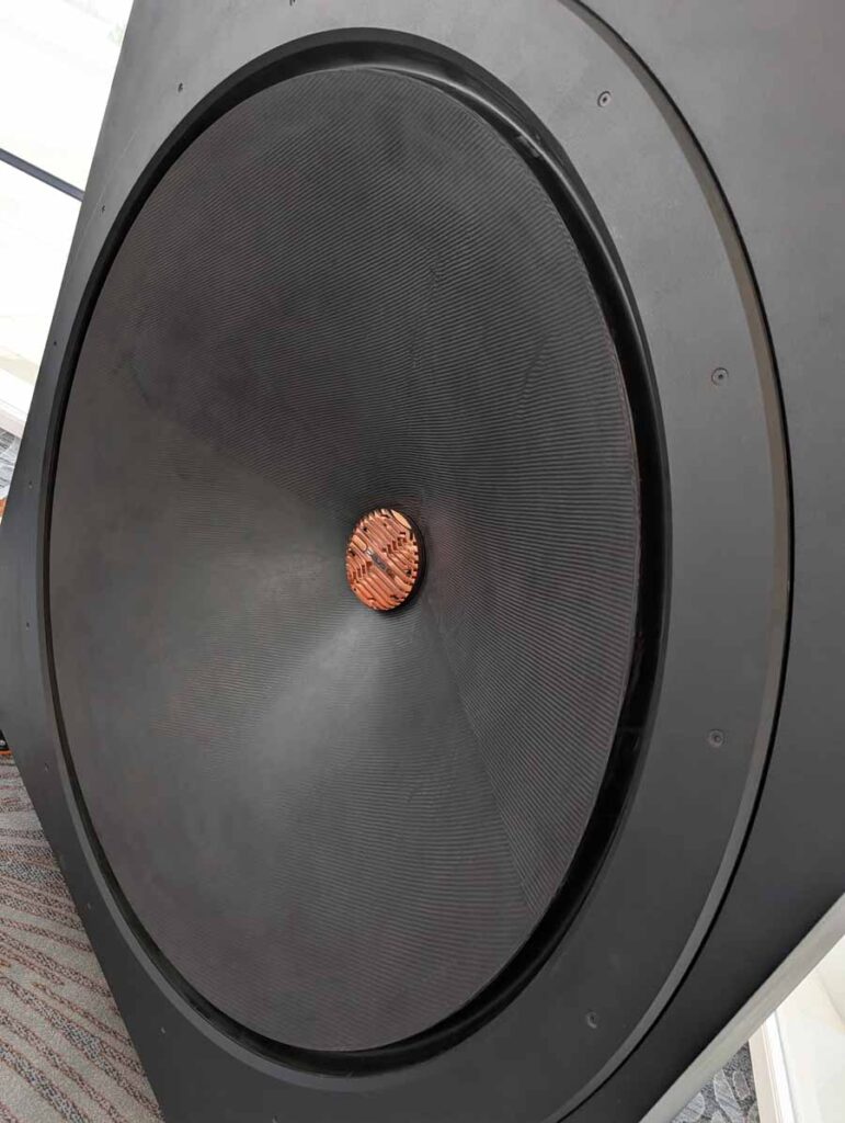 Dutch & Dutch showcased their 15C speakers in the lobby, featuring two massive 15-inch subwoofers, a 15-inch midrange driver, and a 15-inch waveguide for the tweeter. This all-in-one system includes internal DACs, DSP, and room-matching technology, alongside a powerful streaming core. I did ask how low these went in the lobby, and they can reach down to 10Hz – these are huge speakers and need room to breathe, easily filling the massive lobby area when cranked up a bit.