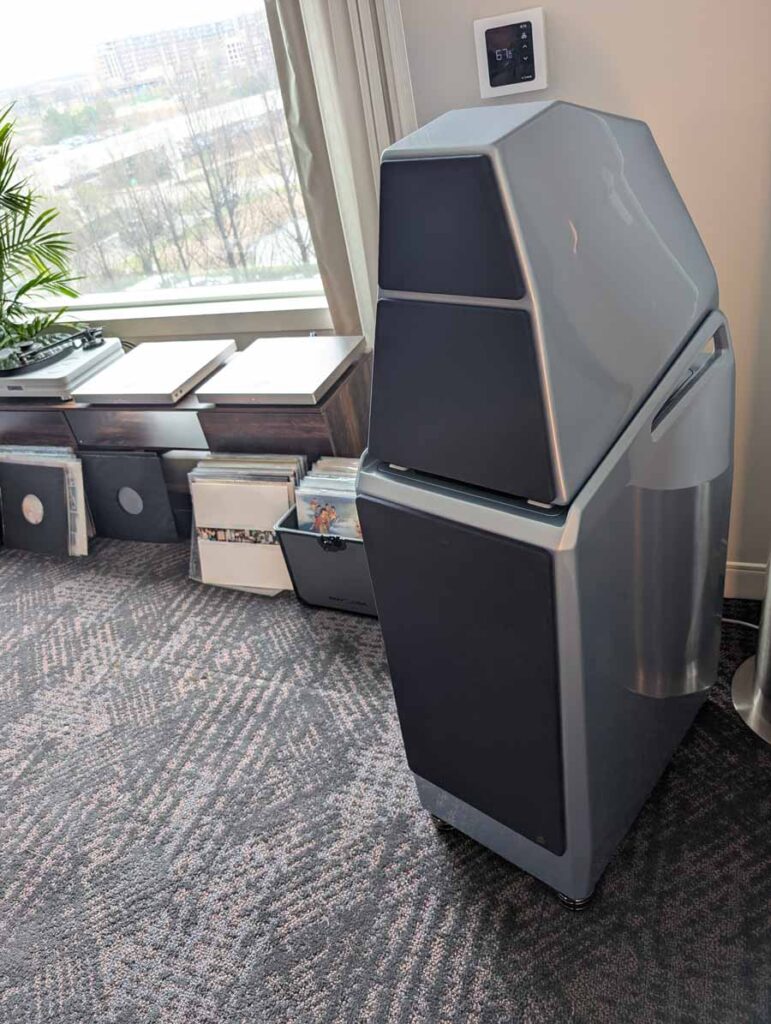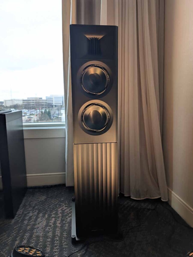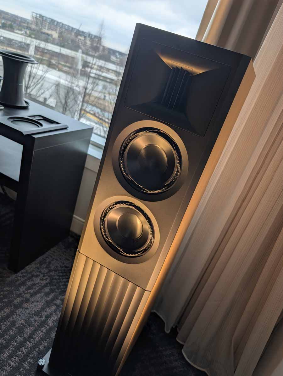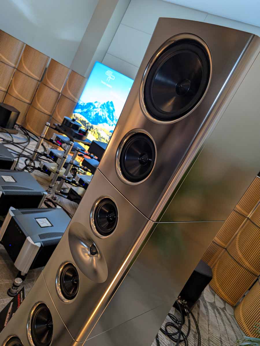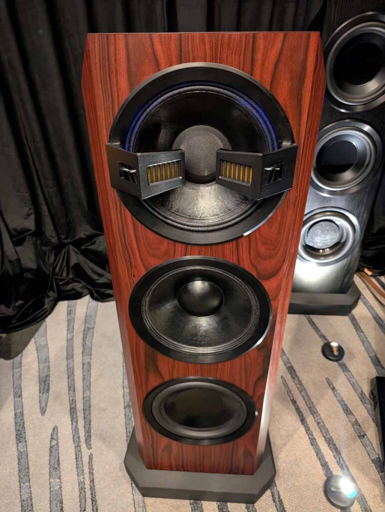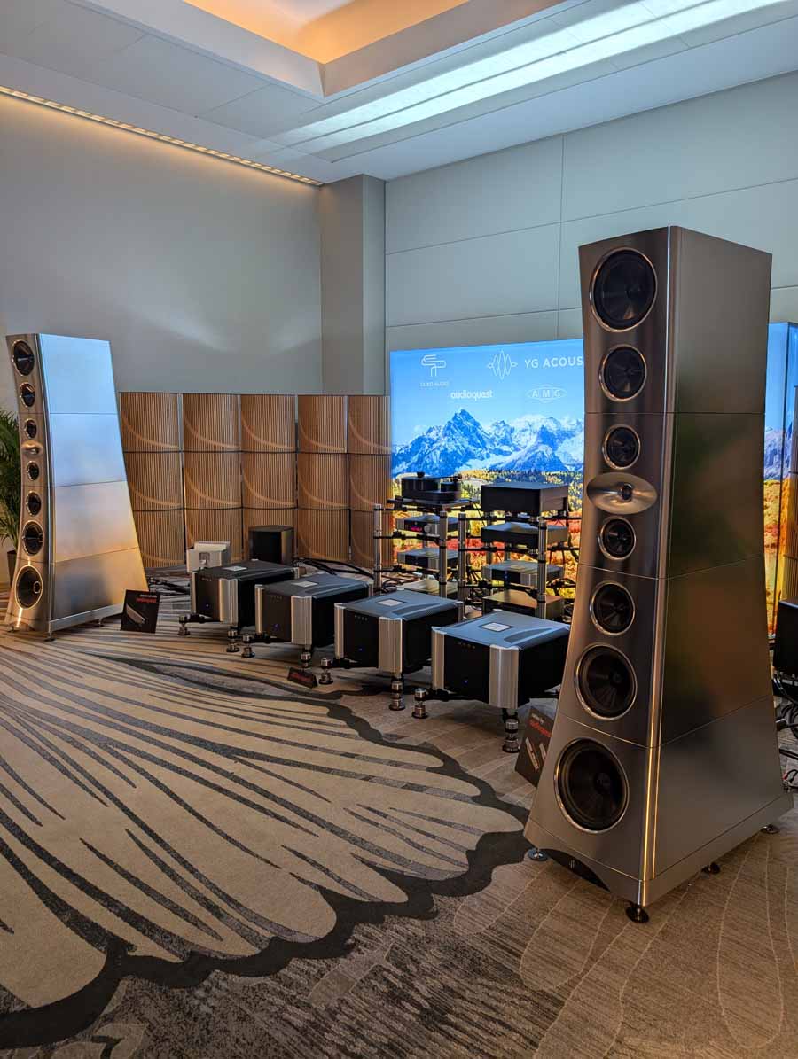 Dutch & Dutch showcased their 15C speakers in the lobby, featuring two massive 15-inch subwoofers, a 15-inch midrange driver, and a 15-inch waveguide for the tweeter. This all-in-one system includes internal DACs, DSP, and room-matching technology, alongside a powerful streaming core. I did ask how low these went in the lobby, and they can reach down to 10Hz – these are huge speakers and need room to breathe, easily filling the massive lobby area when cranked up a bit.