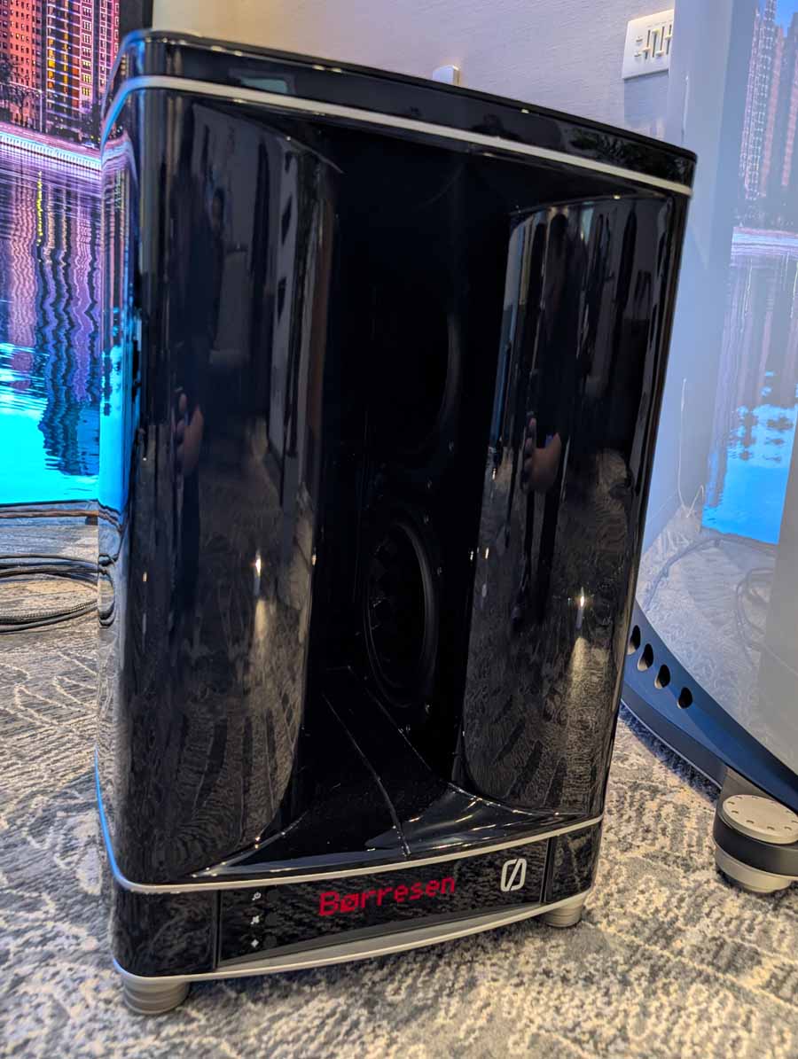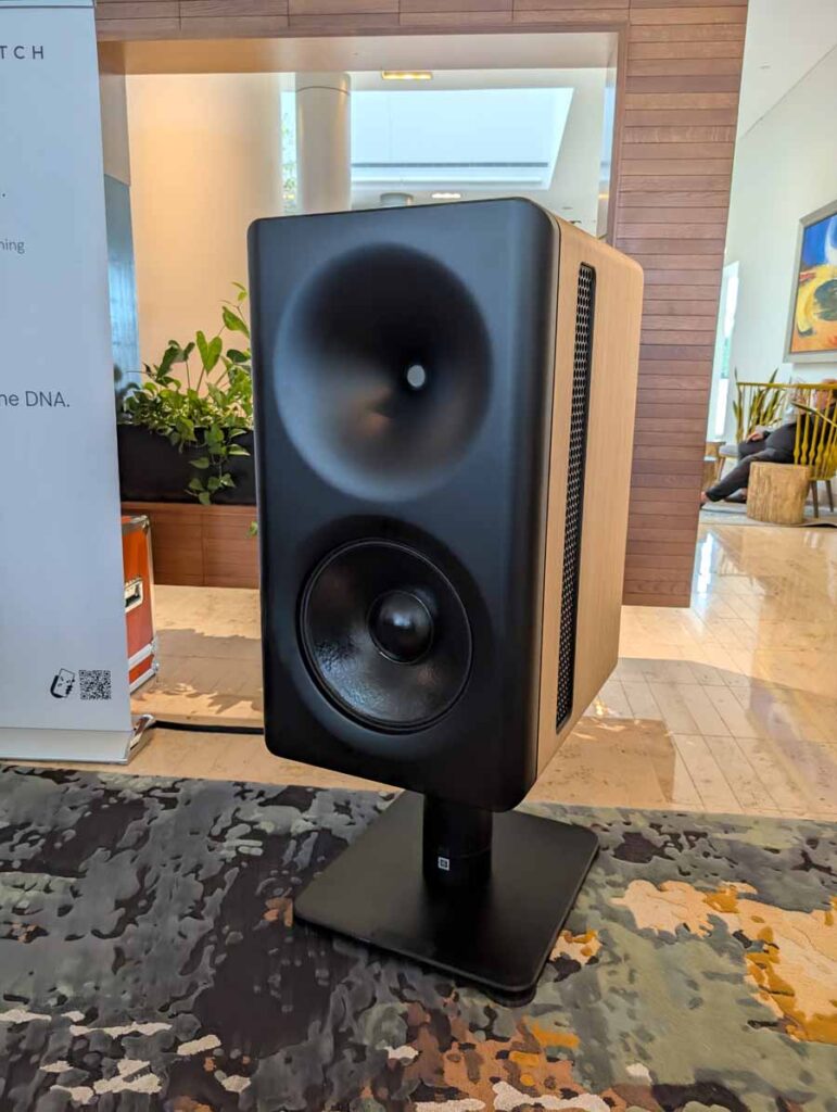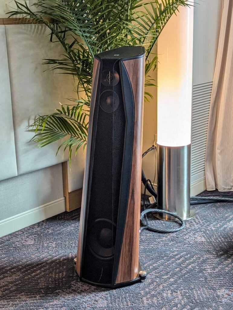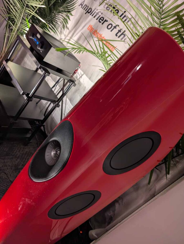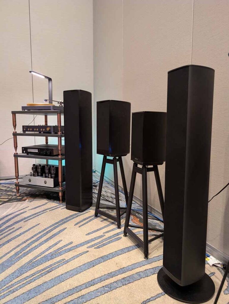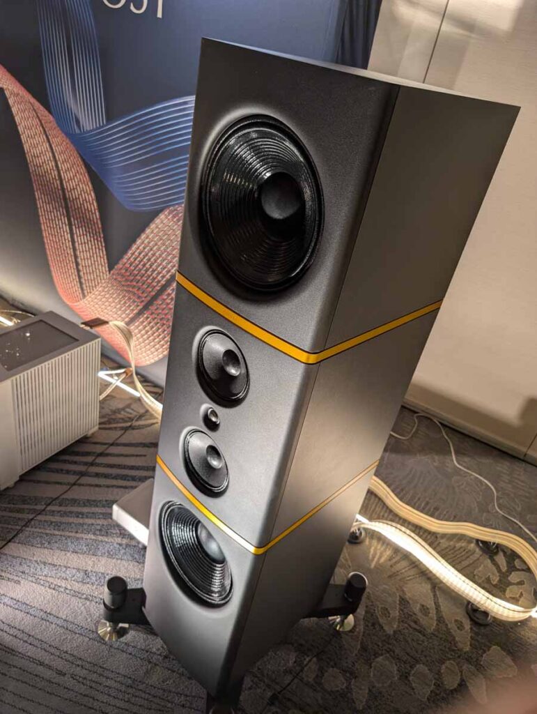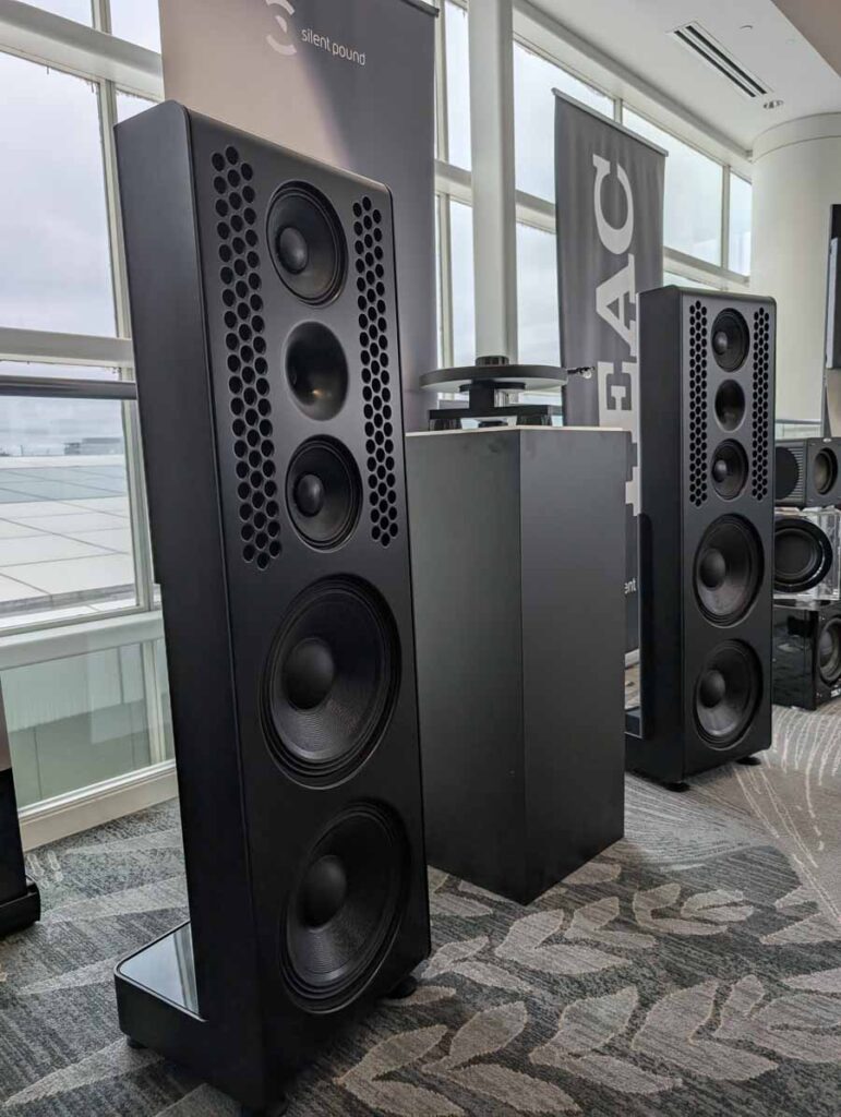 Dutch & Dutch showcased their 15C speakers in the lobby, featuring two massive 15-inch subwoofers, a 15-inch midrange driver, and a 15-inch waveguide for the tweeter. This all-in-one system includes internal DACs, DSP, and room-matching technology, alongside a powerful streaming core. I did ask how low these went in the lobby, and they can reach down to 10Hz – these are huge speakers and need room to breathe, easily filling the massive lobby area when cranked up a bit.