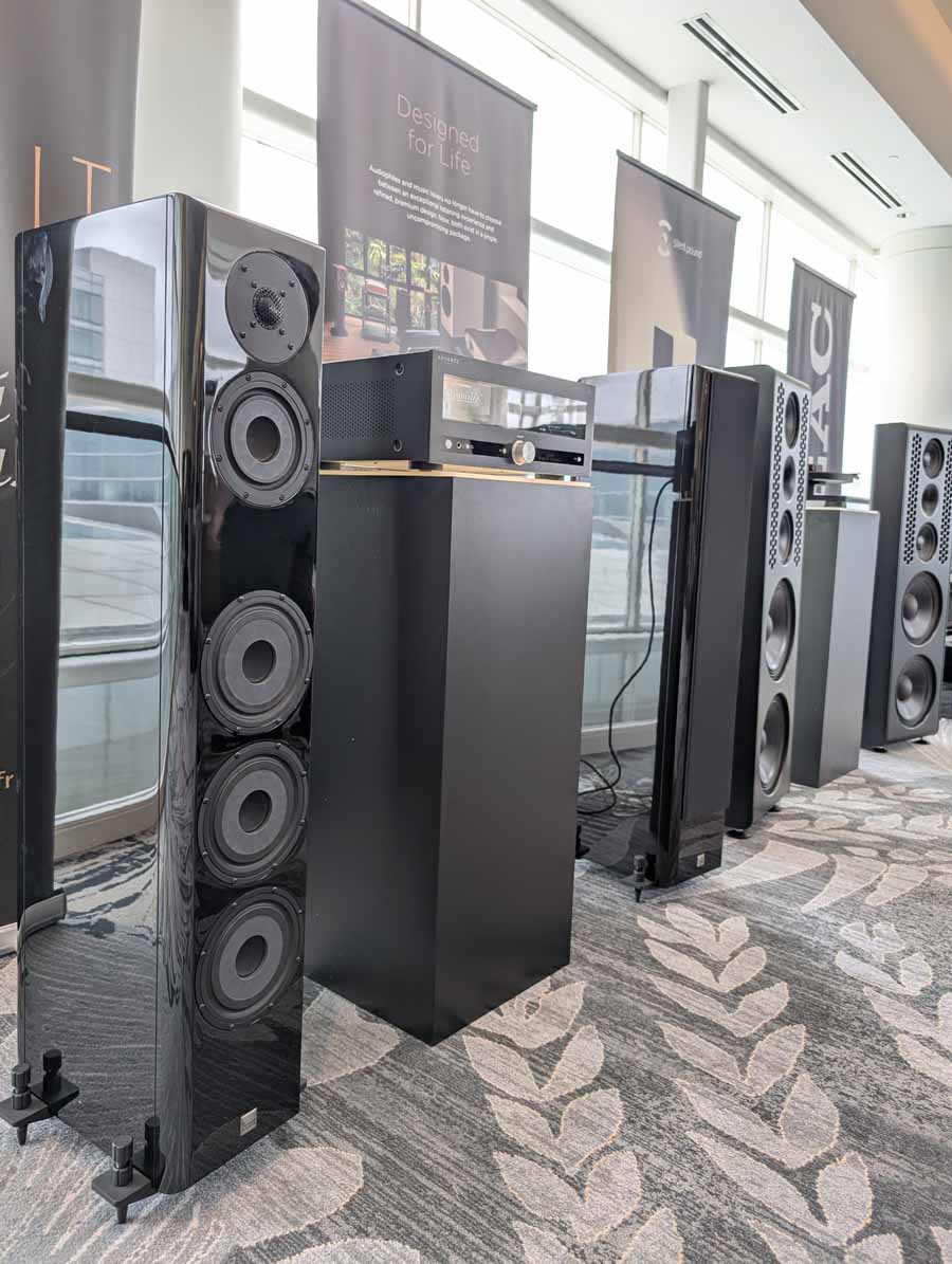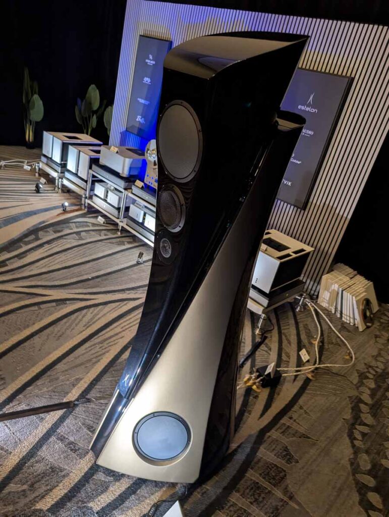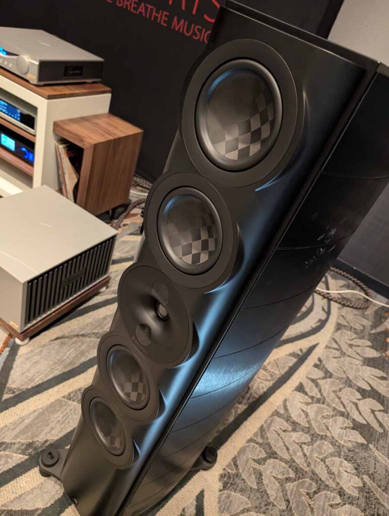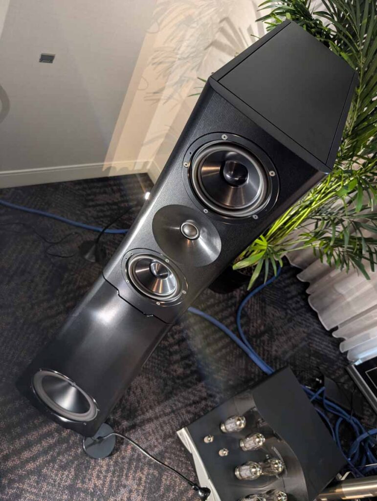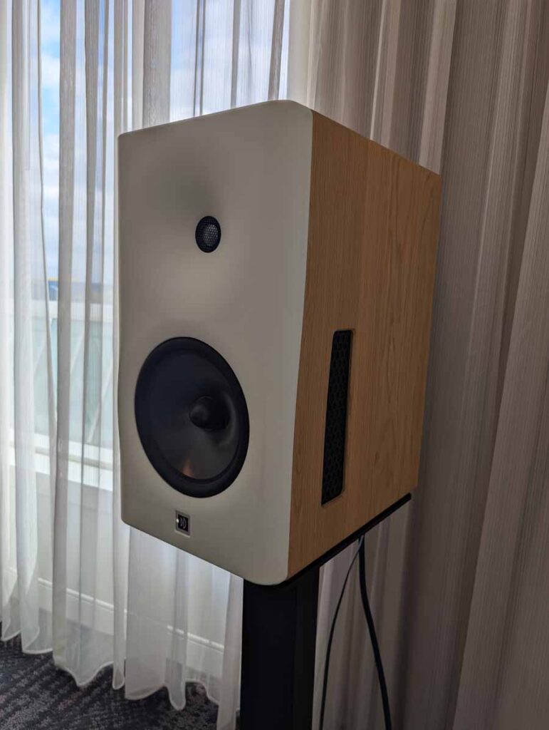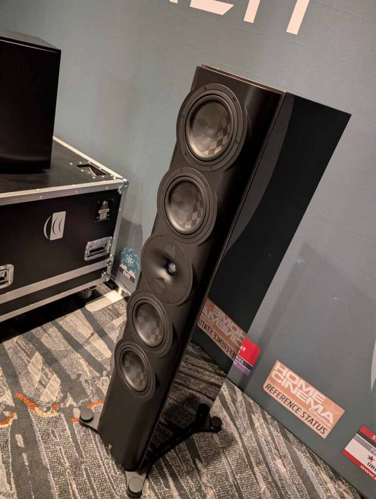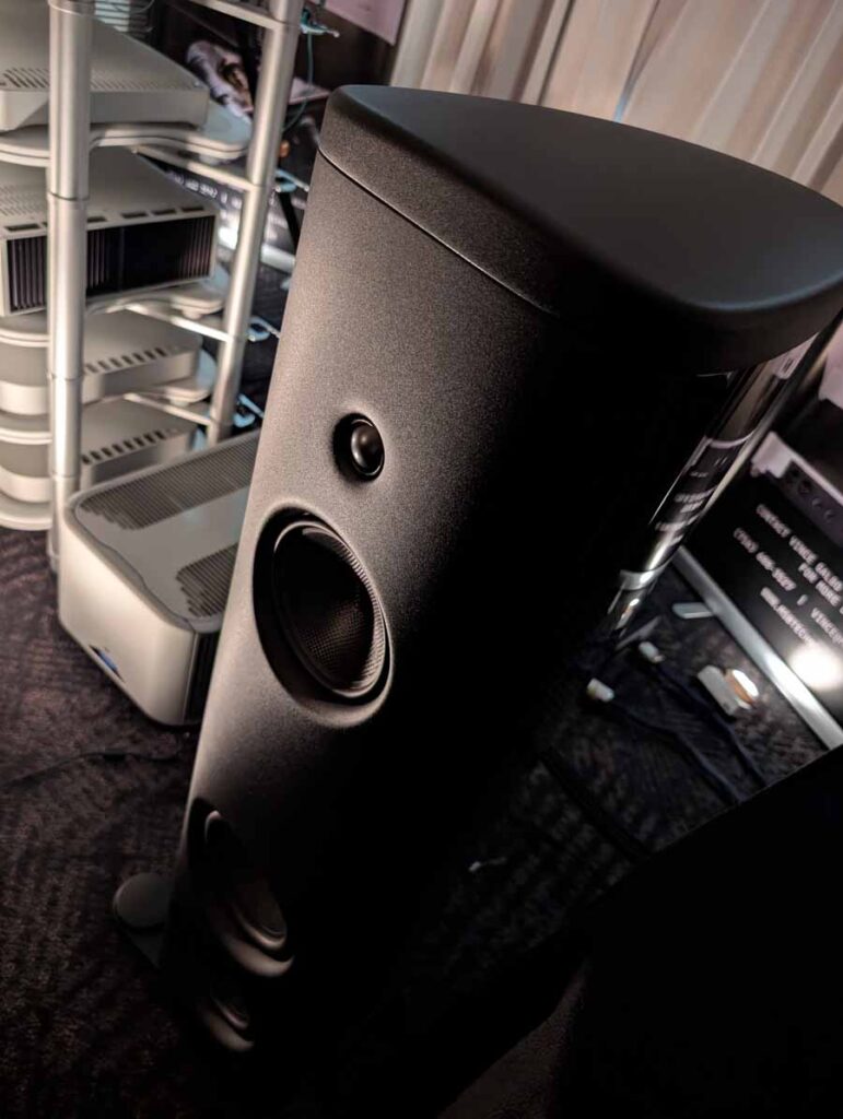 Dutch & Dutch showcased their 15C speakers in the lobby, featuring two massive 15-inch subwoofers, a 15-inch midrange driver, and a 15-inch waveguide for the tweeter. This all-in-one system includes internal DACs, DSP, and room-matching technology, alongside a powerful streaming core. I did ask how low these went in the lobby, and they can reach down to 10Hz – these are huge speakers and need room to breathe, easily filling the massive lobby area when cranked up a bit.