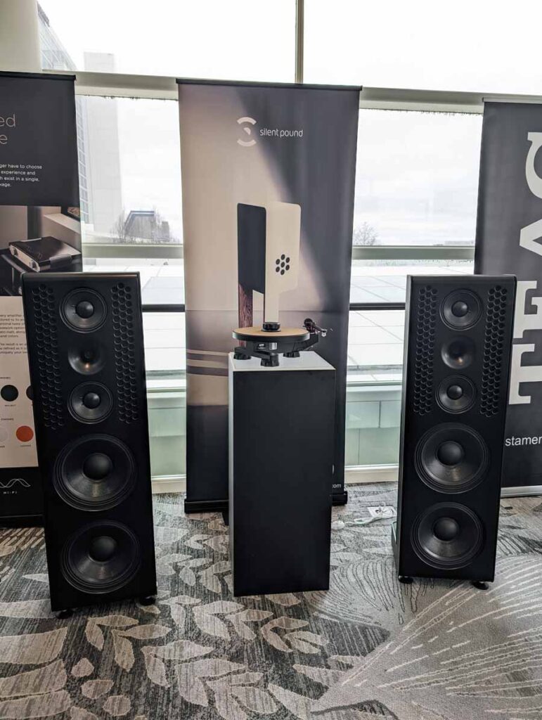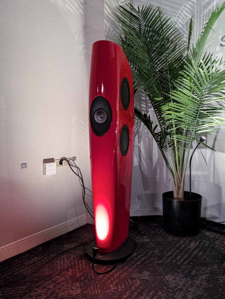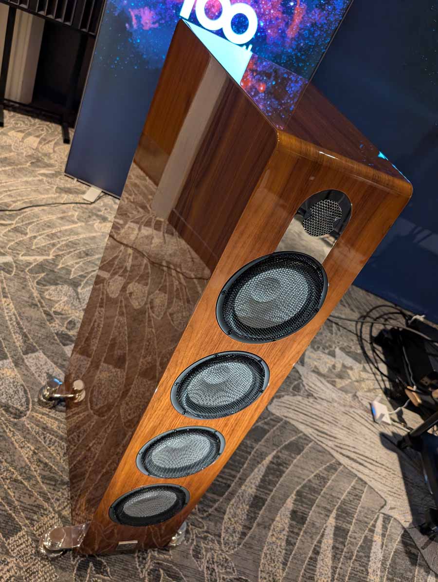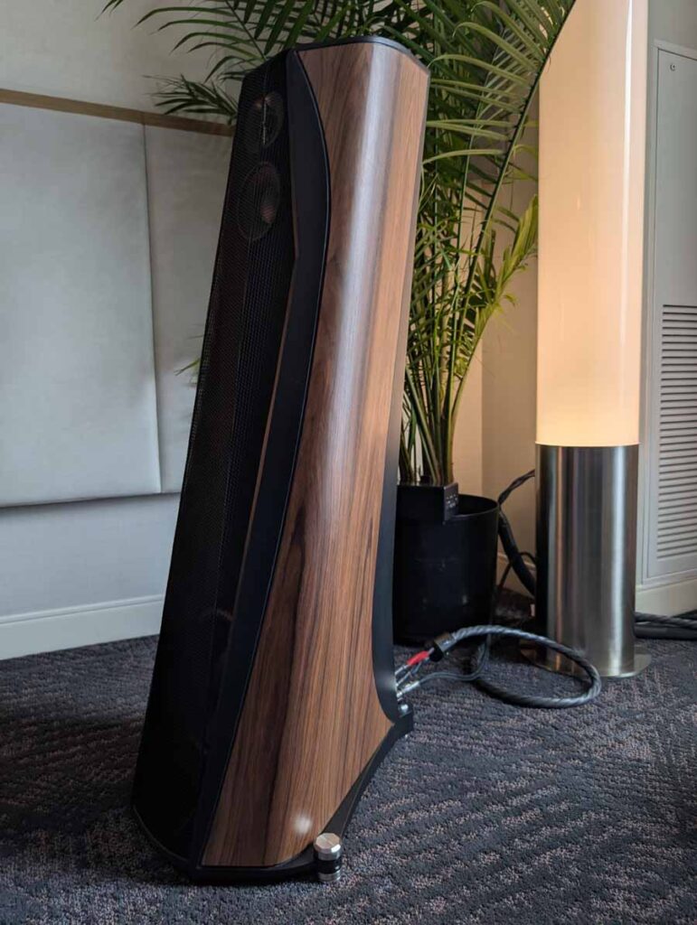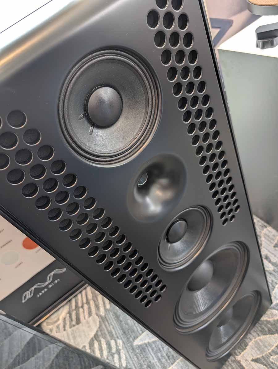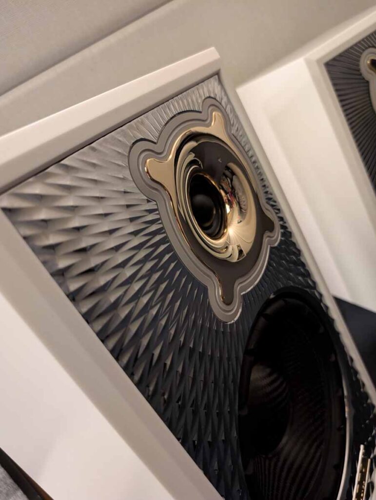 Dutch & Dutch showcased their 15C speakers in the lobby, featuring two massive 15-inch subwoofers, a 15-inch midrange driver, and a 15-inch waveguide for the tweeter. This all-in-one system includes internal DACs, DSP, and room-matching technology, alongside a powerful streaming core. I did ask how low these went in the lobby, and they can reach down to 10Hz – these are huge speakers and need room to breathe, easily filling the massive lobby area when cranked up a bit.