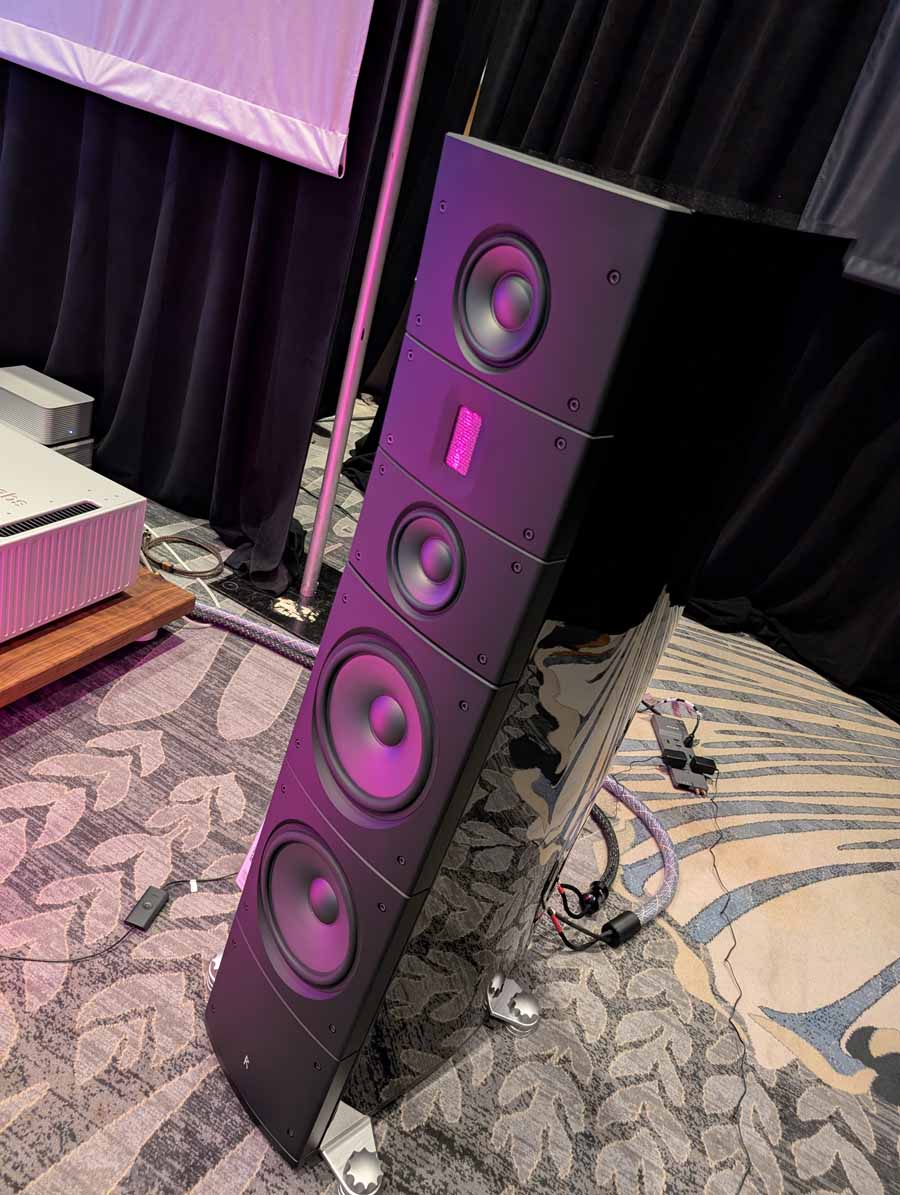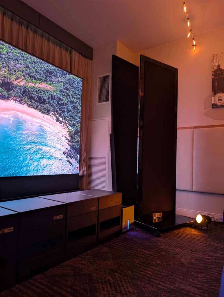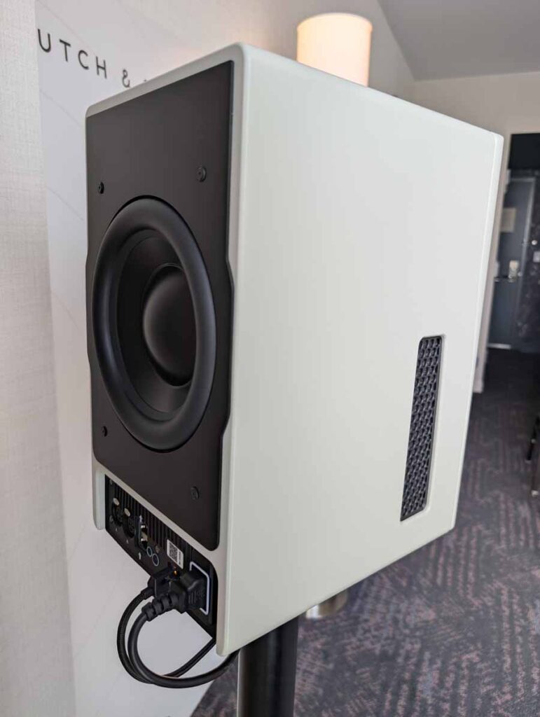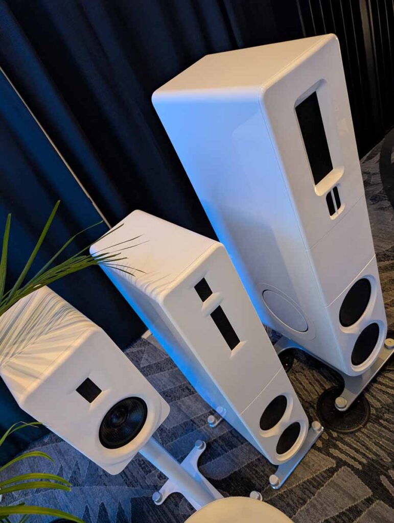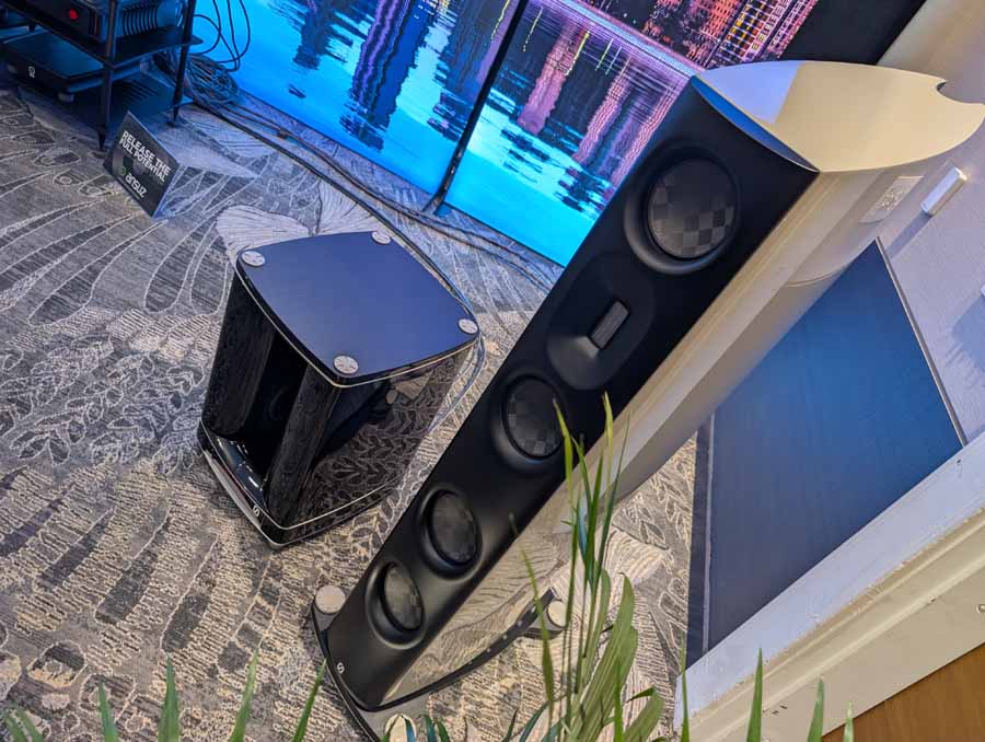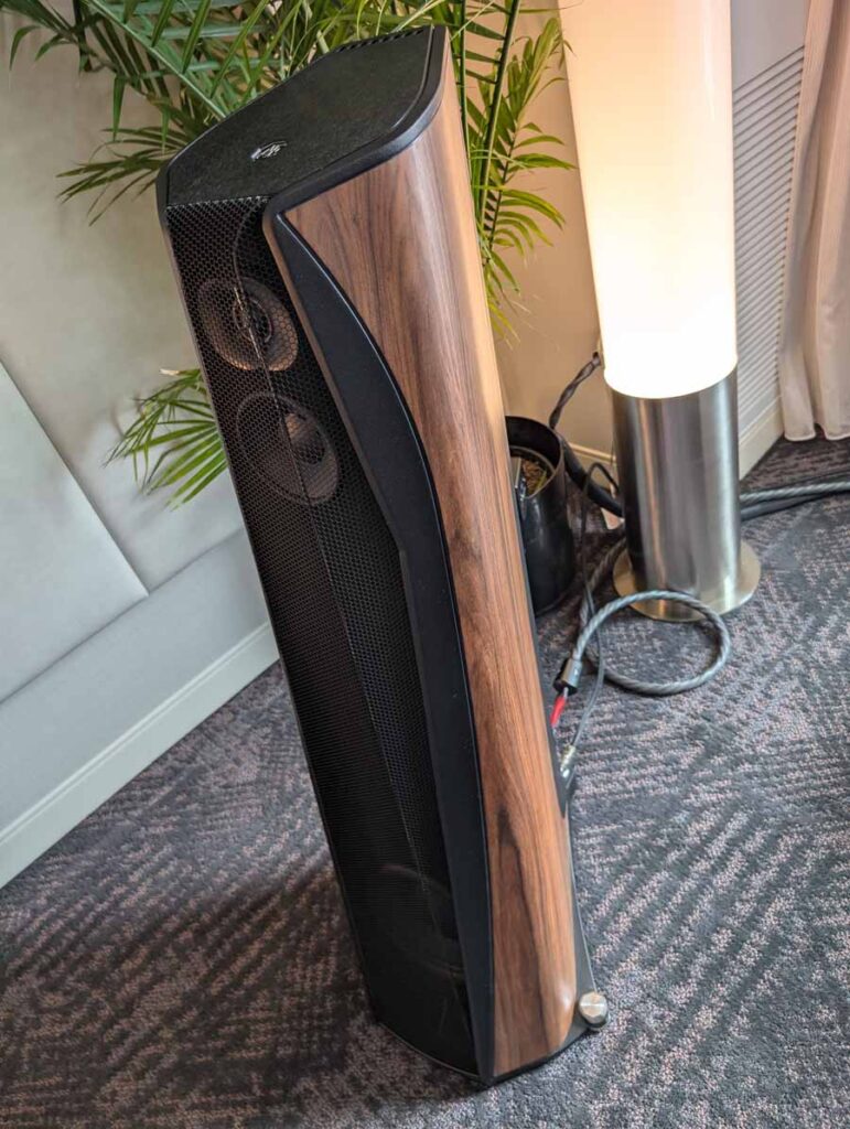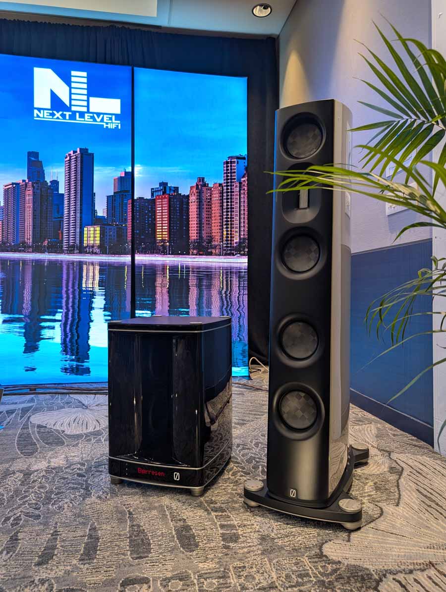 Dutch & Dutch showcased their 15C speakers in the lobby, featuring two massive 15-inch subwoofers, a 15-inch midrange driver, and a 15-inch waveguide for the tweeter. This all-in-one system includes internal DACs, DSP, and room-matching technology, alongside a powerful streaming core. I did ask how low these went in the lobby, and they can reach down to 10Hz – these are huge speakers and need room to breathe, easily filling the massive lobby area when cranked up a bit.