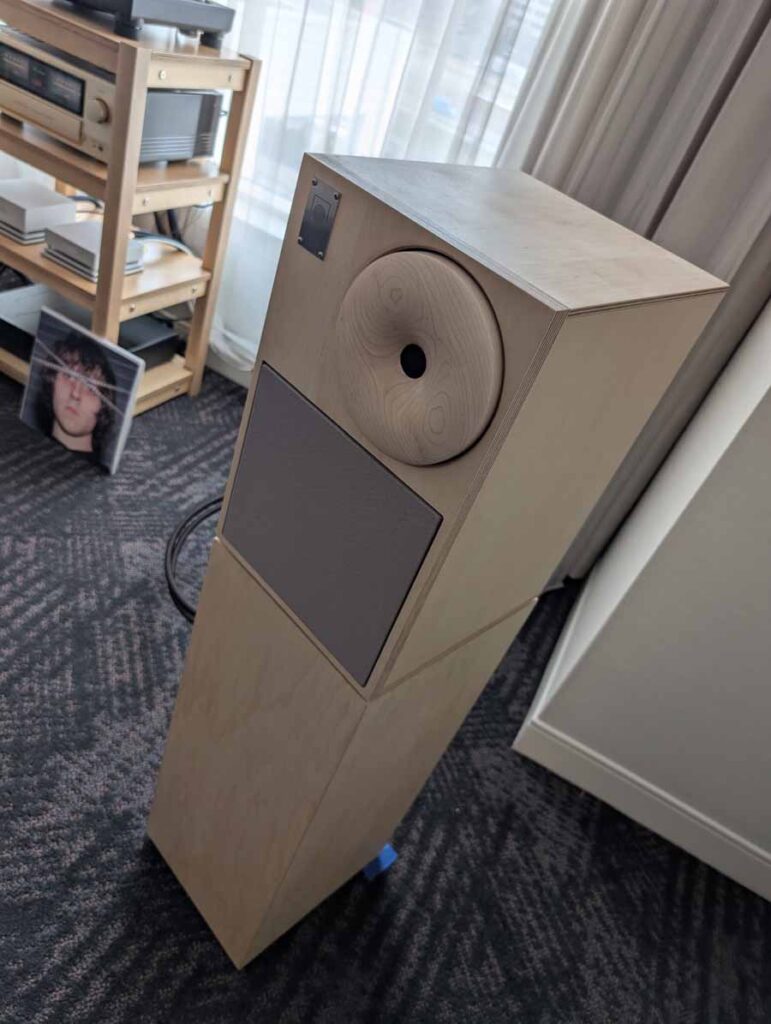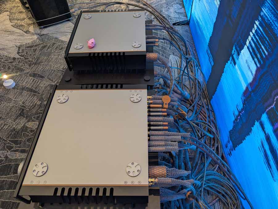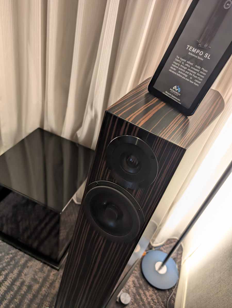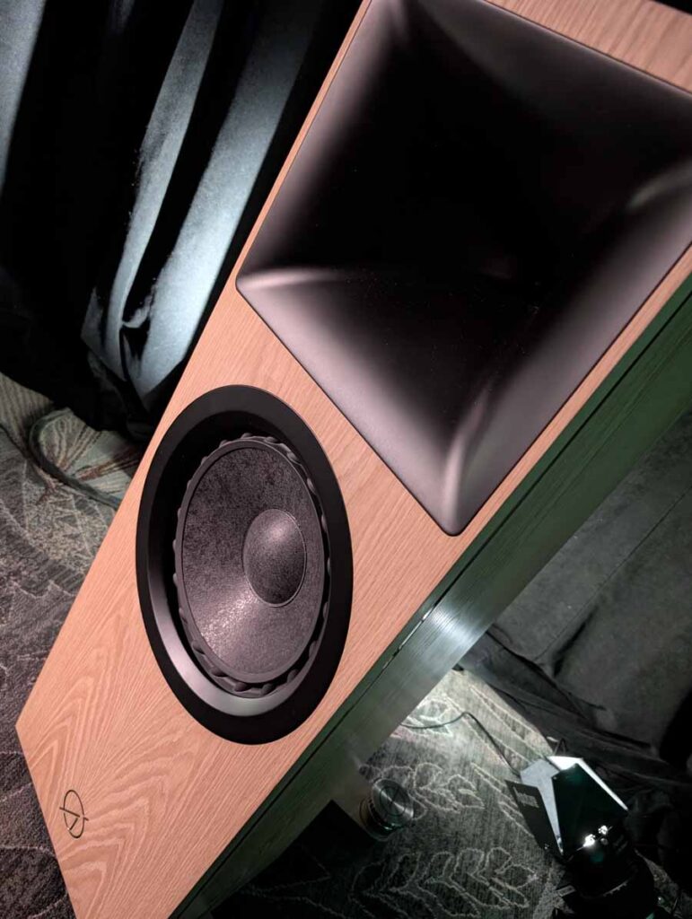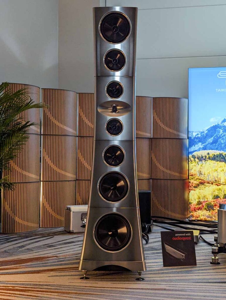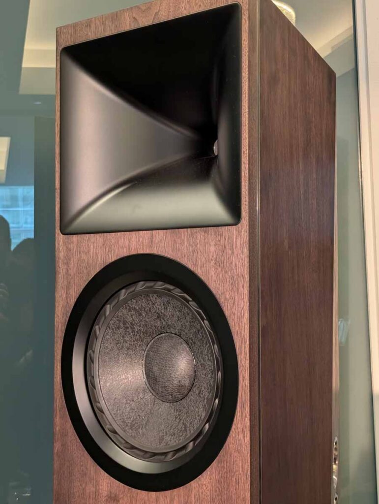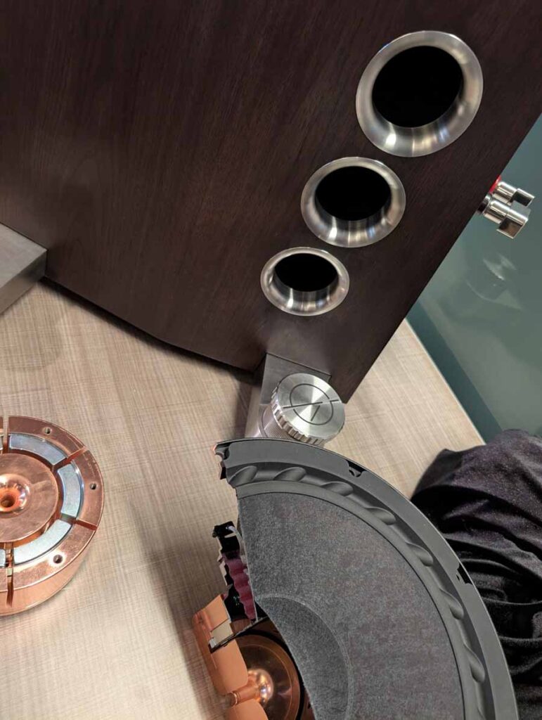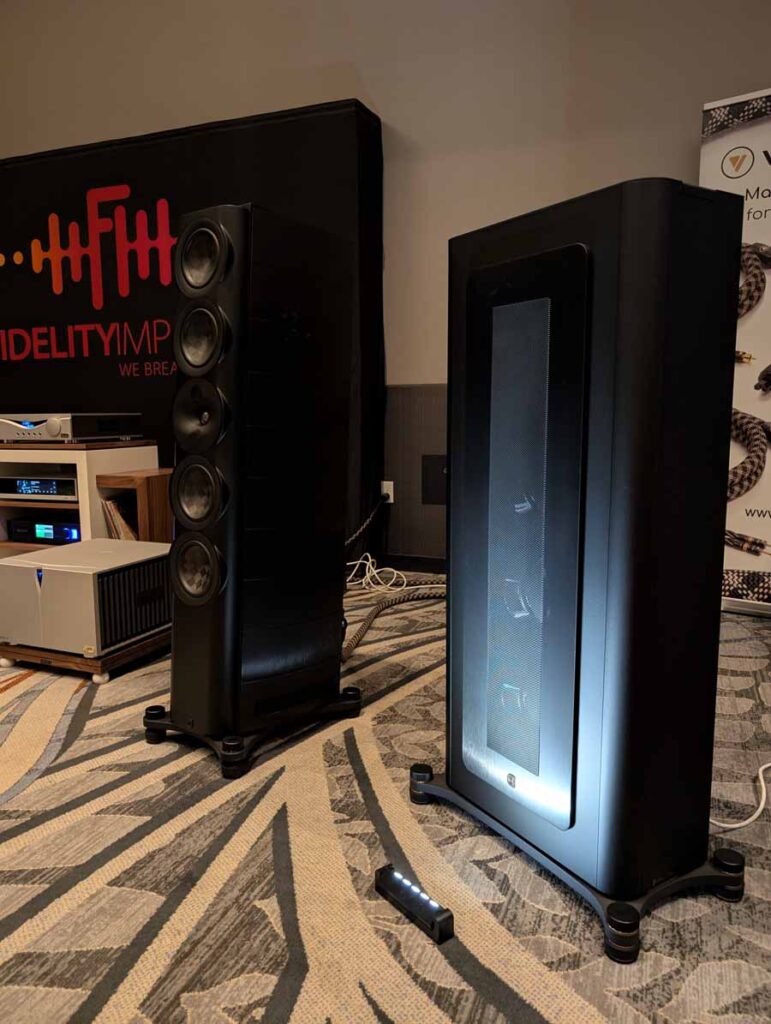 Dutch & Dutch showcased their 15C speakers in the lobby, featuring two massive 15-inch subwoofers, a 15-inch midrange driver, and a 15-inch waveguide for the tweeter. This all-in-one system includes internal DACs, DSP, and room-matching technology, alongside a powerful streaming core. I did ask how low these went in the lobby, and they can reach down to 10Hz – these are huge speakers and need room to breathe, easily filling the massive lobby area when cranked up a bit.