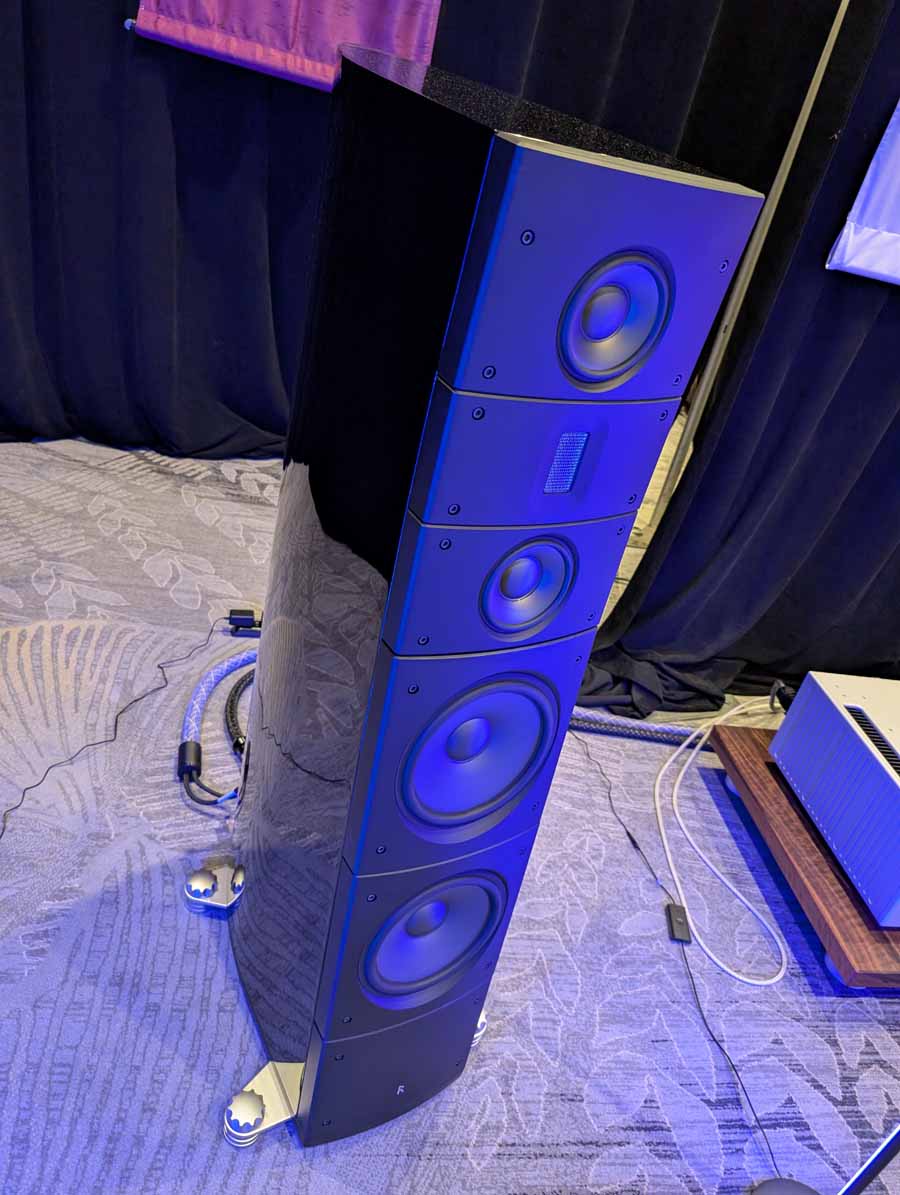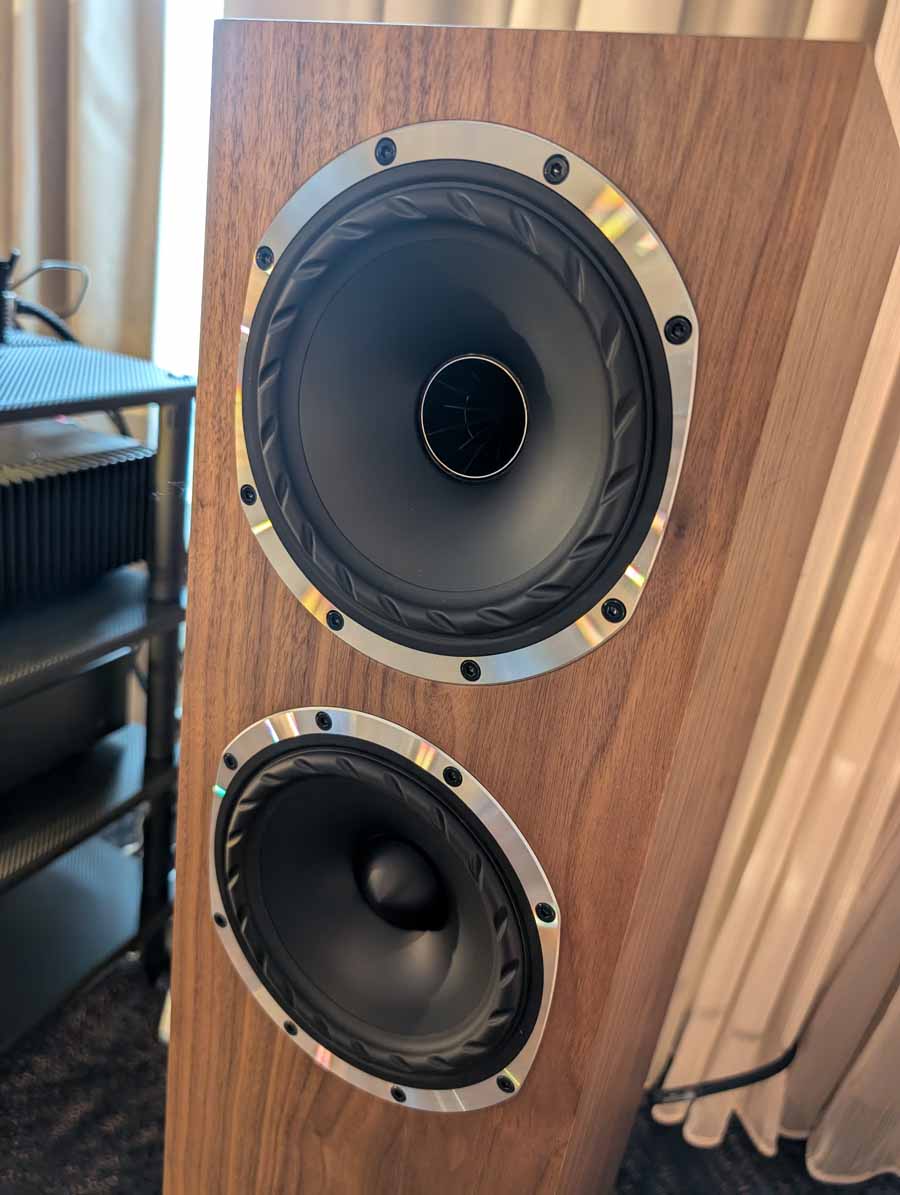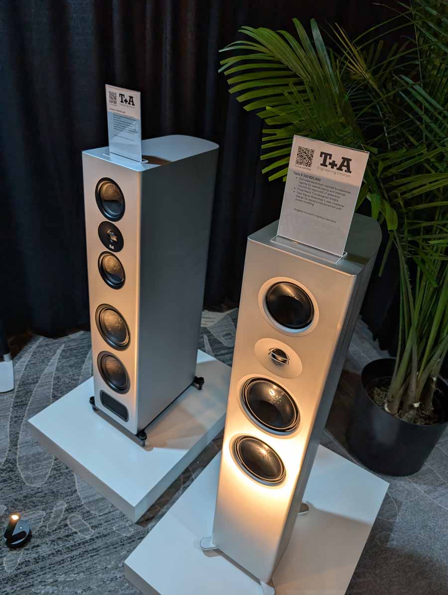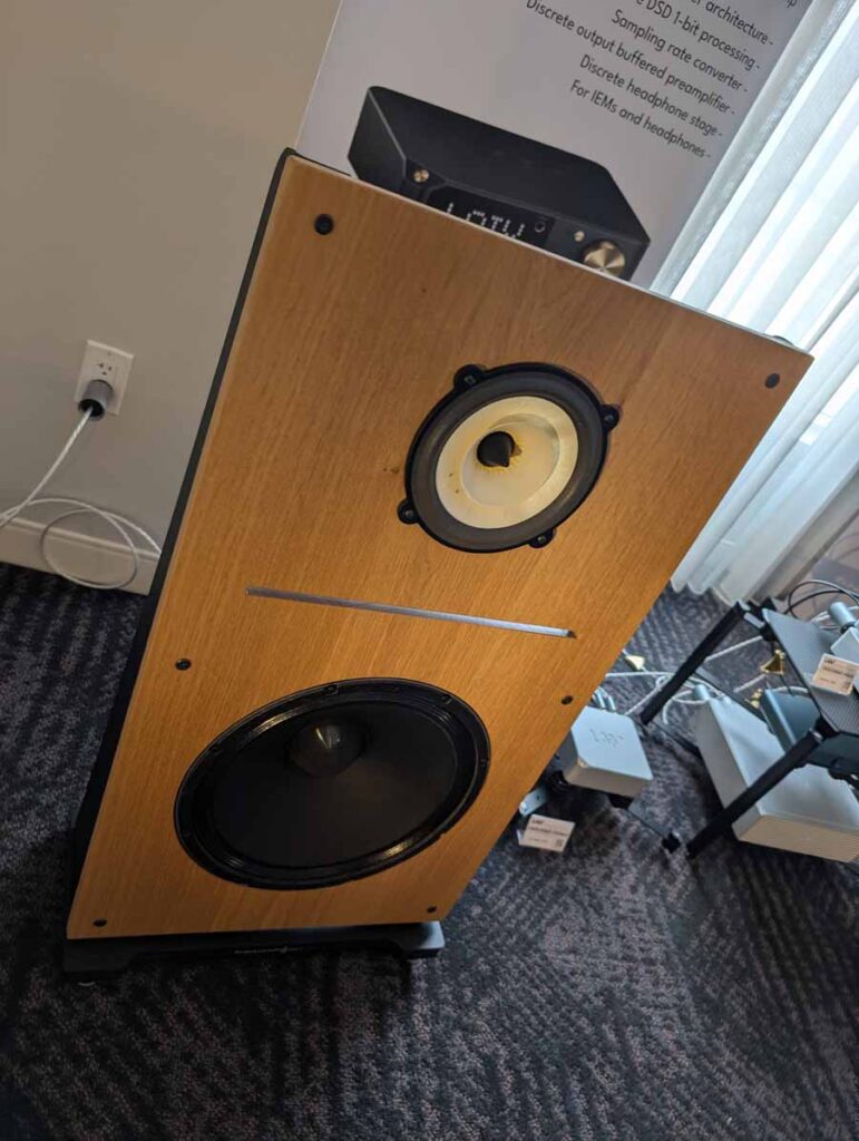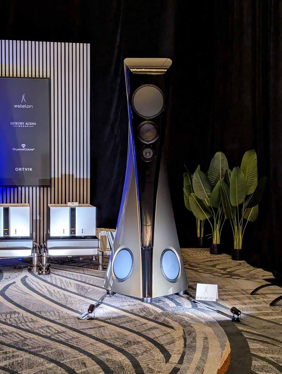 Dutch & Dutch showcased their 15C speakers in the lobby, featuring two massive 15-inch subwoofers, a 15-inch midrange driver, and a 15-inch waveguide for the tweeter. This all-in-one system includes internal DACs, DSP, and room-matching technology, alongside a powerful streaming core. I did ask how low these went in the lobby, and they can reach down to 10Hz – these are huge speakers and need room to breathe, easily filling the massive lobby area when cranked up a bit.
