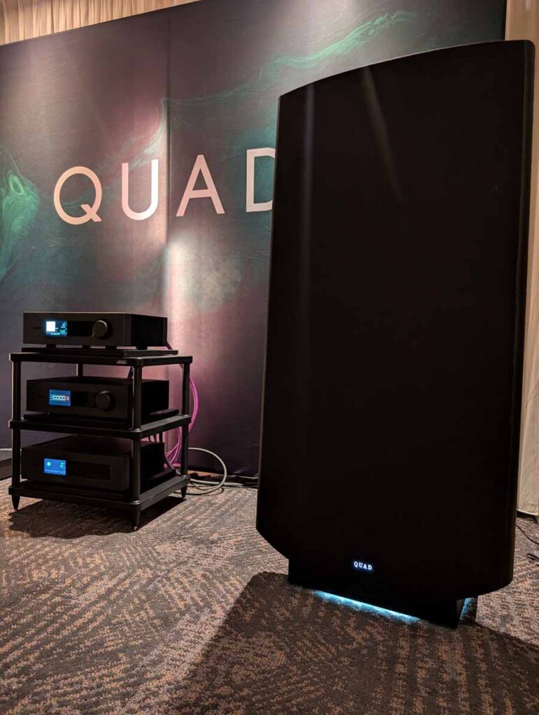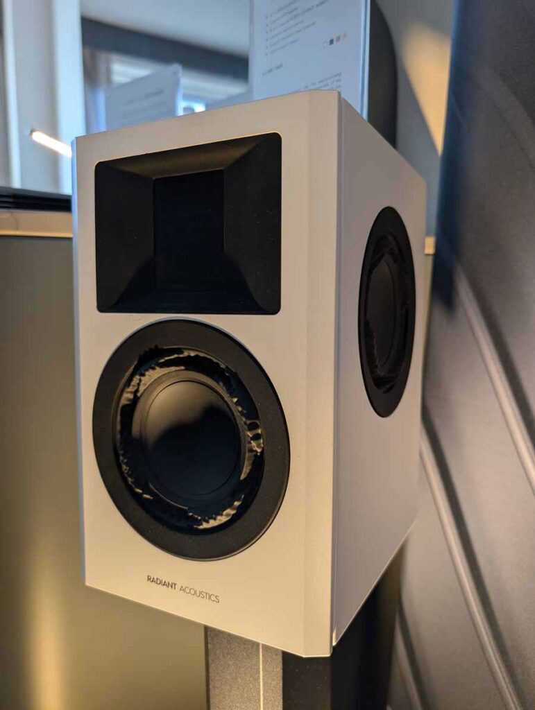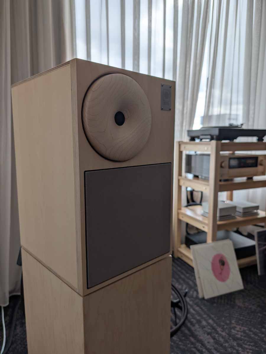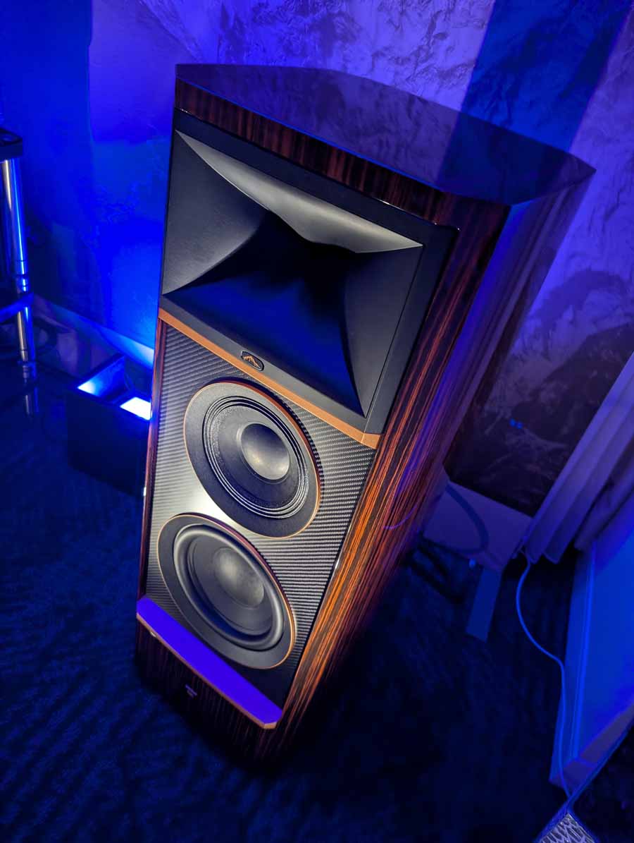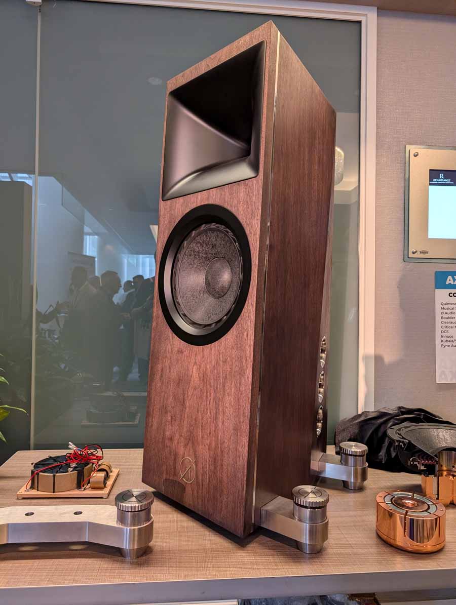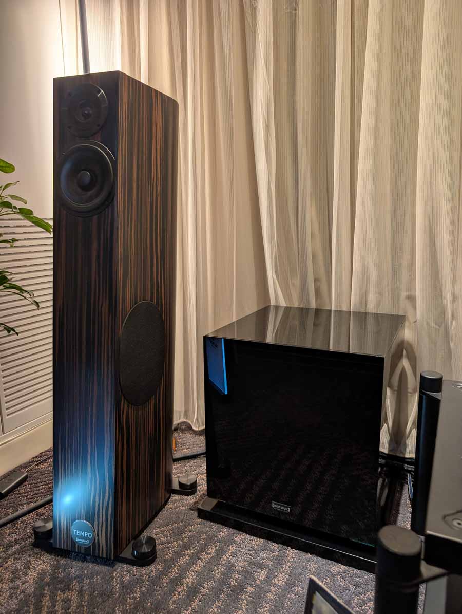 Dutch & Dutch showcased their 15C speakers in the lobby, featuring two massive 15-inch subwoofers, a 15-inch midrange driver, and a 15-inch waveguide for the tweeter. This all-in-one system includes internal DACs, DSP, and room-matching technology, alongside a powerful streaming core. I did ask how low these went in the lobby, and they can reach down to 10Hz – these are huge speakers and need room to breathe, easily filling the massive lobby area when cranked up a bit.