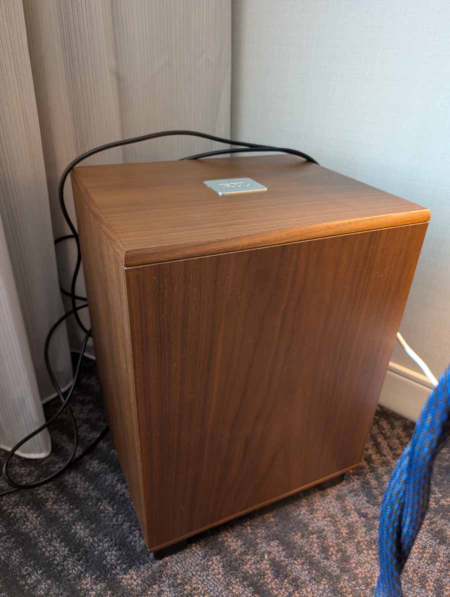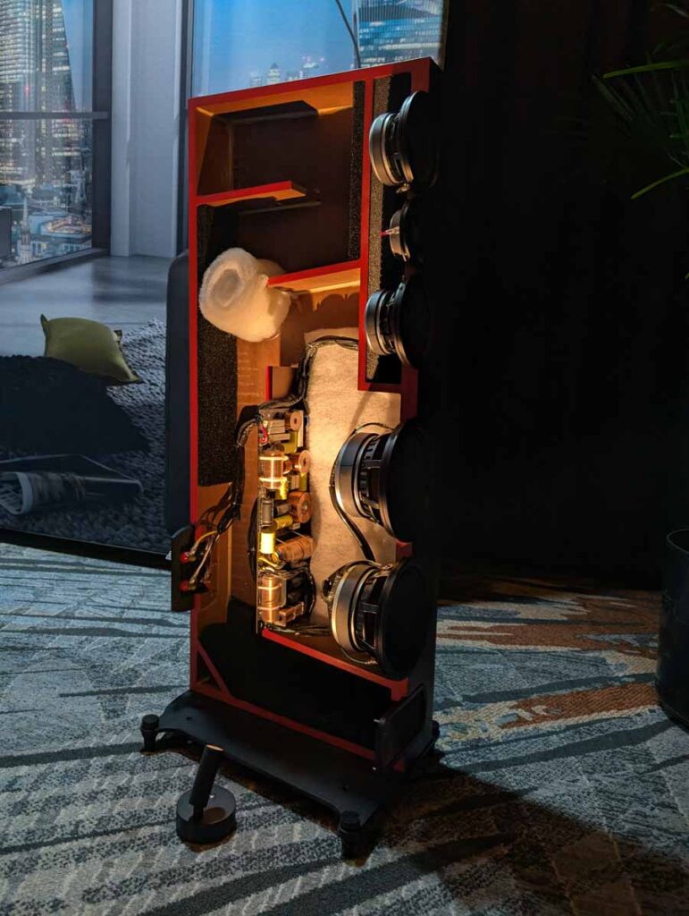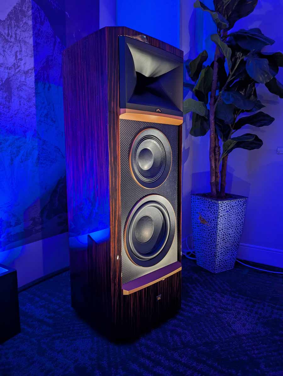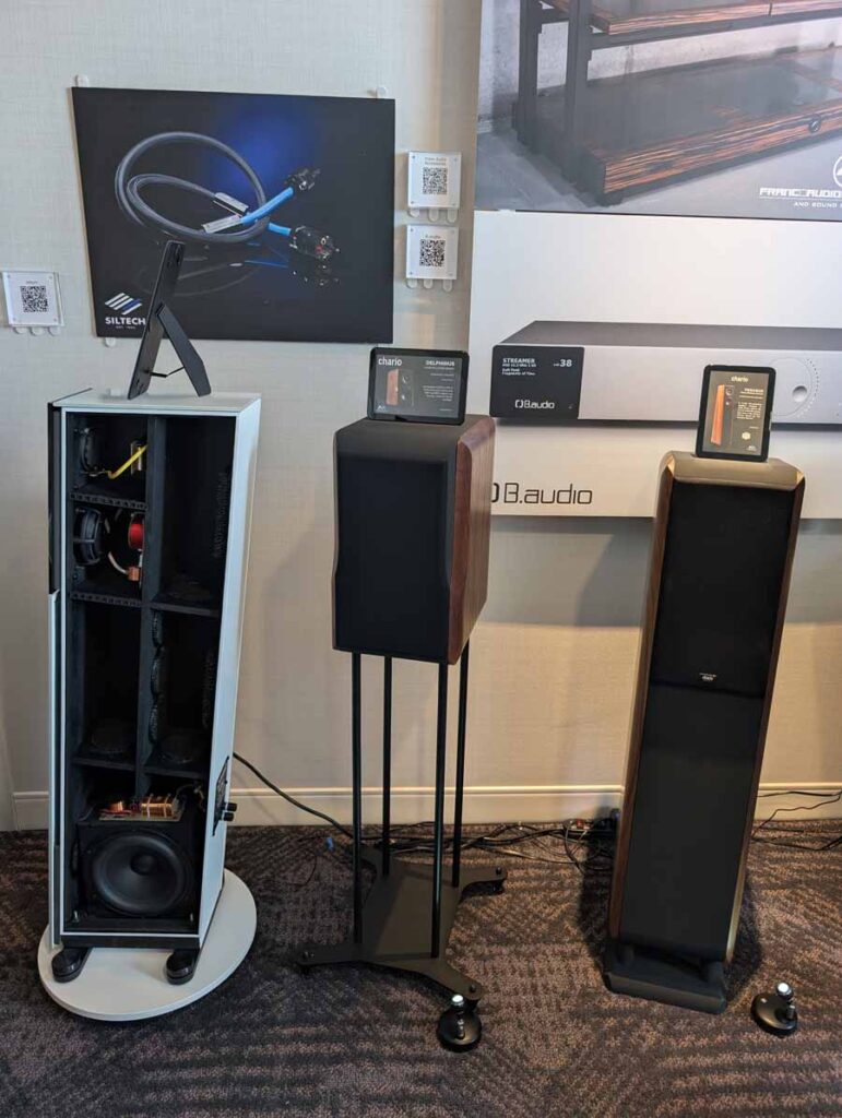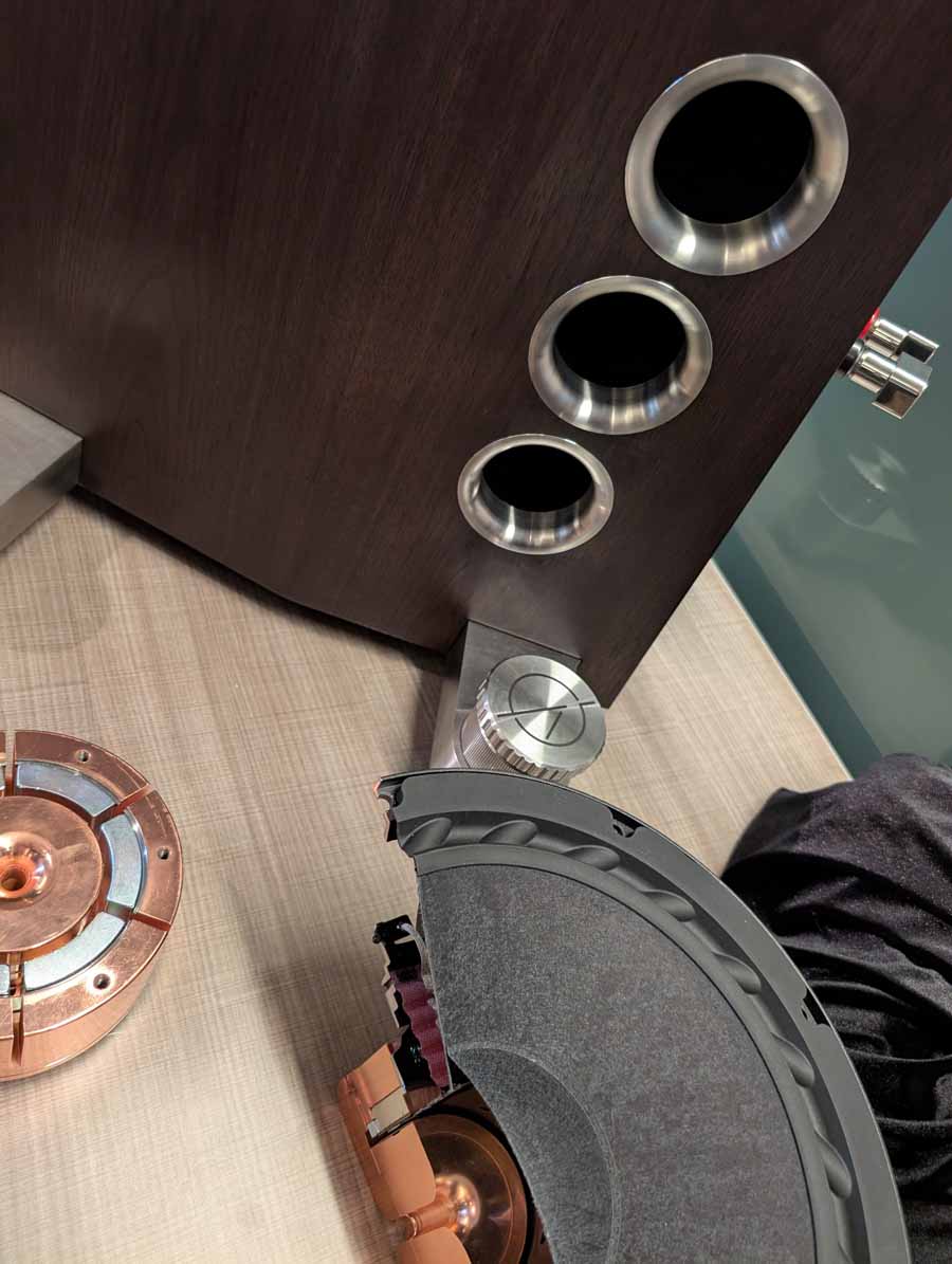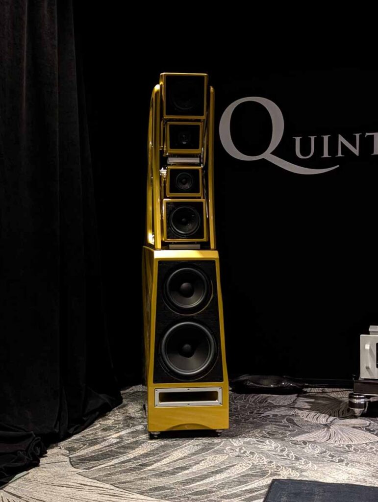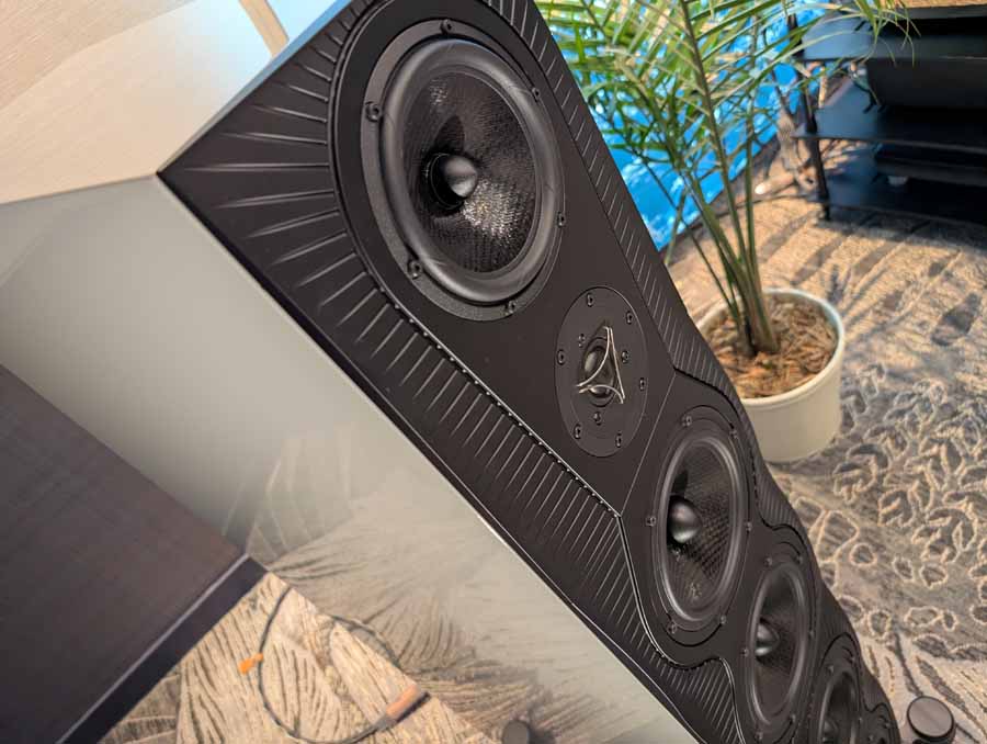 Dutch & Dutch showcased their 15C speakers in the lobby, featuring two massive 15-inch subwoofers, a 15-inch midrange driver, and a 15-inch waveguide for the tweeter. This all-in-one system includes internal DACs, DSP, and room-matching technology, alongside a powerful streaming core. I did ask how low these went in the lobby, and they can reach down to 10Hz – these are huge speakers and need room to breathe, easily filling the massive lobby area when cranked up a bit.