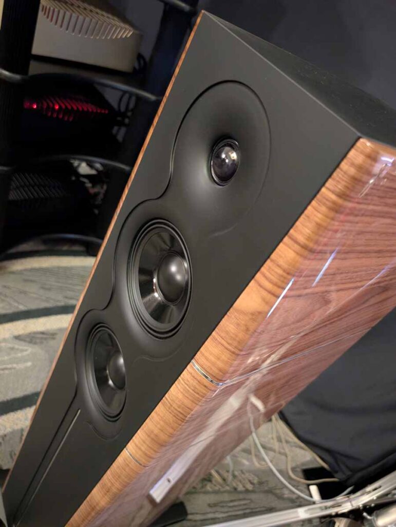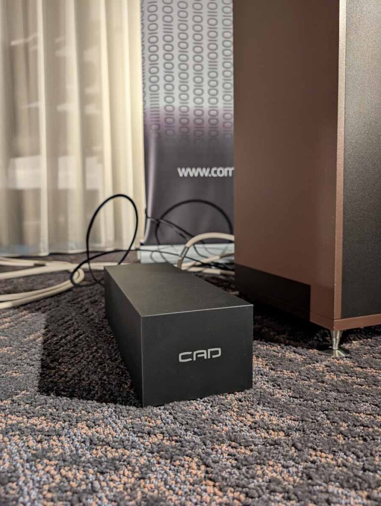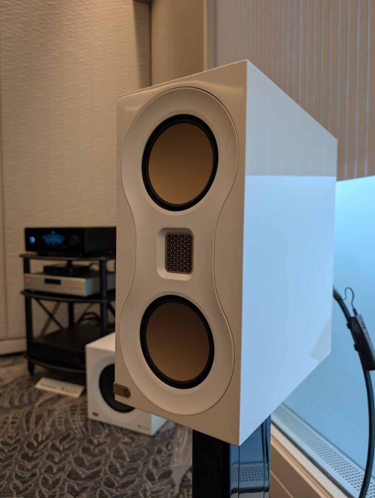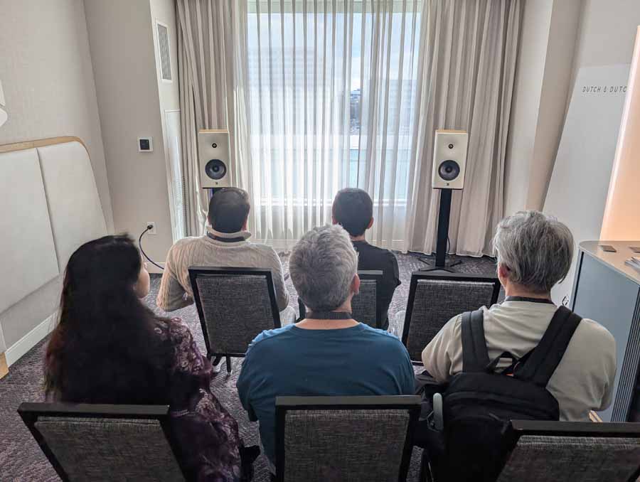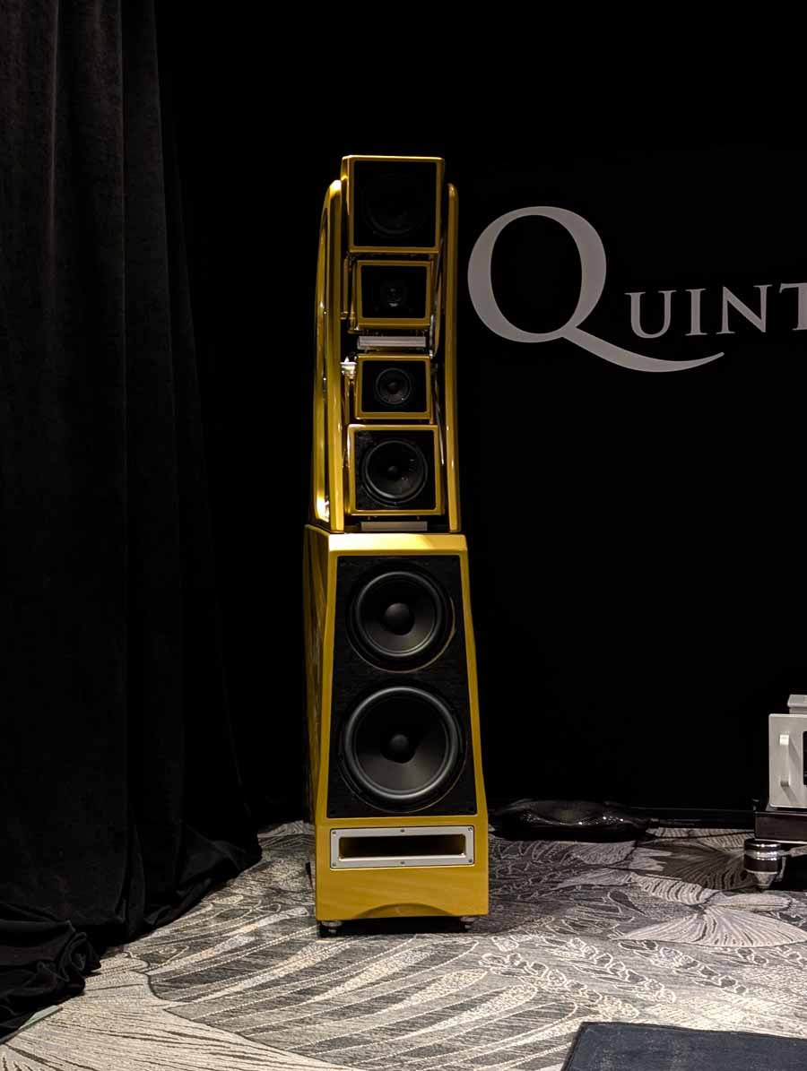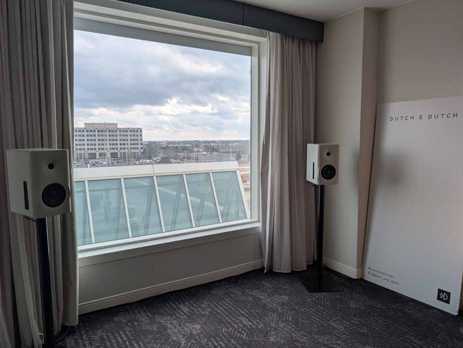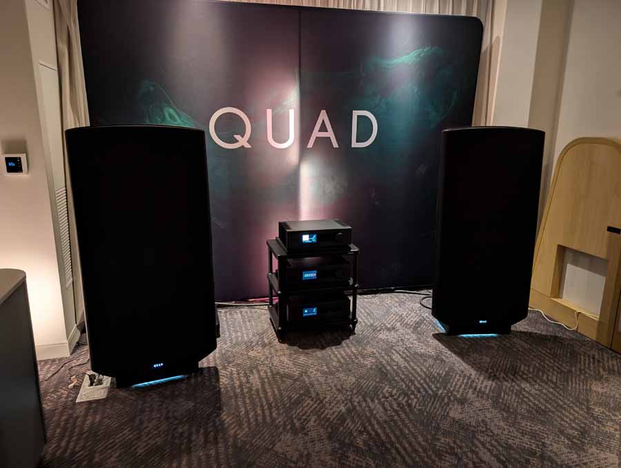 Dutch & Dutch showcased their 15C speakers in the lobby, featuring two massive 15-inch subwoofers, a 15-inch midrange driver, and a 15-inch waveguide for the tweeter. This all-in-one system includes internal DACs, DSP, and room-matching technology, alongside a powerful streaming core. I did ask how low these went in the lobby, and they can reach down to 10Hz – these are huge speakers and need room to breathe, easily filling the massive lobby area when cranked up a bit.