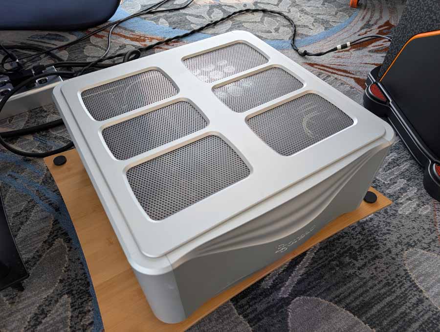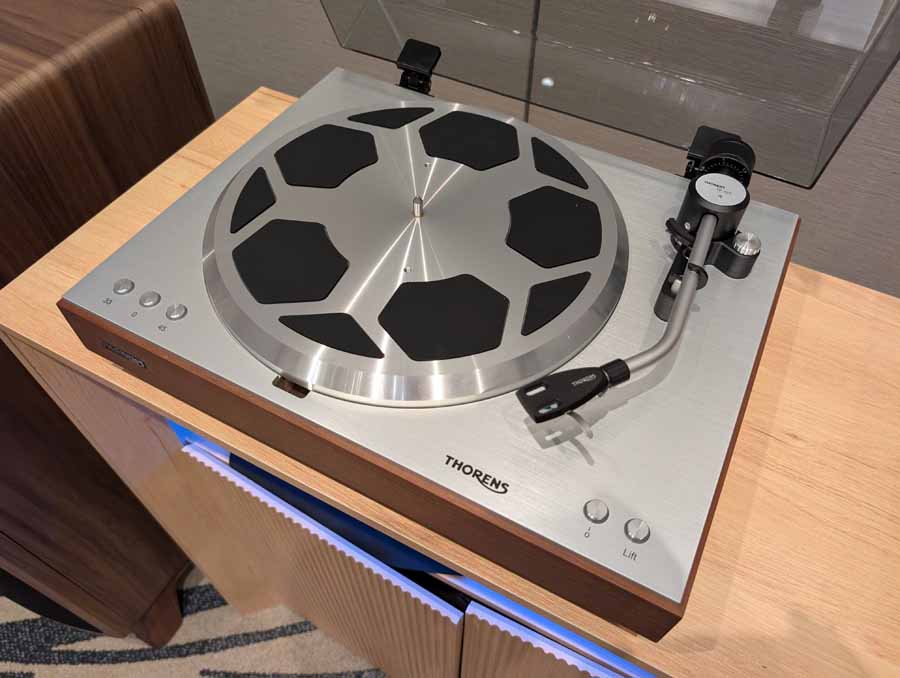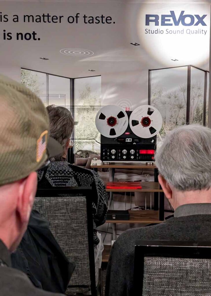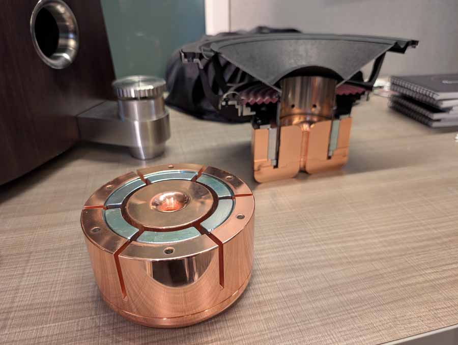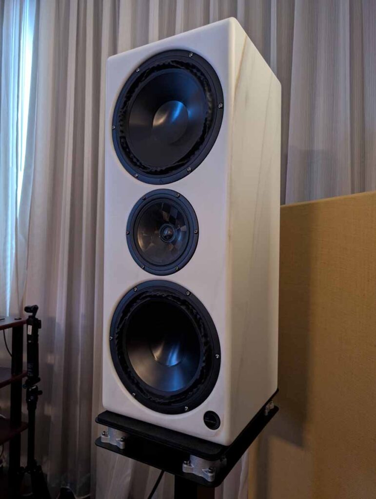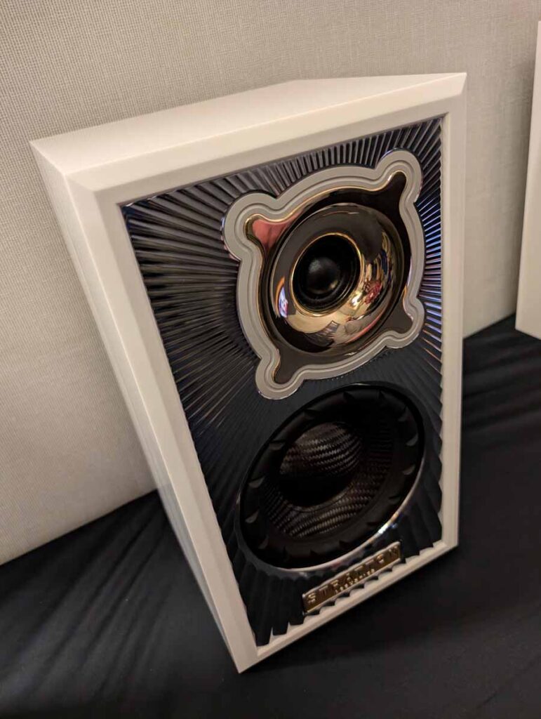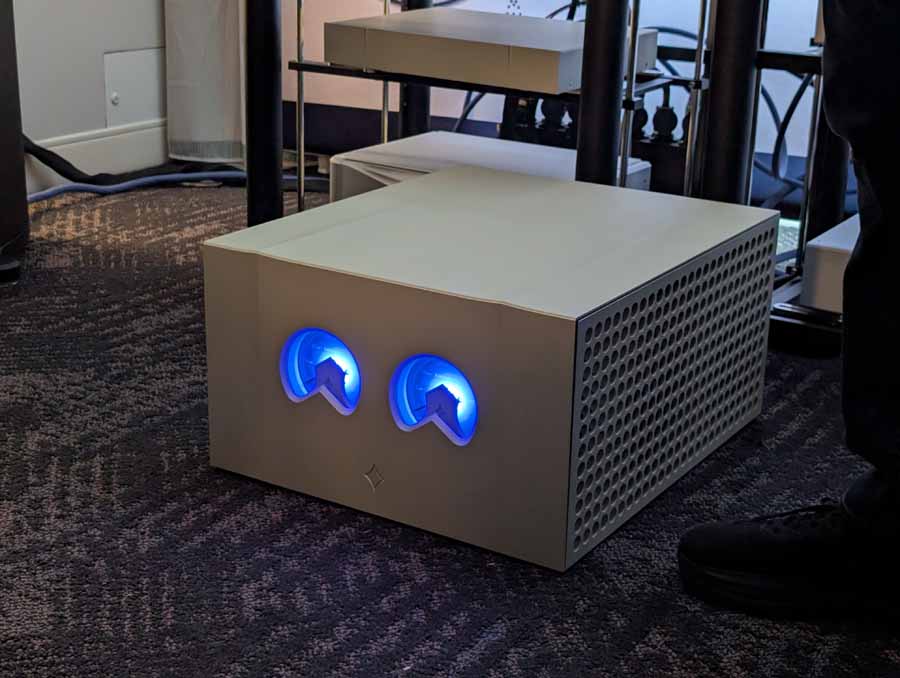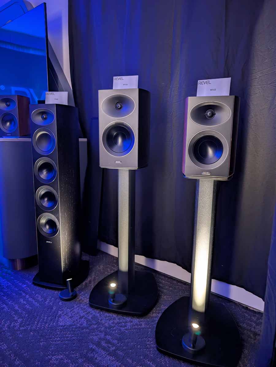 Dutch & Dutch showcased their 15C speakers in the lobby, featuring two massive 15-inch subwoofers, a 15-inch midrange driver, and a 15-inch waveguide for the tweeter. This all-in-one system includes internal DACs, DSP, and room-matching technology, alongside a powerful streaming core. I did ask how low these went in the lobby, and they can reach down to 10Hz – these are huge speakers and need room to breathe, easily filling the massive lobby area when cranked up a bit.