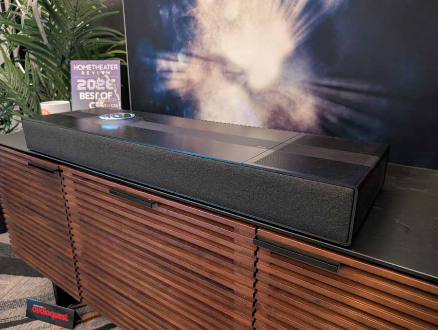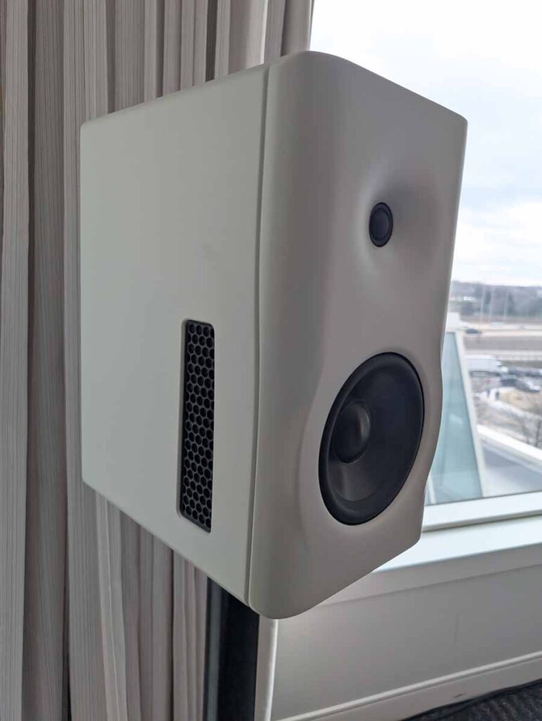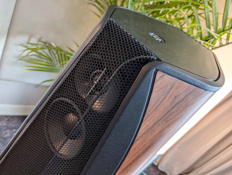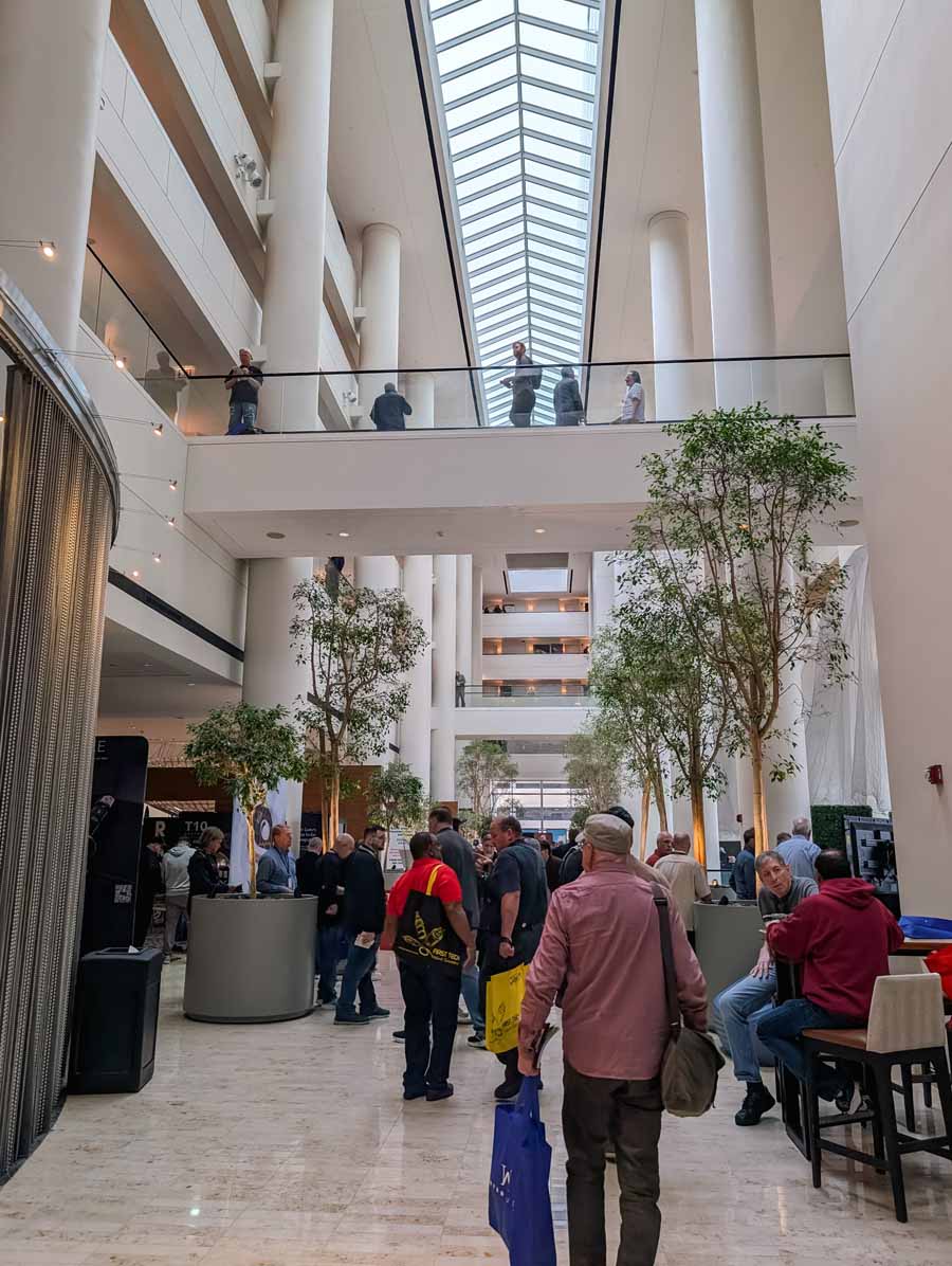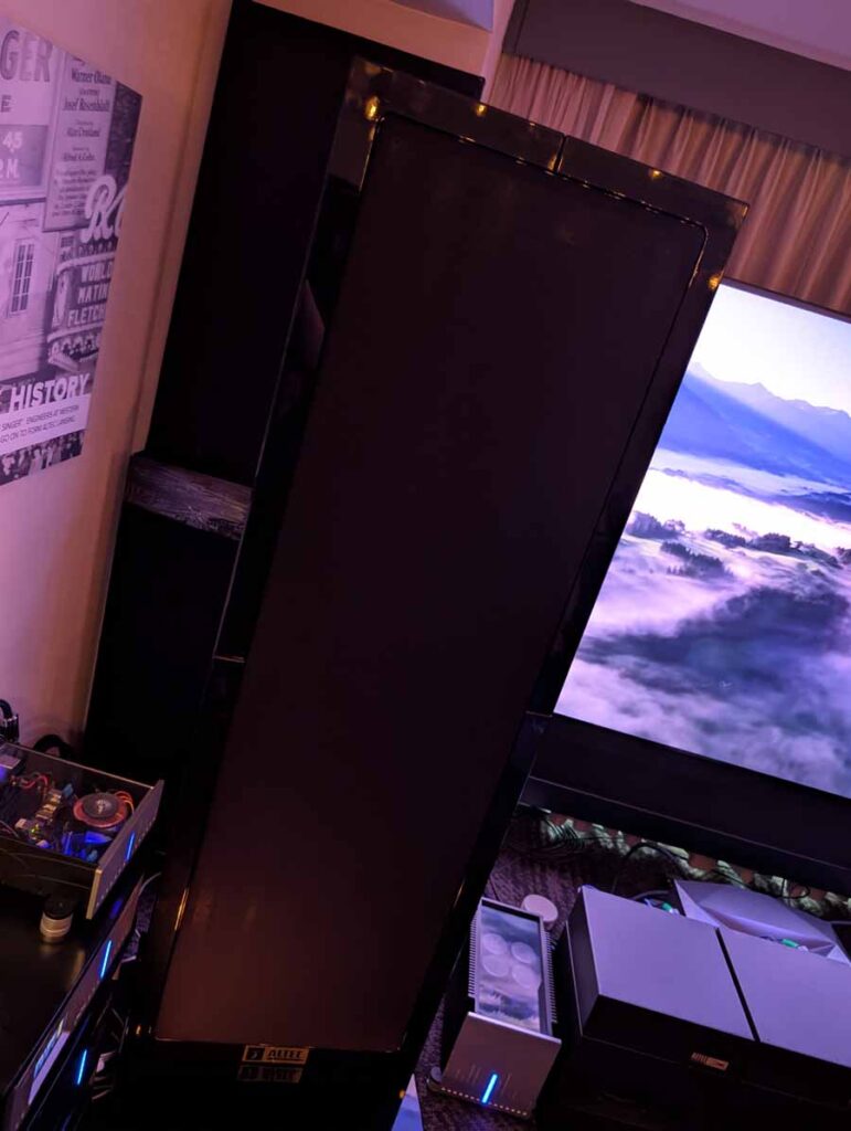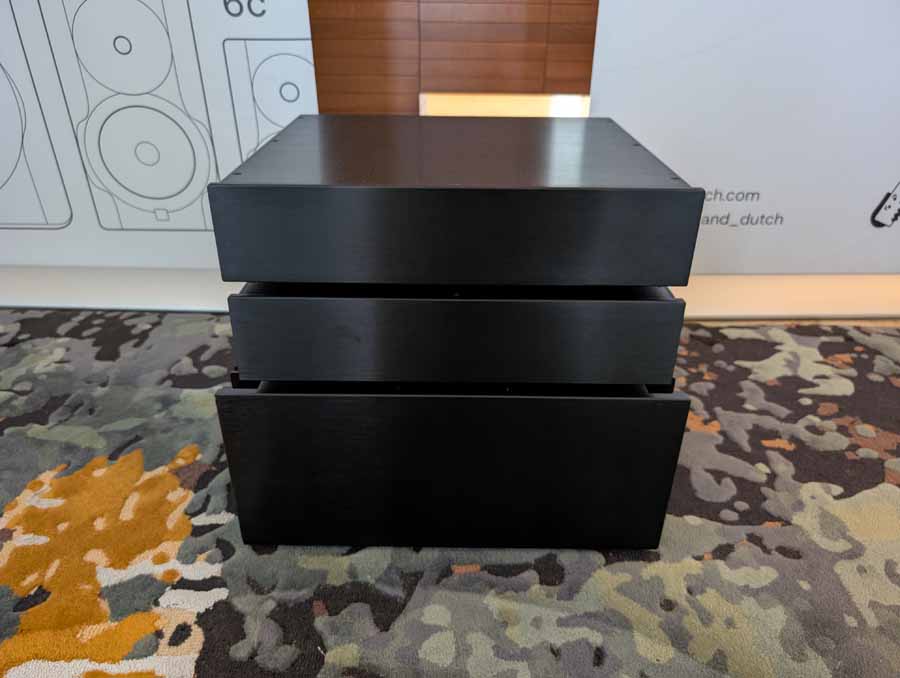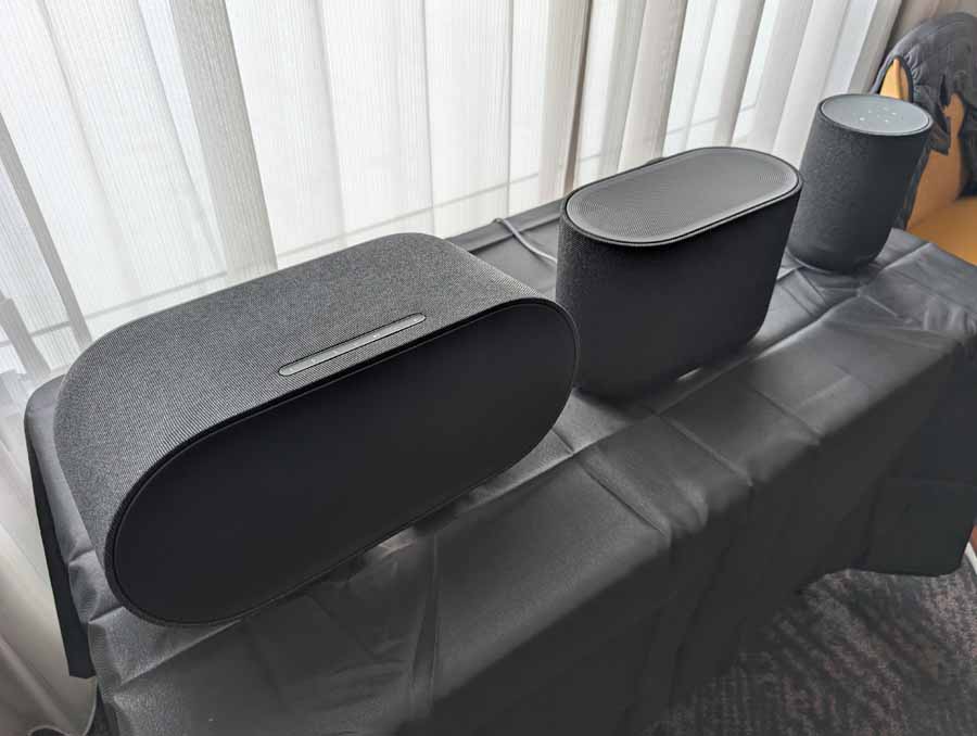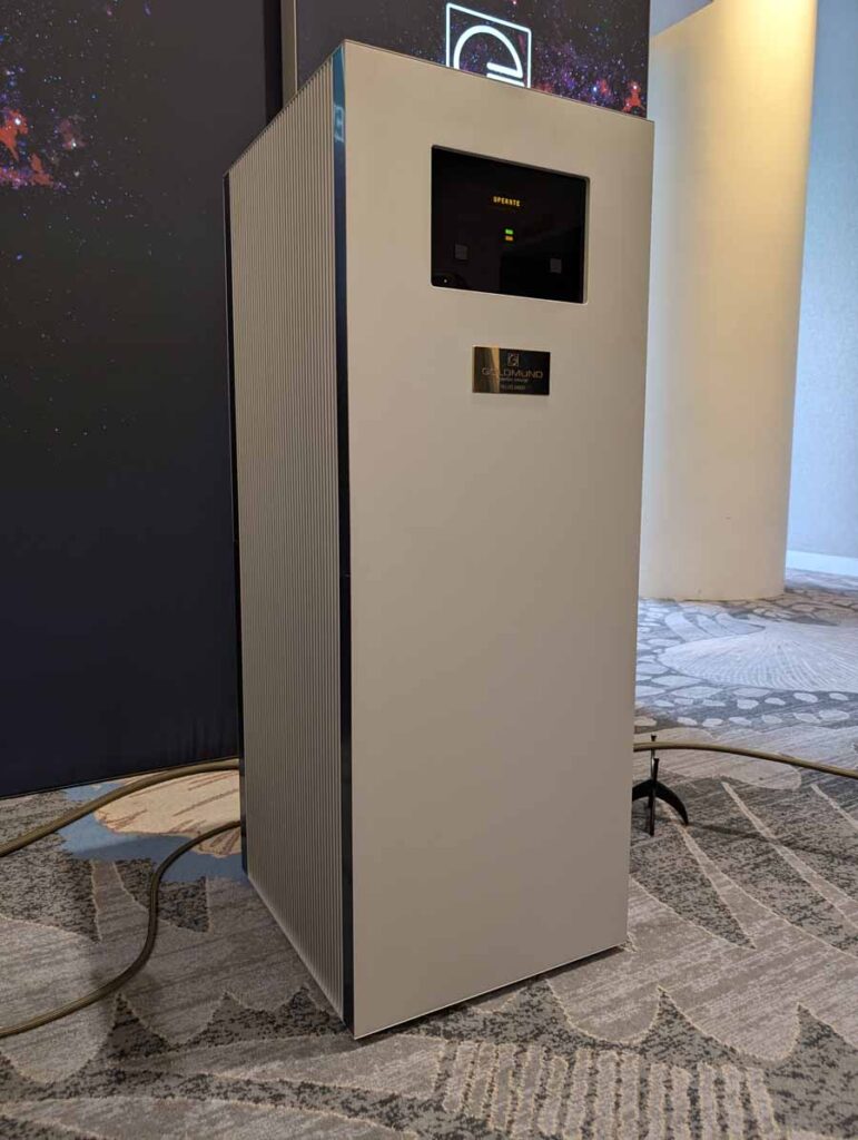 Dutch & Dutch showcased their 15C speakers in the lobby, featuring two massive 15-inch subwoofers, a 15-inch midrange driver, and a 15-inch waveguide for the tweeter. This all-in-one system includes internal DACs, DSP, and room-matching technology, alongside a powerful streaming core. I did ask how low these went in the lobby, and they can reach down to 10Hz – these are huge speakers and need room to breathe, easily filling the massive lobby area when cranked up a bit.