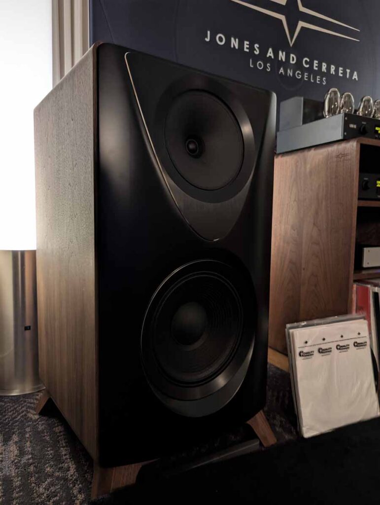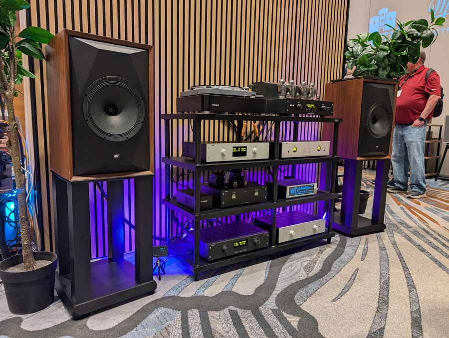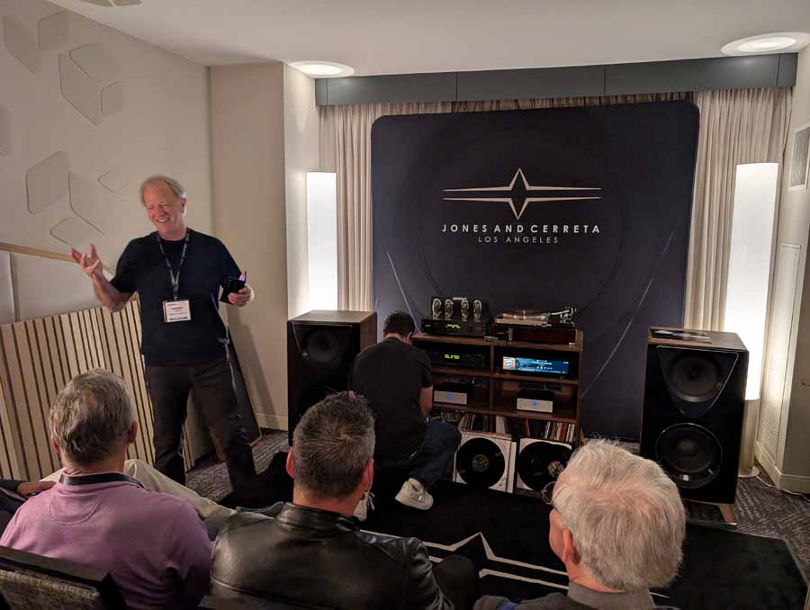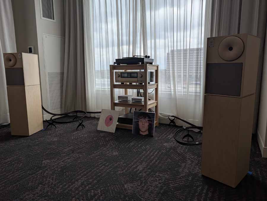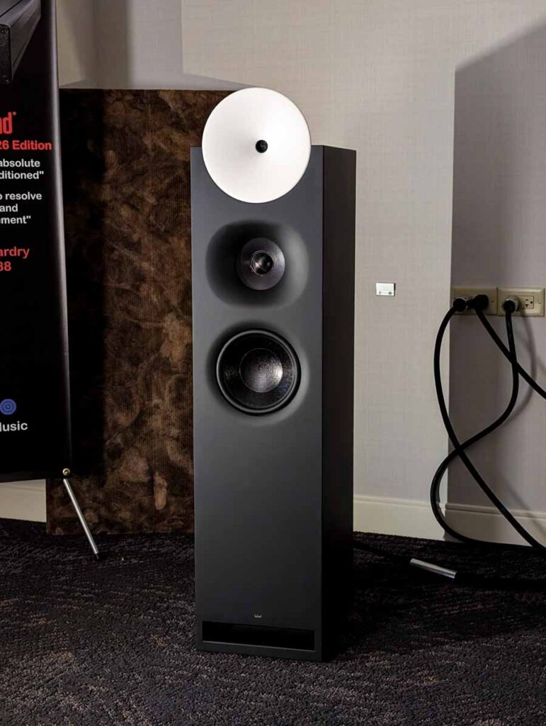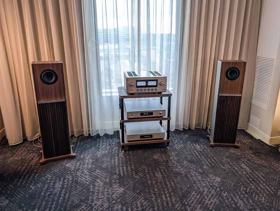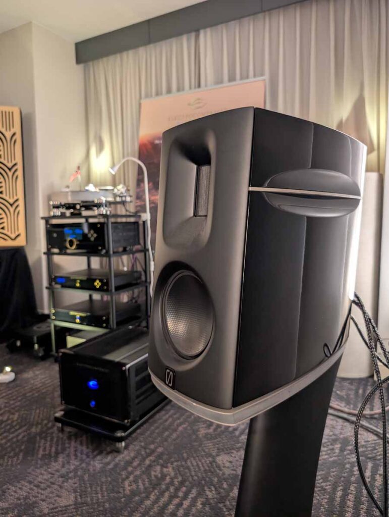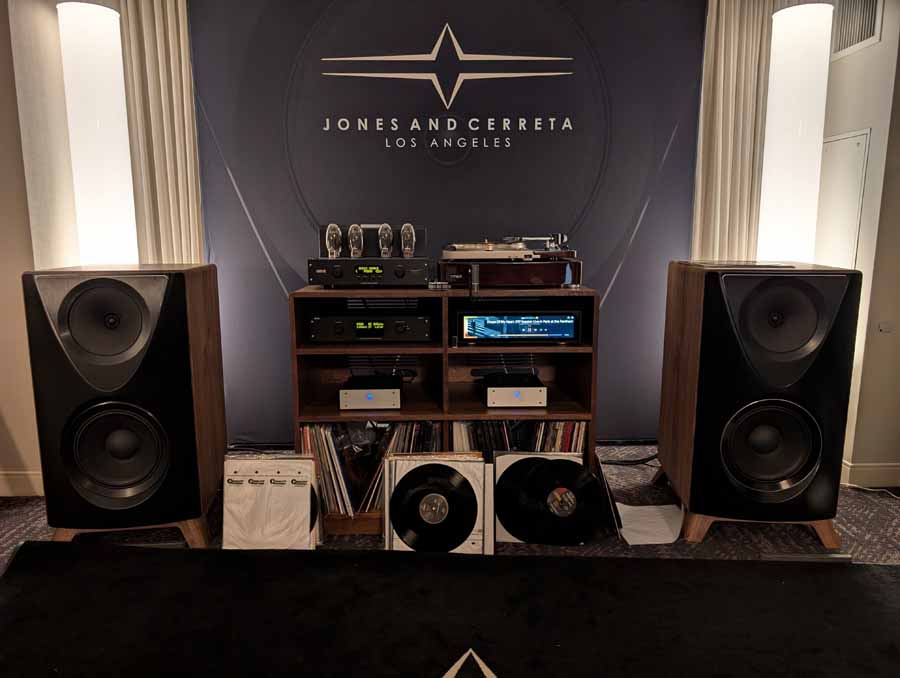 This room had the new Troubadour from Jones and Cerreta, a company setup by legendary speaker designer Andrew Jones alongside brothers Jamie and Bill Cerreta. The Troubadour features a unique field-coil concentric driver design. The system was powered by electronics from MoFi Distribution and showcased a blend of high-efficiency engineering and contemporary aesthetics.