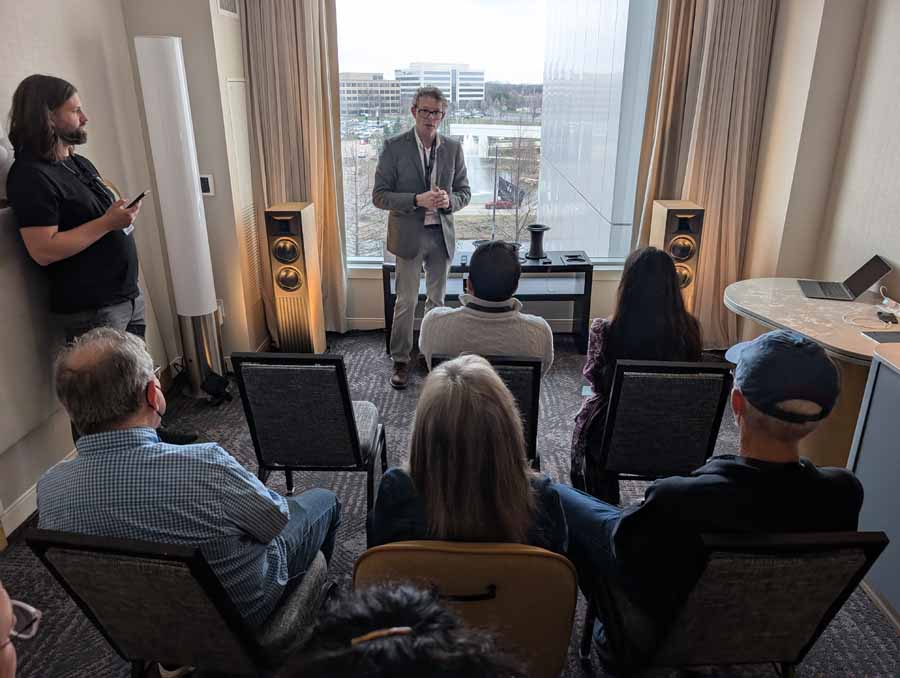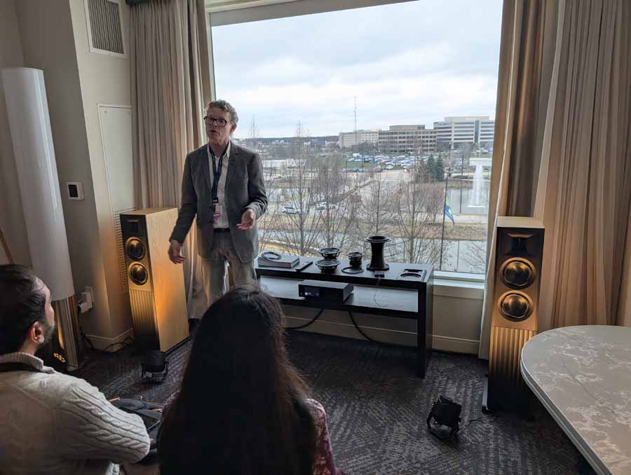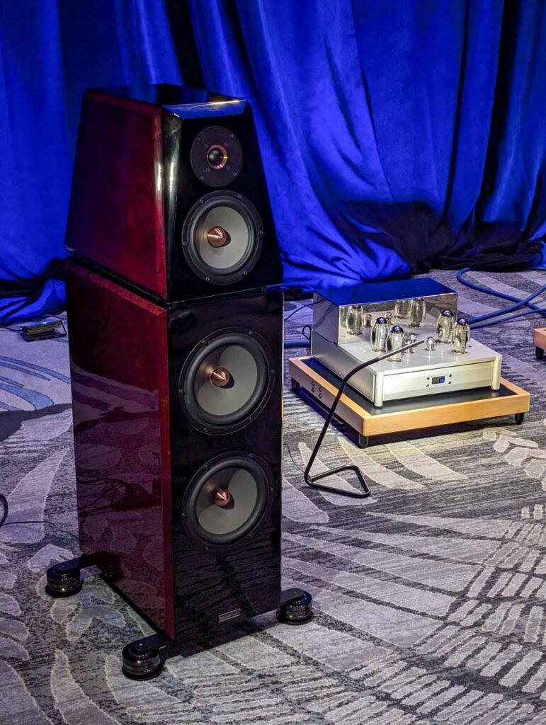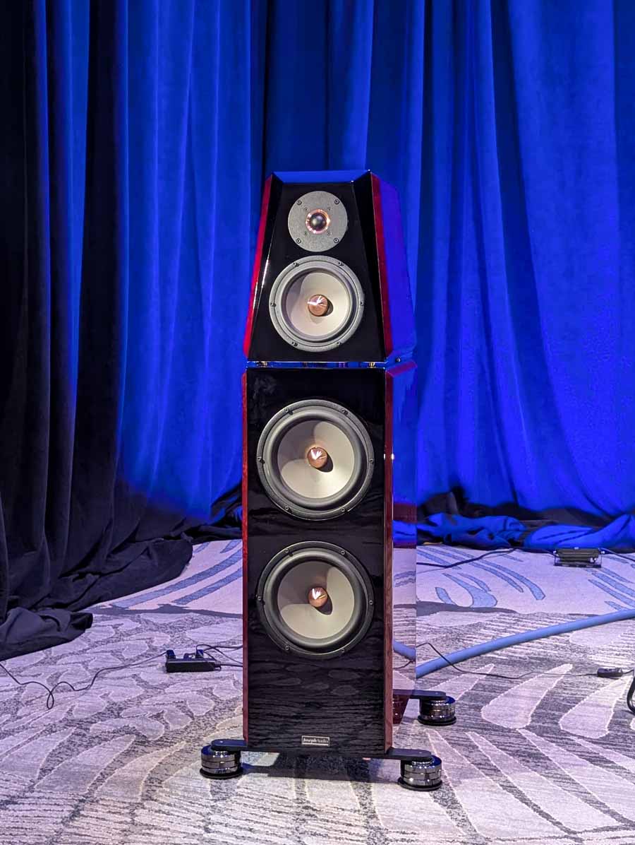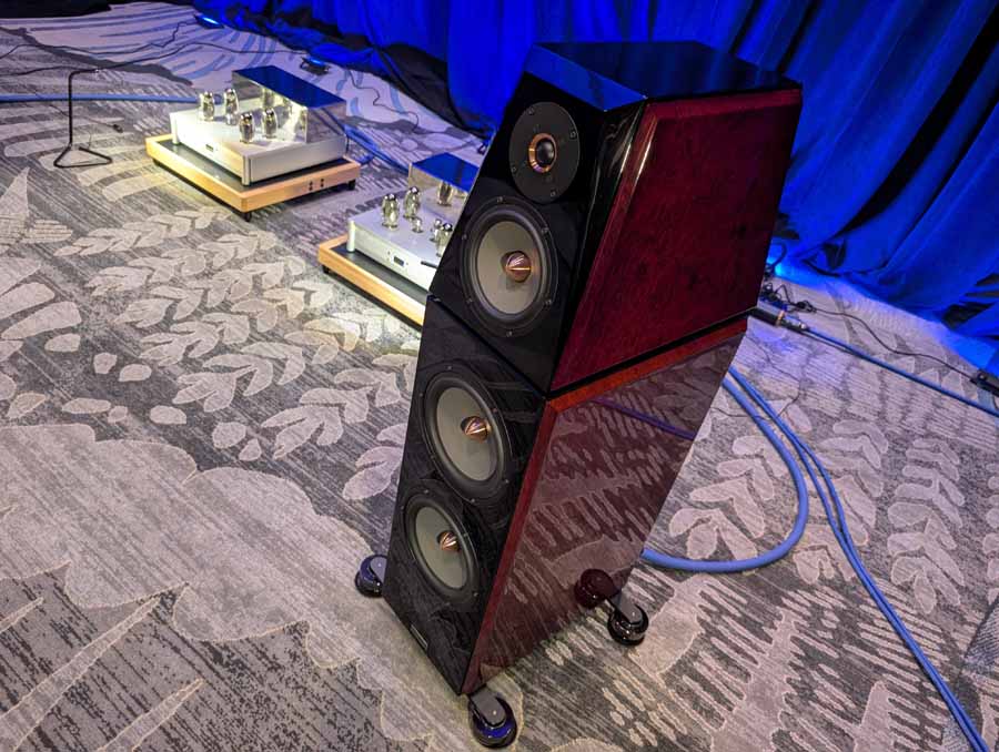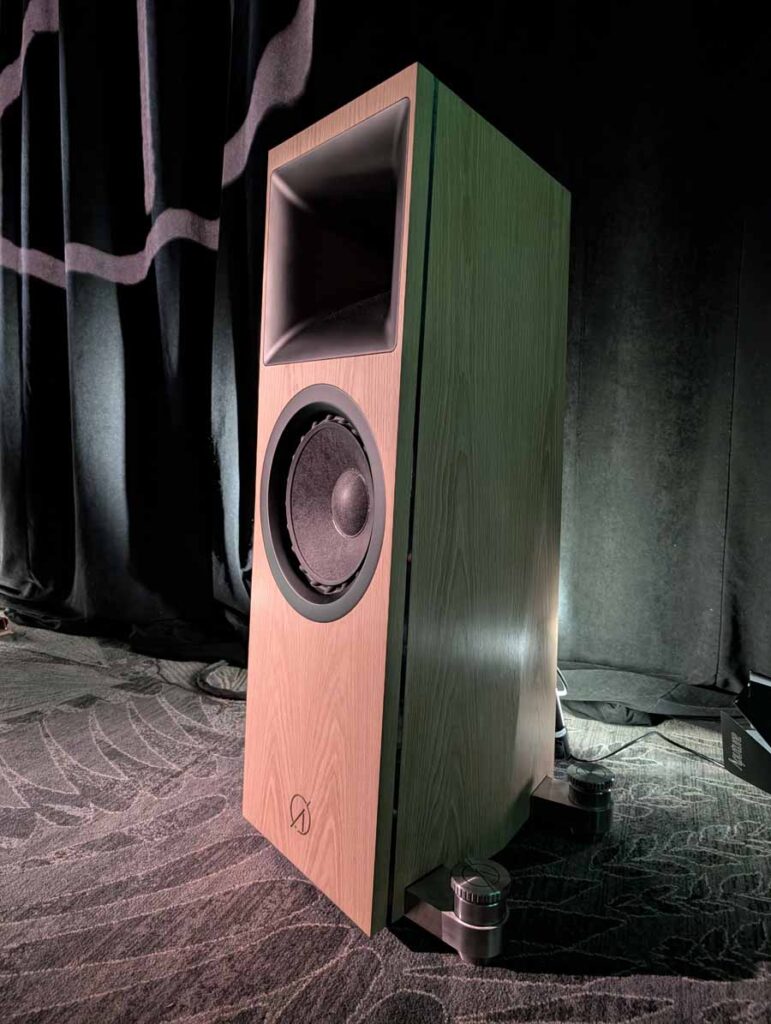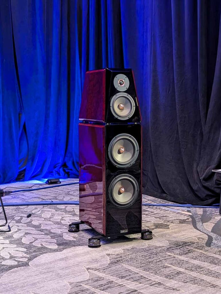This room had the new Troubadour from Jones and Cerreta, a company setup by legendary speaker designer Andrew Jones alongside brothers Jamie and Bill Cerreta. The Troubadour features a unique field-coil concentric driver design. The system was powered by electronics from MoFi Distribution and showcased a blend of high-efficiency engineering and contemporary aesthetics.