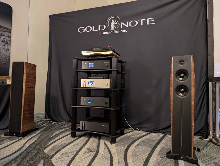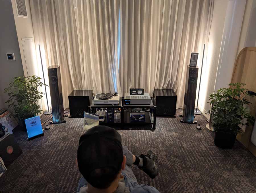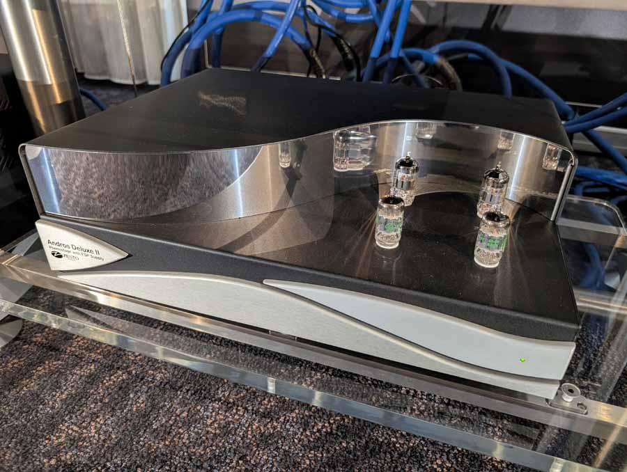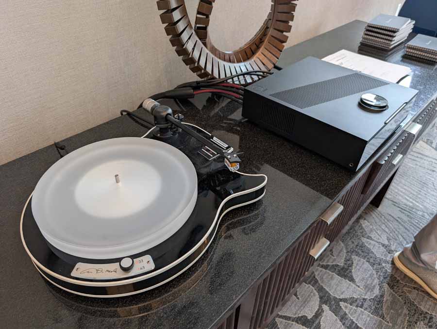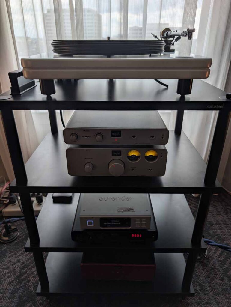 Starting on the 1st floor we had Upscale Audio with a few systems – System 1 with the Dr. Feickert Trio SE Turntable, Grimm Audio MU2 Media Player, and Phasemation EA-550 Phono EQ and SA-1000 Integrated Amplifier, driving the Klipsch La Scala AL5 speakers supported by a REL Acoustics 212/Black Label Subwoofer. The room also showcased System 2 featuring the Innuos Statement Music Server, Brinkmann Audio Nyquist DAC, and Musical Fidelity Nu-Vista 800.2 Integrated Amplifier driving Fyne Audio F1-12S speakers with SuperTraks. Additionally, a wide range of products were on display, including the Technics SL-1200G2 and VPI Forever Model One turntables, HiFi Rose RS150B and Eversolo DAC-Z10 streamers, and various tube amplifiers from PrimaLuna and Pathos.