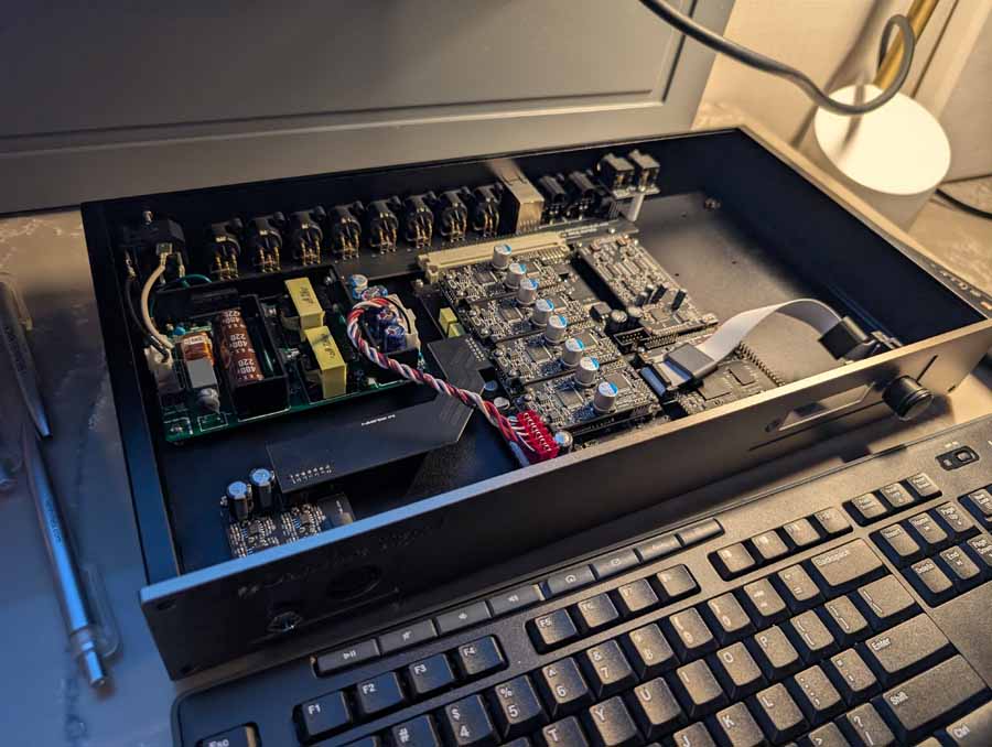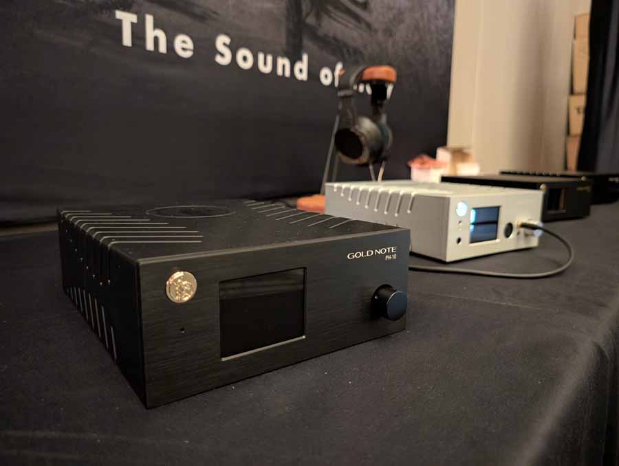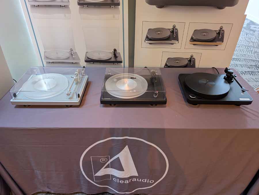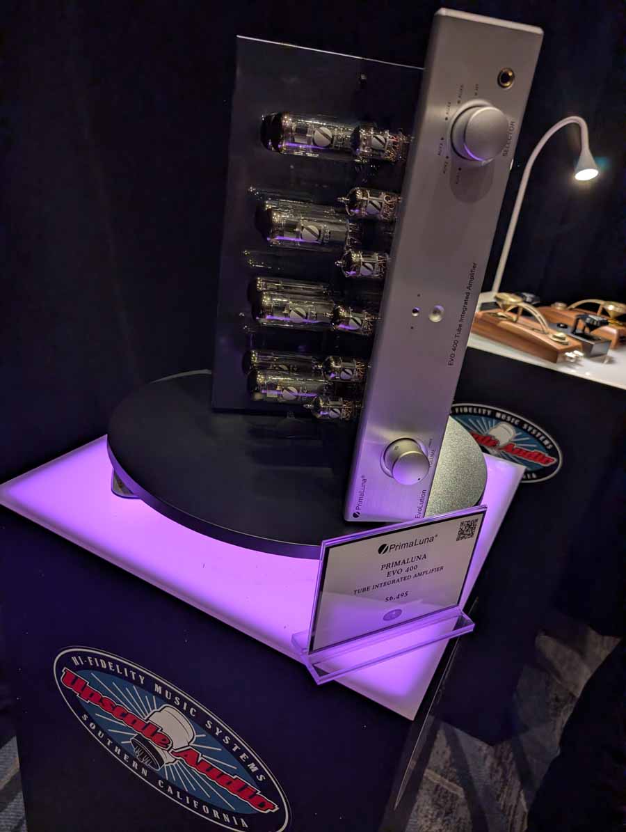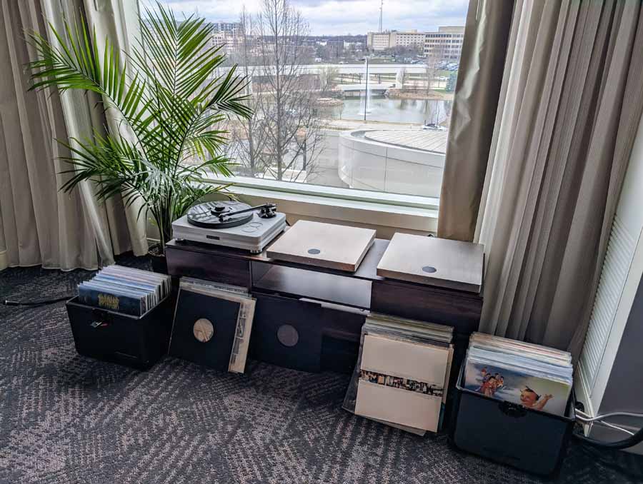 Starting on the 1st floor we had Upscale Audio with a few systems – System 1 with the Dr. Feickert Trio SE Turntable, Grimm Audio MU2 Media Player, and Phasemation EA-550 Phono EQ and SA-1000 Integrated Amplifier, driving the Klipsch La Scala AL5 speakers supported by a REL Acoustics 212/Black Label Subwoofer. The room also showcased System 2 featuring the Innuos Statement Music Server, Brinkmann Audio Nyquist DAC, and Musical Fidelity Nu-Vista 800.2 Integrated Amplifier driving Fyne Audio F1-12S speakers with SuperTraks. Additionally, a wide range of products were on display, including the Technics SL-1200G2 and VPI Forever Model One turntables, HiFi Rose RS150B and Eversolo DAC-Z10 streamers, and various tube amplifiers from PrimaLuna and Pathos.