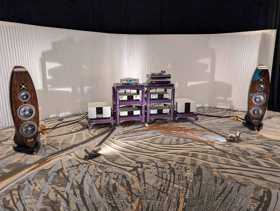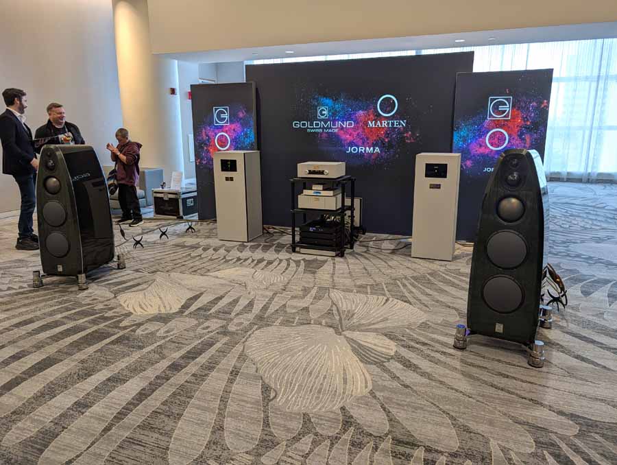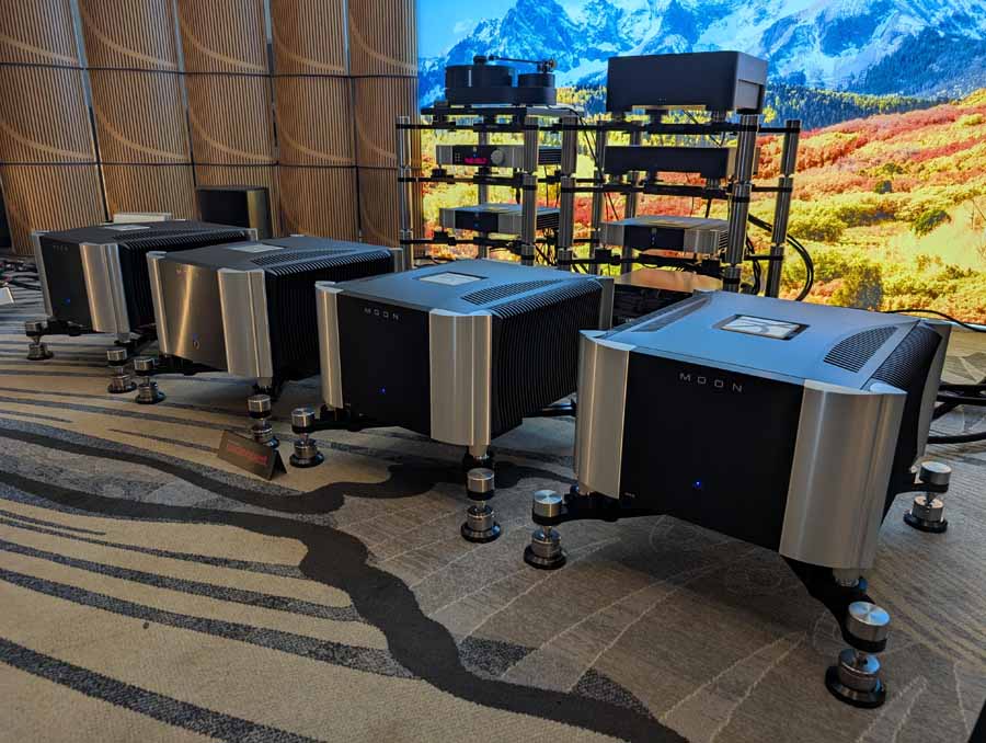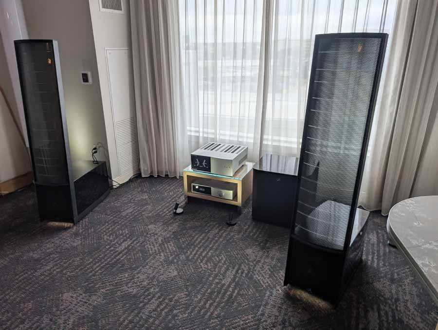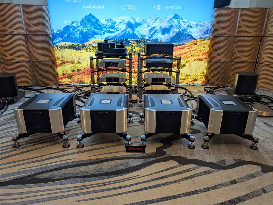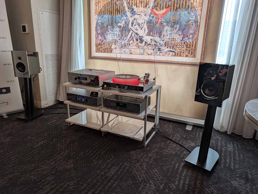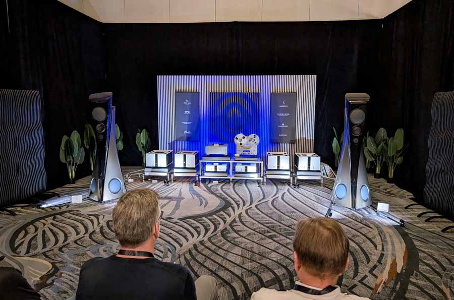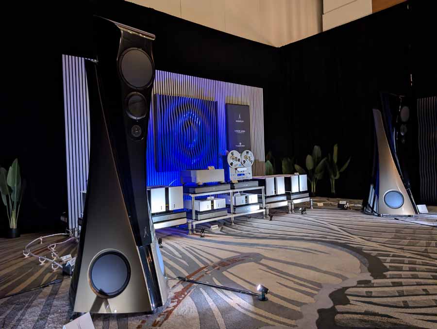Nirvana C had the Titan speakers (a USA debut), paired with four flagship 888 Monoblocks from MOON by Simaudio and additional electronics from MOON and Taiko Audio. They also had an AMG turntable, alongside cables by AudioQuest and equipment supports from Hifistay. Big sound as expected, with impressive clarity and punch.