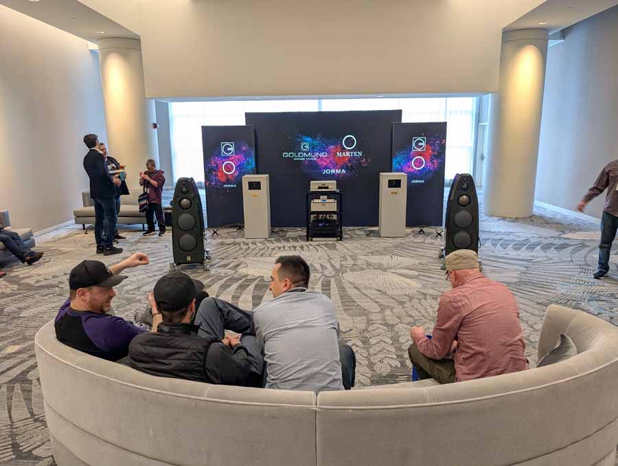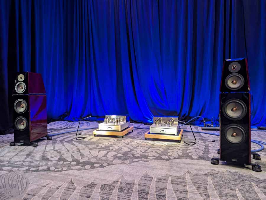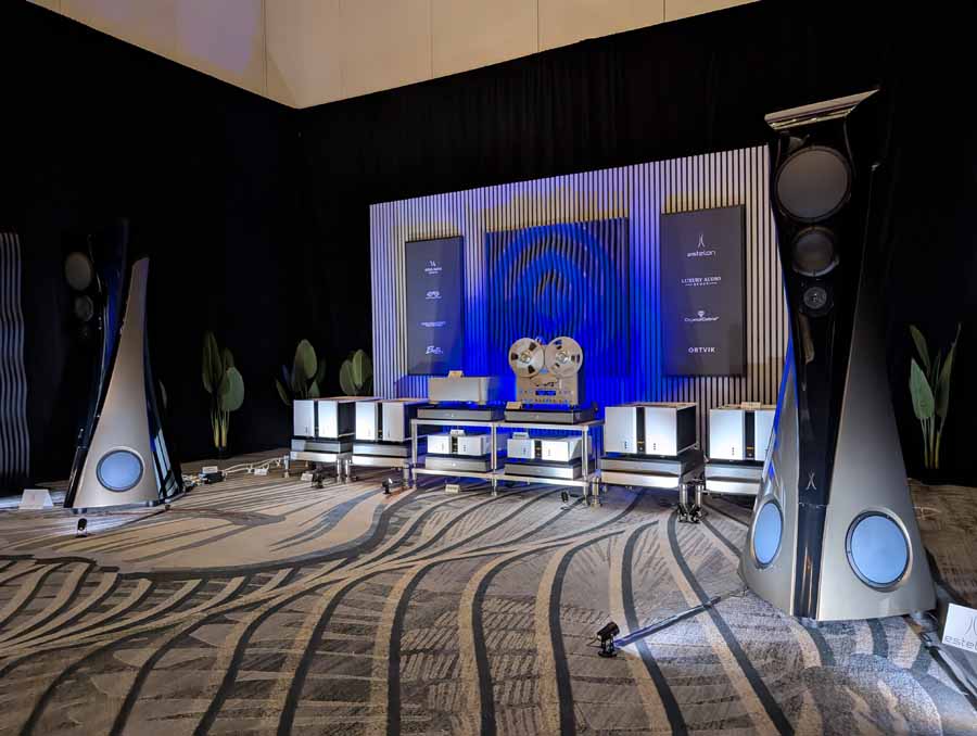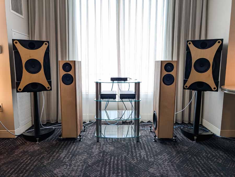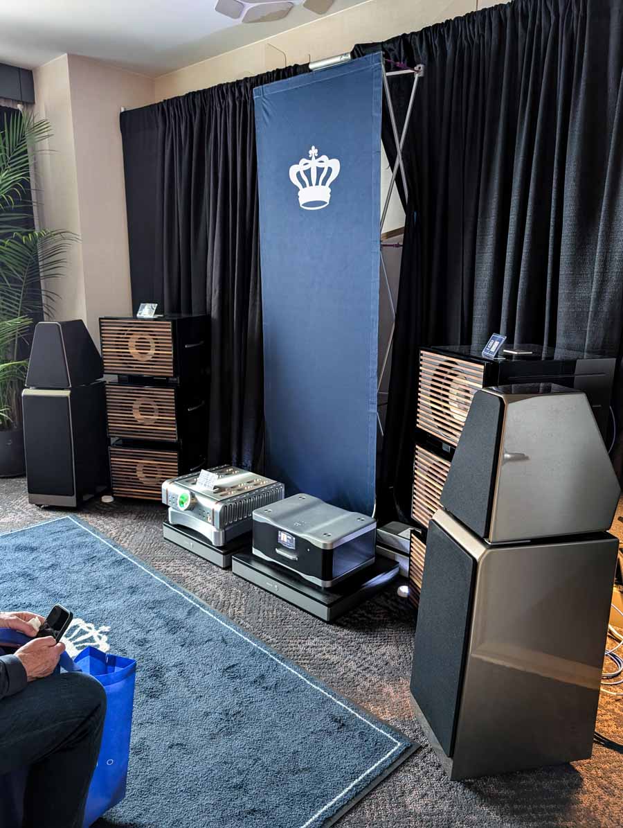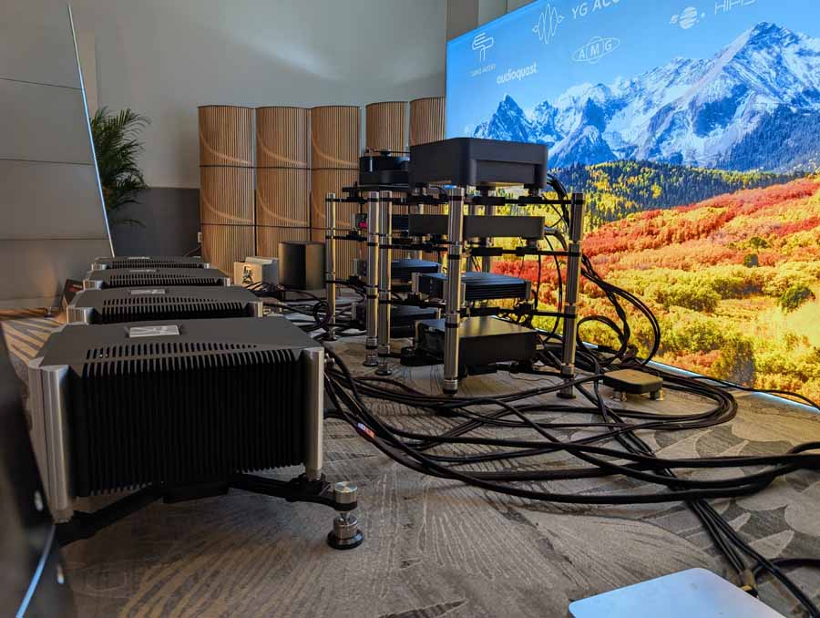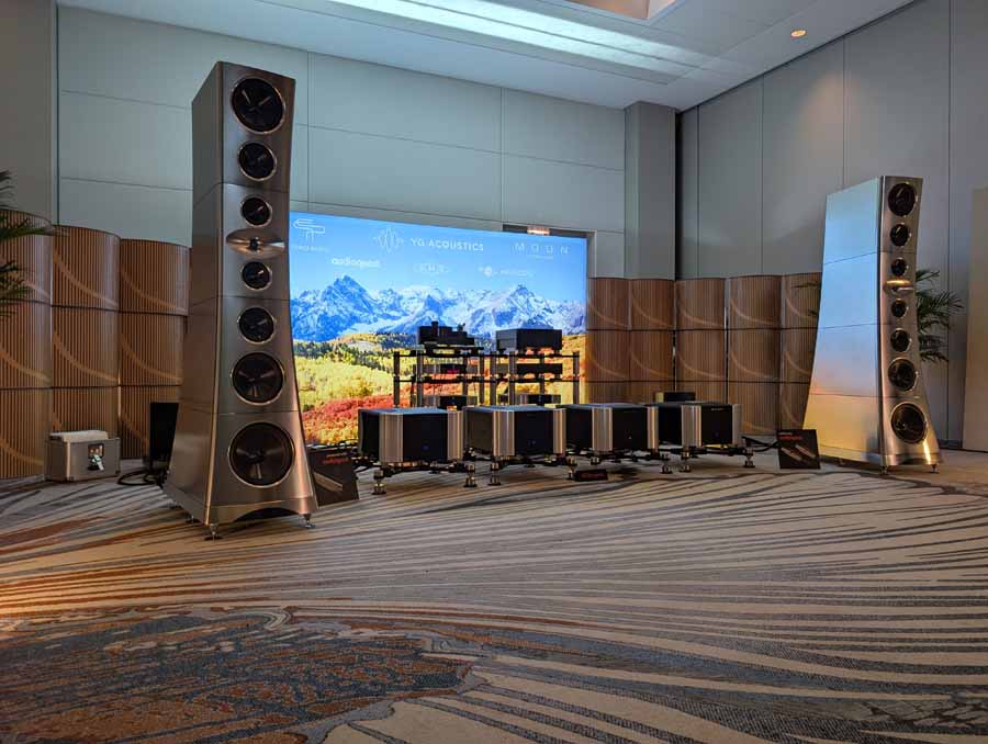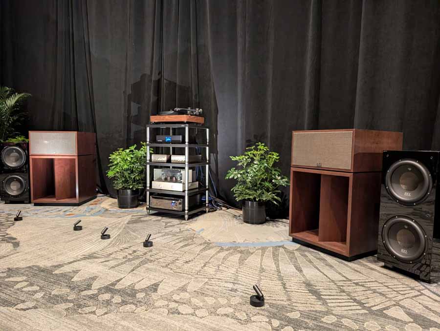 Nirvana C had the Titan speakers (a USA debut), paired with four flagship 888 Monoblocks from MOON by Simaudio and additional electronics from MOON and Taiko Audio. They also had an AMG turntable, alongside cables by AudioQuest and equipment supports from Hifistay. Big sound as expected, with impressive clarity and punch.