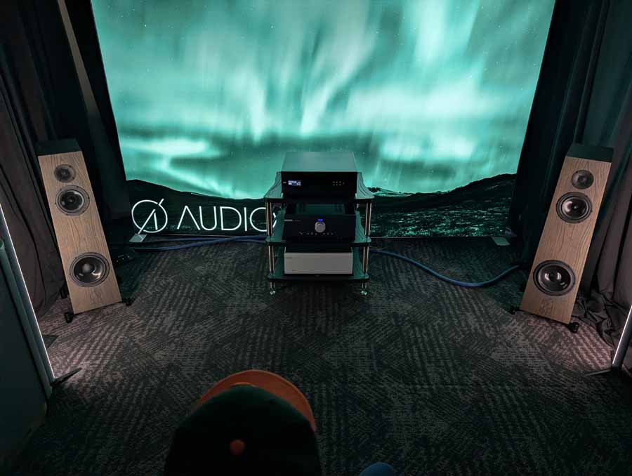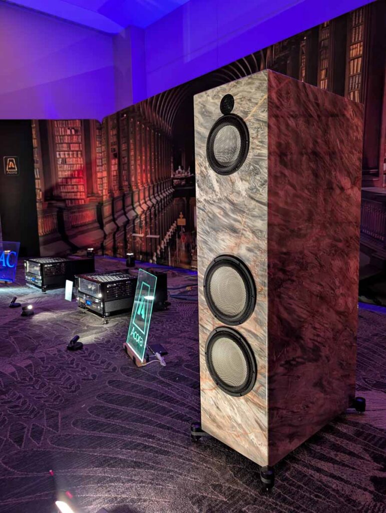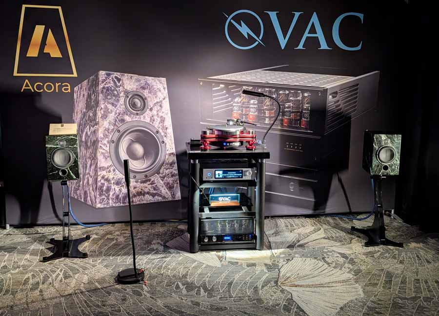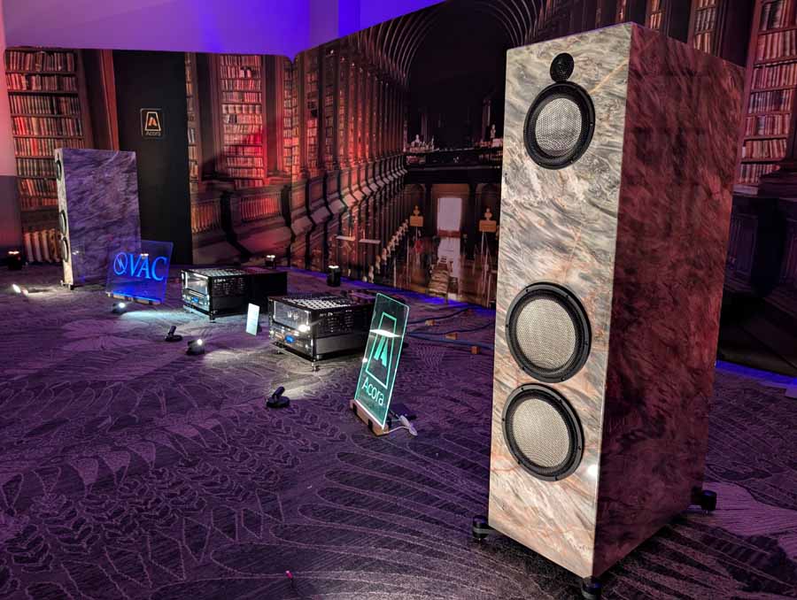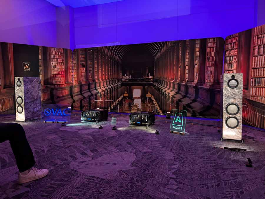 Acora Acoustics and VAC had the Main system featuring Acora SRC 2.2D loudspeakers, paired with VAC Master 300 iQ Mk II Musicbloc power amplifiers and Statement Line and Phono stages. The analogue source was a Swedish Analog Technologies (SAT) Record Playing System with a Lyra Atlas Lambda cartridge, while the digital side used an Aurender N30SA streamer and Lampizator Aphrodite DAC. They also had a second system with Acora MRB speakers and a VPI Avenger Streamer Direct, alongside a Hallway system featuring the massive Acora VRC speakers.