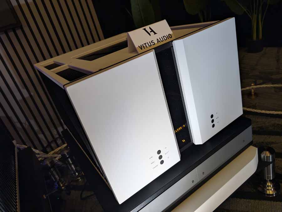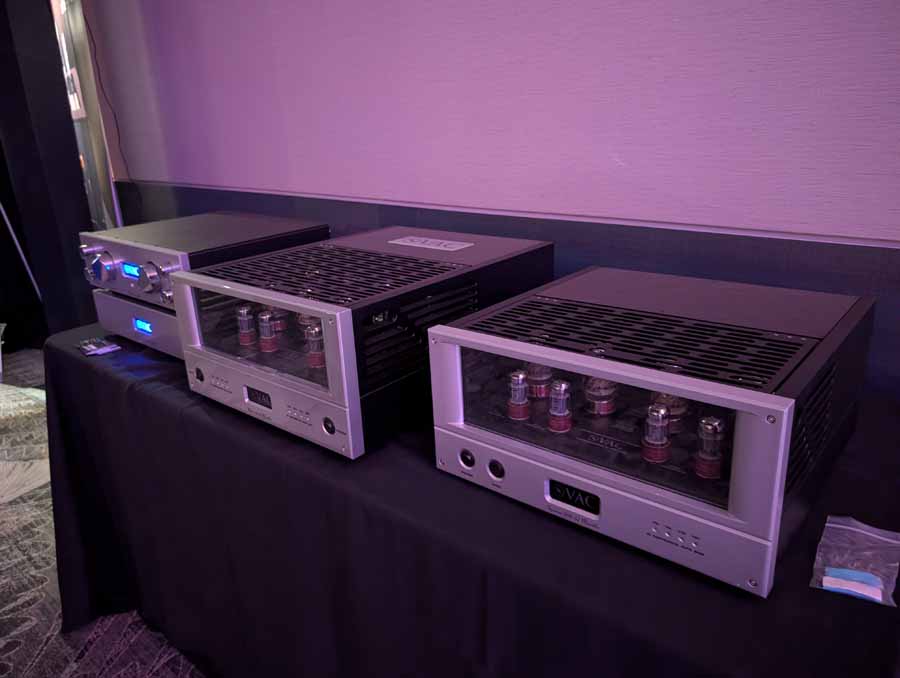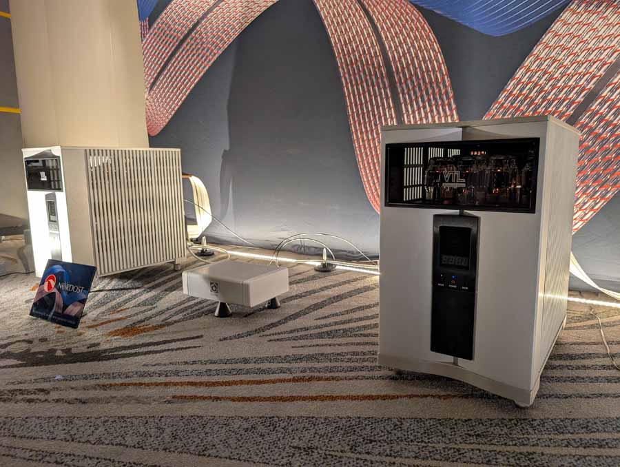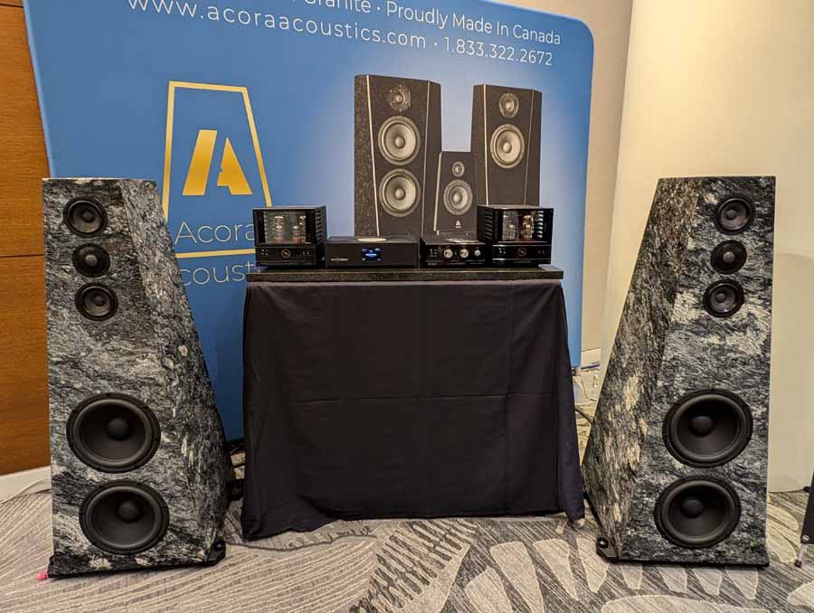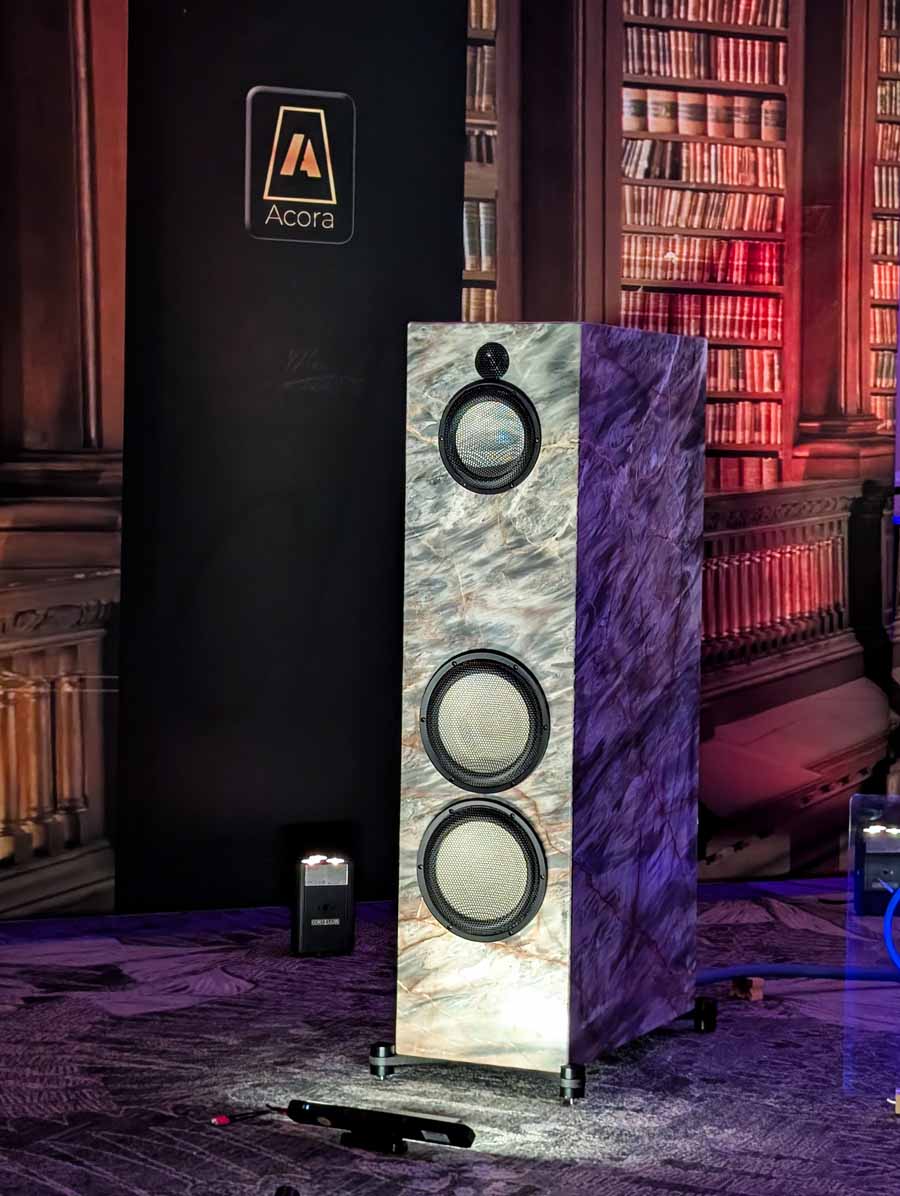 Acora Acoustics and VAC had the Main system featuring Acora SRC 2.2D loudspeakers, paired with VAC Master 300 iQ Mk II Musicbloc power amplifiers and Statement Line and Phono stages. The analogue source was a Swedish Analog Technologies (SAT) Record Playing System with a Lyra Atlas Lambda cartridge, while the digital side used an Aurender N30SA streamer and Lampizator Aphrodite DAC. They also had a second system with Acora MRB speakers and a VPI Avenger Streamer Direct, alongside a Hallway system featuring the massive Acora VRC speakers.