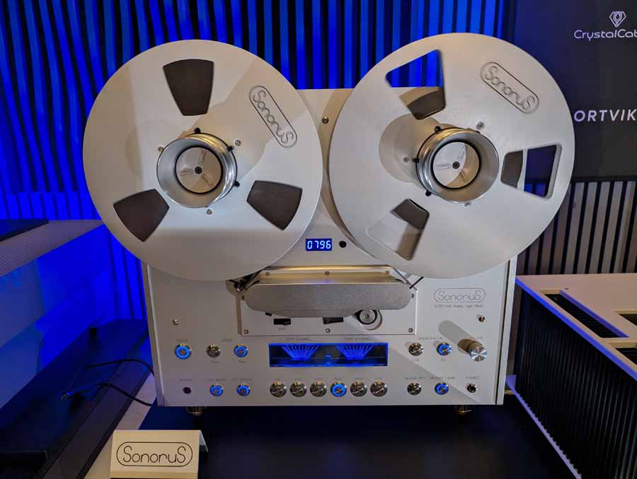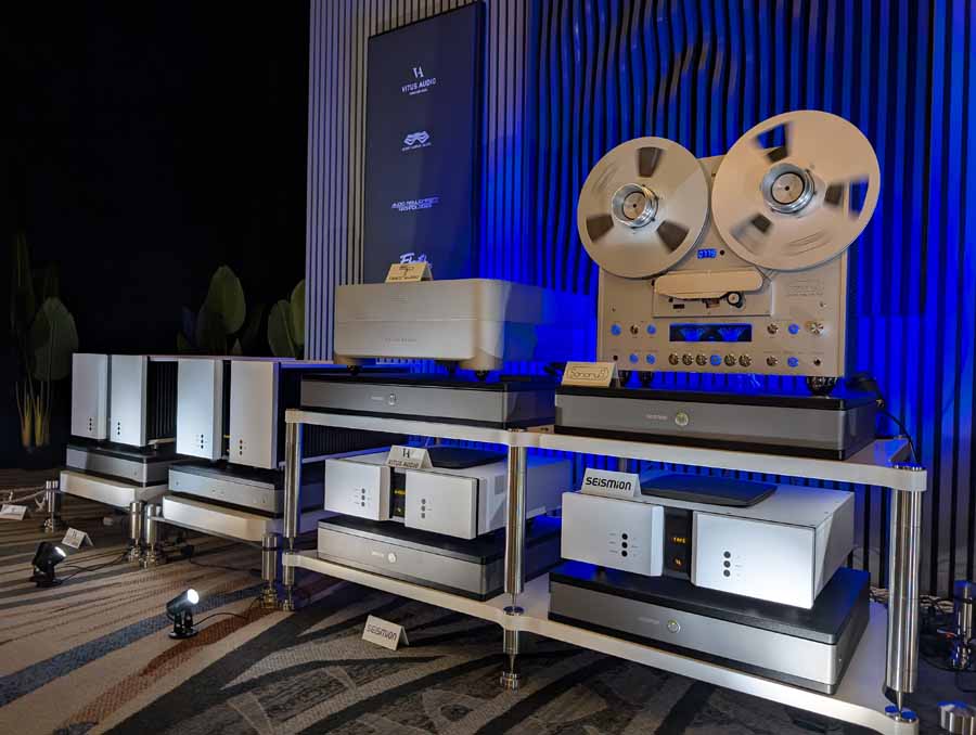 In this huge space you had two pairs of Vitus SM-103 amplifiers paired with the Vitus SL-103 mkII preamplifier, driving the Estelon Extreme MkII floorstanding speakers. The system featured a high-end dual-source setup including a SonoruS Audio reel-to-reel tape deck for analogue playback and a Taiko Olympus music server with matching router/switch for digital duties, all processed through a Vitus SD-025 mkII DAC. The entire chain utilised Crystal Cable Infinite Dream cabling throughout, supported by Seismion active isolation platforms, Arya Labs RevoPods, and ART absorption devices.