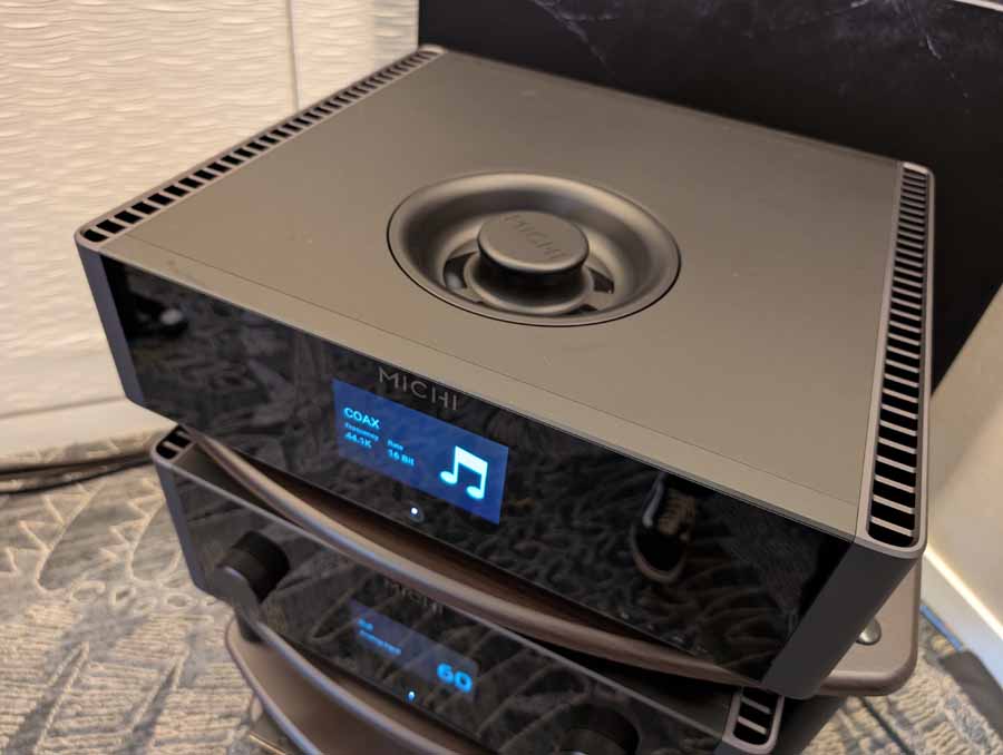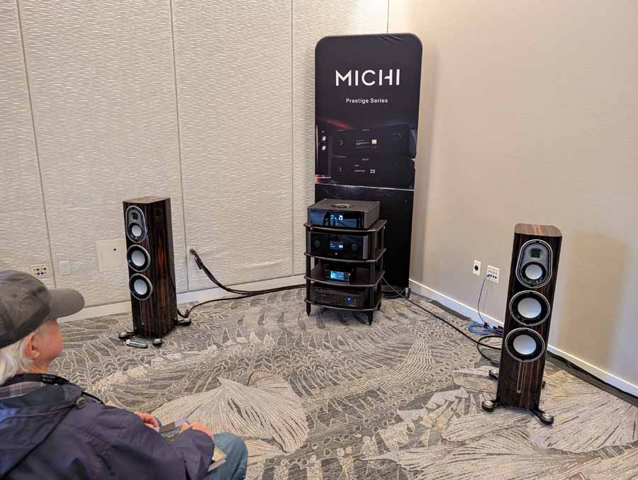 Saturday Audio Exchange celebrated their 44th Anniversary in the Innovation Room with a showcase featuring Monitor Audio, Rotel, and Michi. System One was the main focus, featuring the Michi X5 S2 Integrated Amplifier and Michi Q5 CD Transport/DAC driving the Monitor Audio Platinum 200 3G floorstanding speakers, backed up by a Monitor Audio Anthra W12 subwoofer.