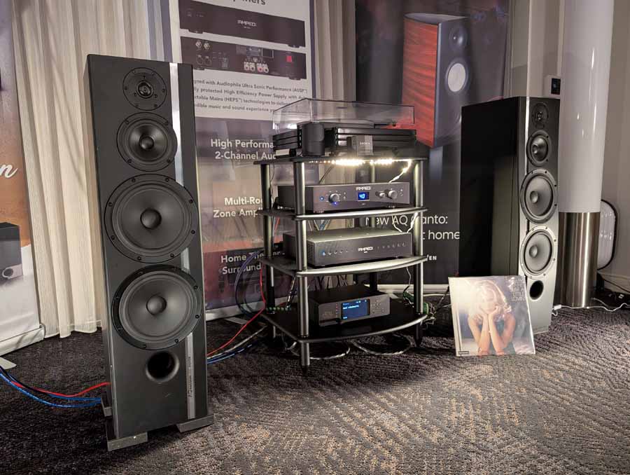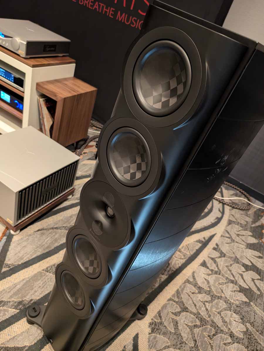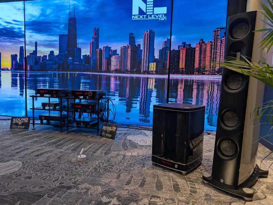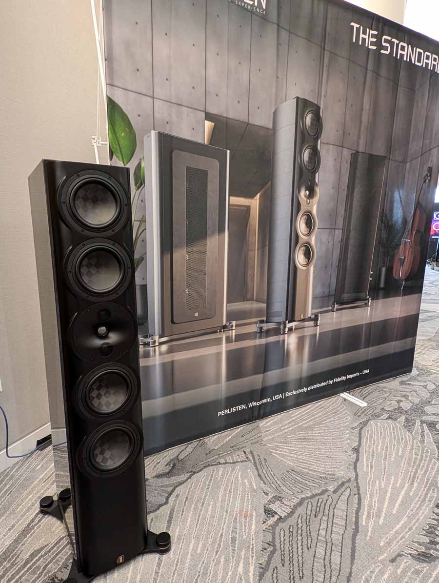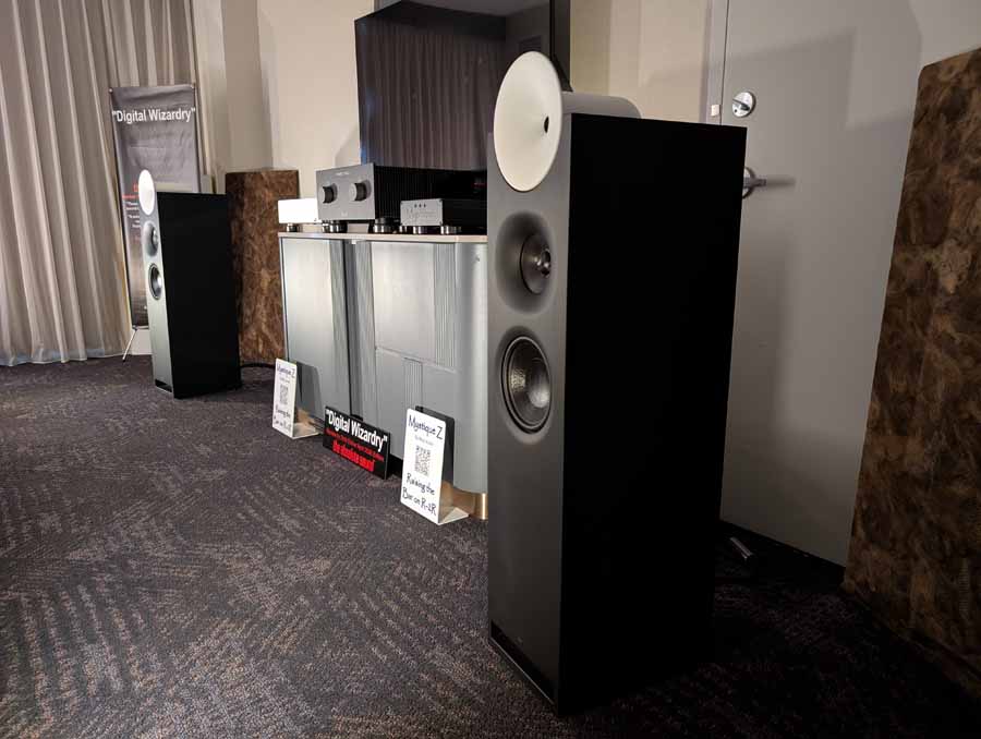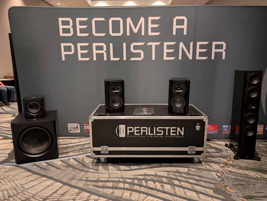 Perlisten had the S7t Black Edition floorstanding speakers, paired with D8is subwoofers and Audia Flight electronics, including the Strumento No 8 Signature mono amps and Strumento No 1 Signature preamp. They also featured the Matrix Audio MS-1 streamer for the digital front end, alongside a dedicated DSP crossover.