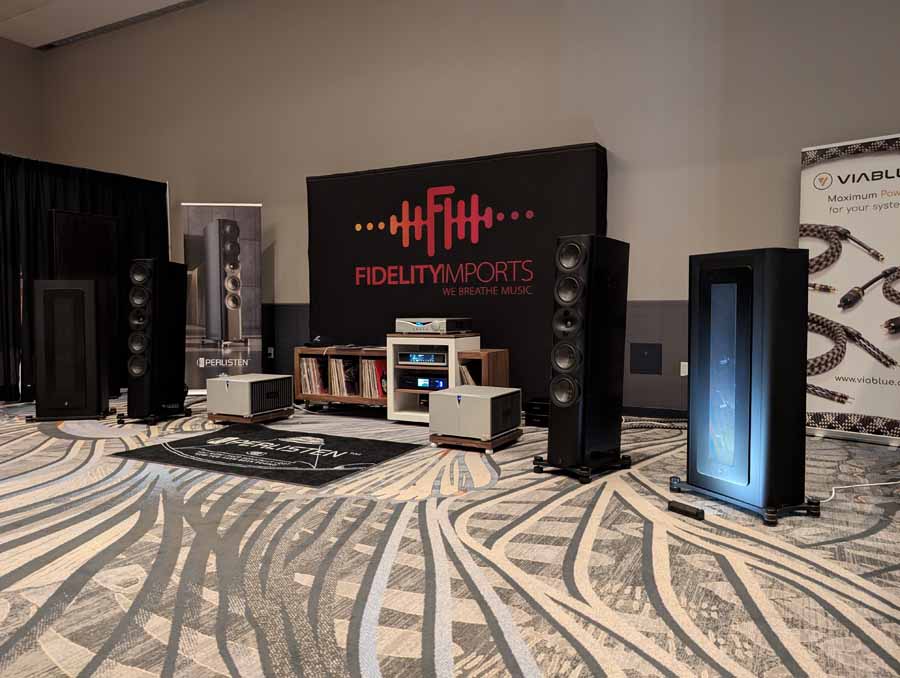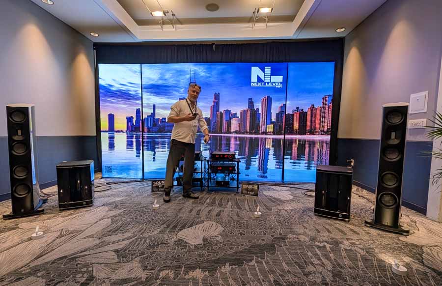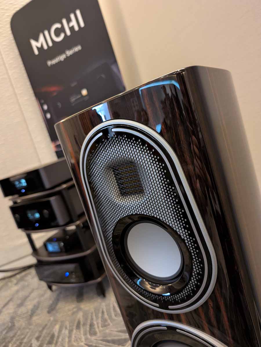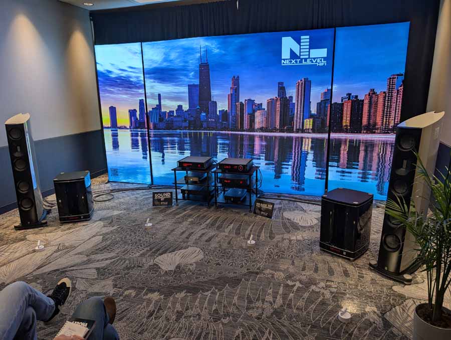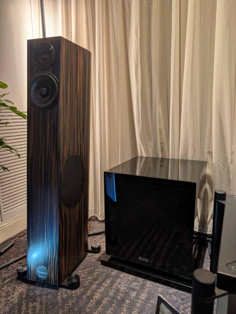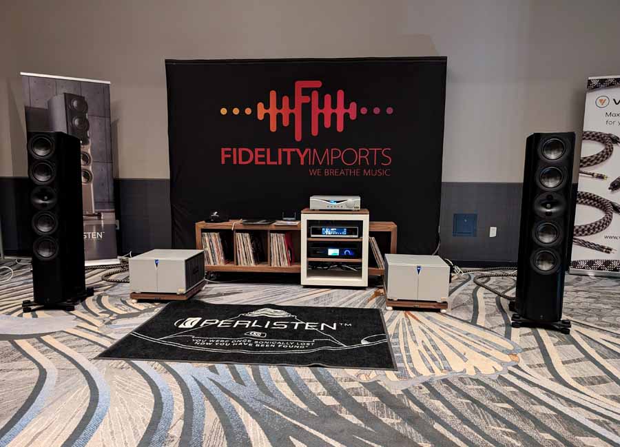 Perlisten had the S7t Black Edition floorstanding speakers, paired with D8is subwoofers and Audia Flight electronics, including the Strumento No 8 Signature mono amps and Strumento No 1 Signature preamp. They also featured the Matrix Audio MS-1 streamer for the digital front end, alongside a dedicated DSP crossover.