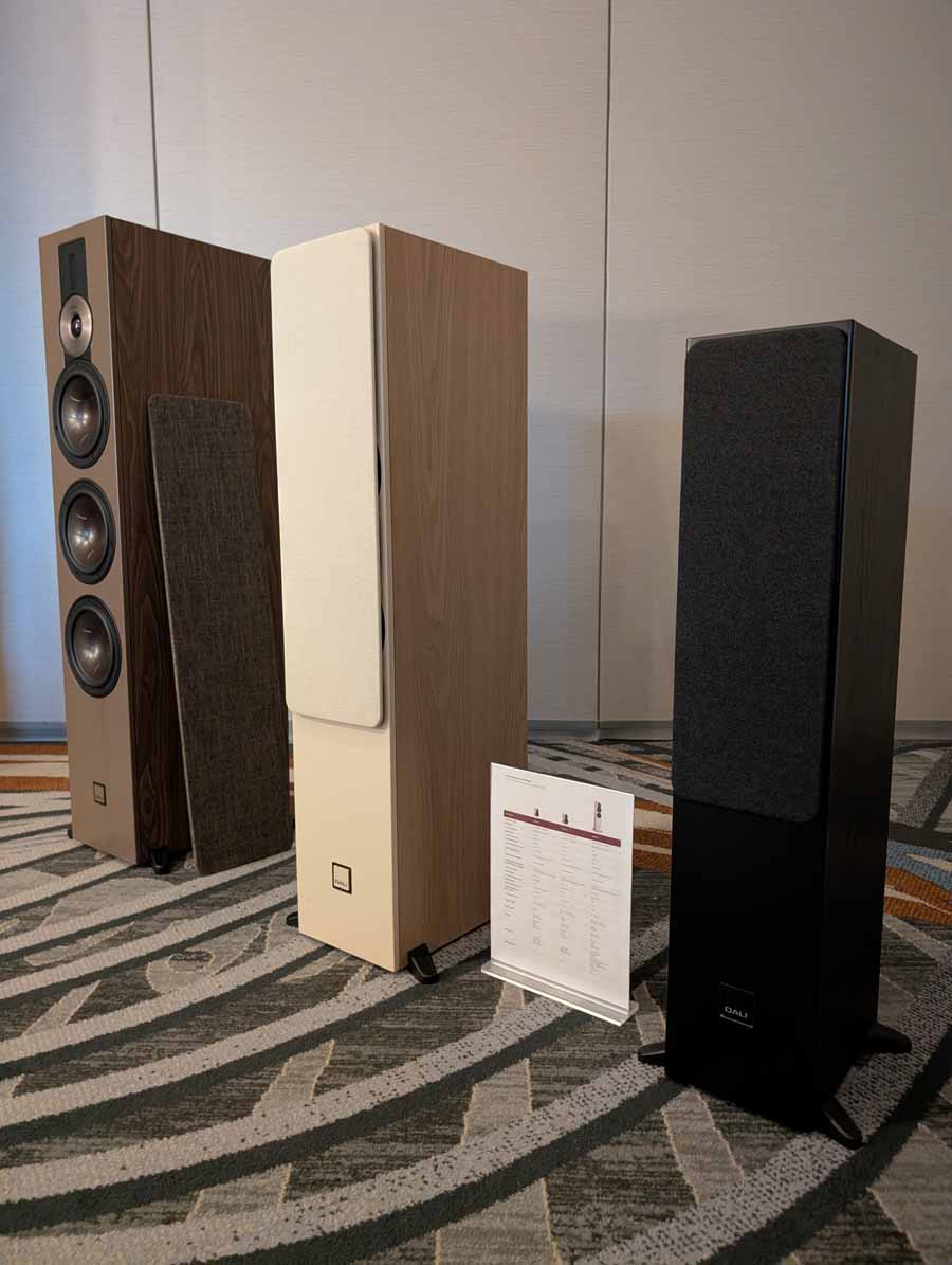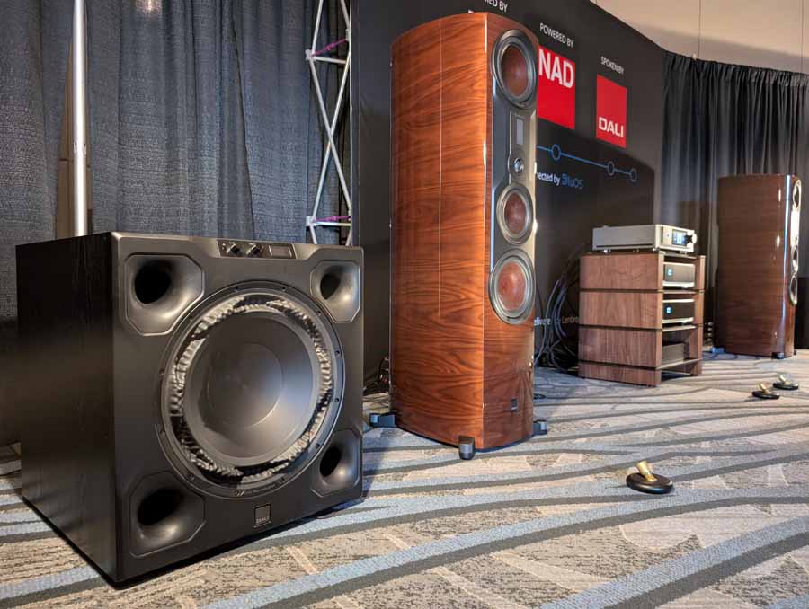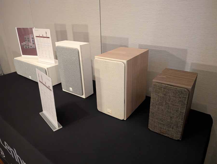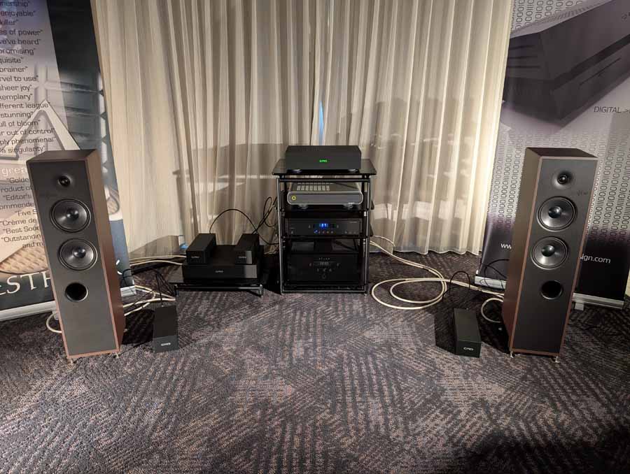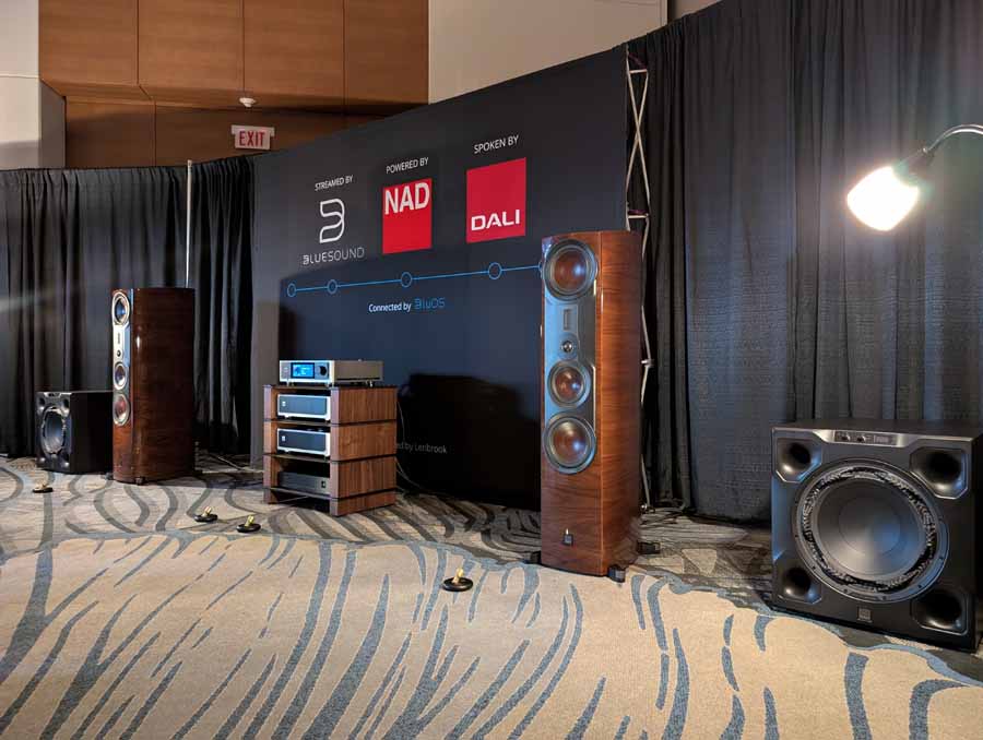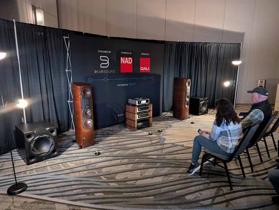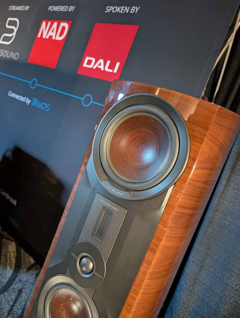 Lenbrook Americas had the NAD M23 V2 power amplifier and M66 preamplifier driving the DALI EPIKORE 9 speakers, supported by a pair of DALI V-16 subwoofers. The room also featured the NAD C 3030 integrated amplifier and C 3050 BluOS amplifier on display, alongside Bluesound NODE NANO, NODE, NODE ICON streamers, and the POWERNODE streaming amplifier. DALI were also showcasing their new SONIK range of speakers.