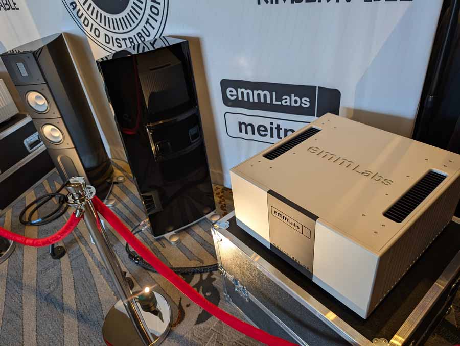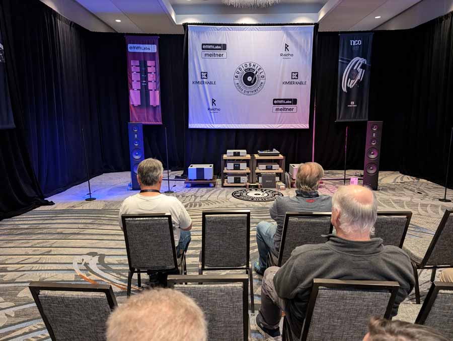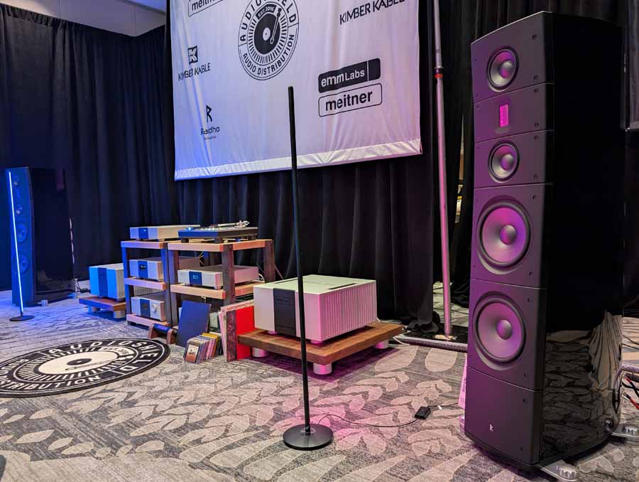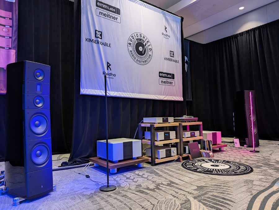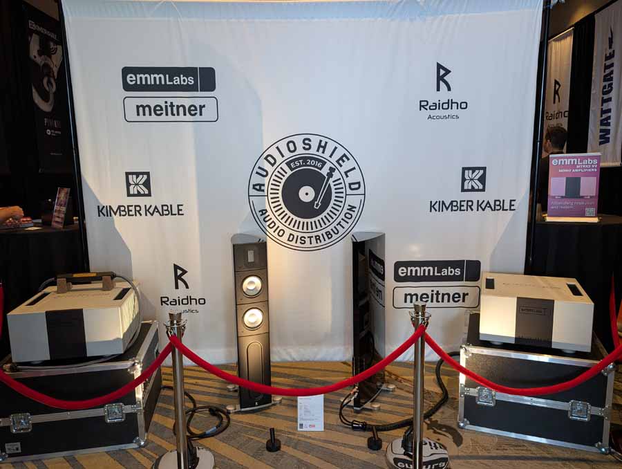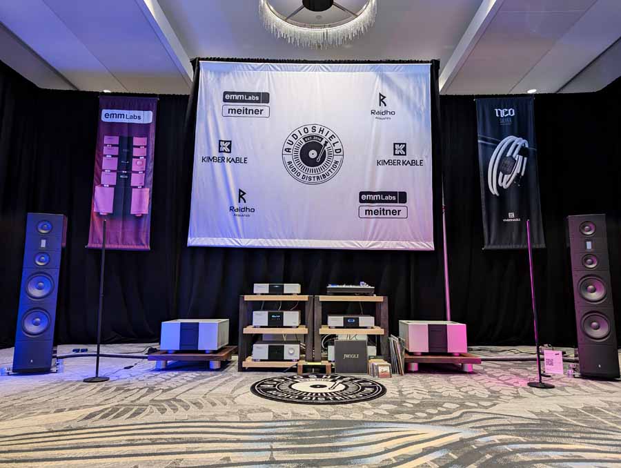 Audio Shield Distribution had the Raidho TD3.10 and X2.6 loudspeakers in black, paired with a full range of EMM Labs electronics including the MTRX2 V2 mono amplifiers, PRE2 stereo preamplifier, and DA2i D/A converter. They also had the Pink Faun 2.16 Dual Ultra streamer and DS Audio Grand Master Extreme cartridge, alongside a full complement of Kimber Kable cabling including the KS6068 speaker cables and Palladian power cables.