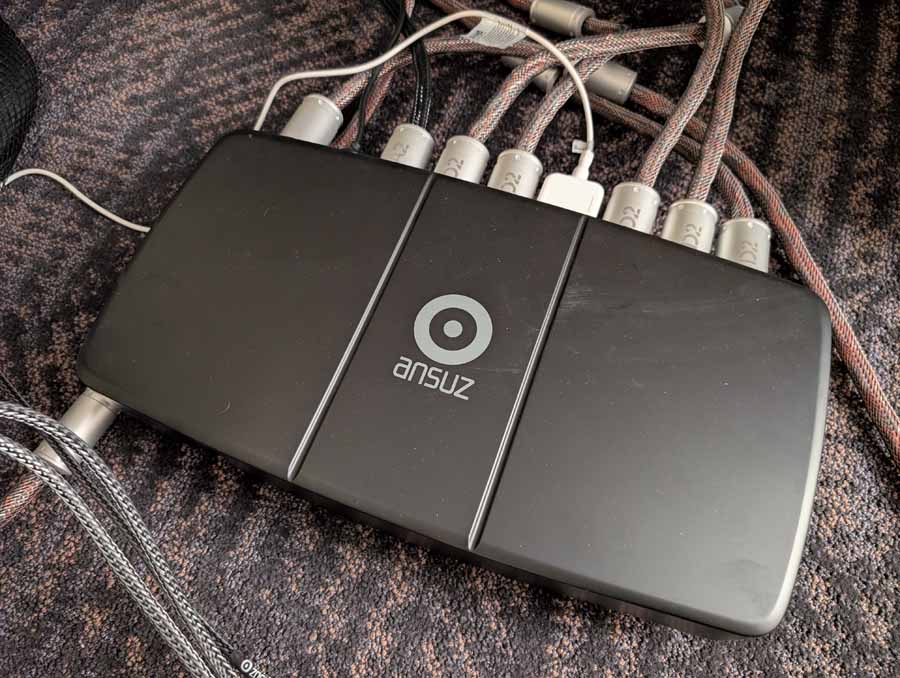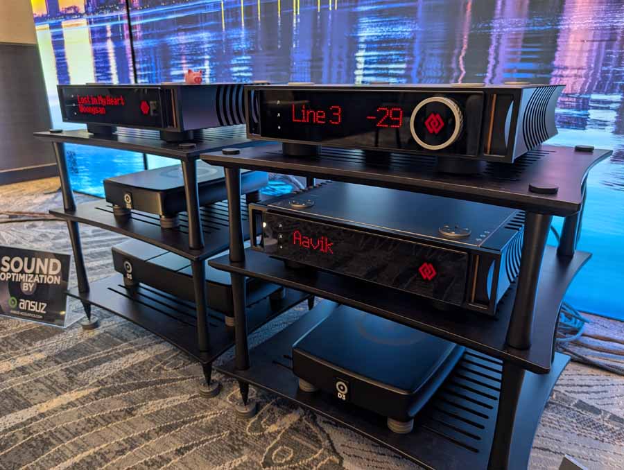 In the Epiphany ballroom, Audio Group Denmark featured the Børresen C3 and BM3 speakers, paired with Aavik electronics including the I-588 amplifier, SD-588 streaming DAC, and P-588 power amplifier. They also showcased a comprehensive Ansuz D3 cable loom, alongside the Ansuz Mainz8 D3 power distributor and PowerSwitch D3.