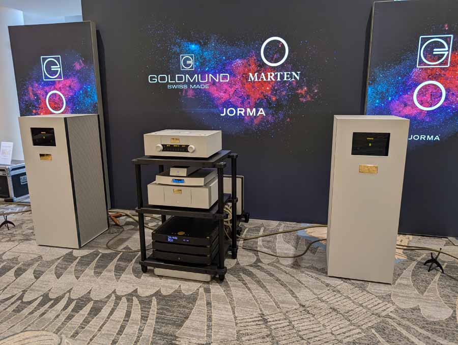 In this lounge you had the Goldmund Telos 8800 monoblock amplifiers paired with the Goldmund Mimesis Reference preamplifier, driving the Marten Coltrane Quintet Extreme speakers. The system featured Jorma Paragon cabling throughout.