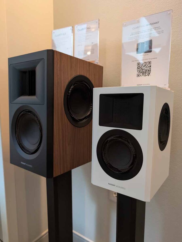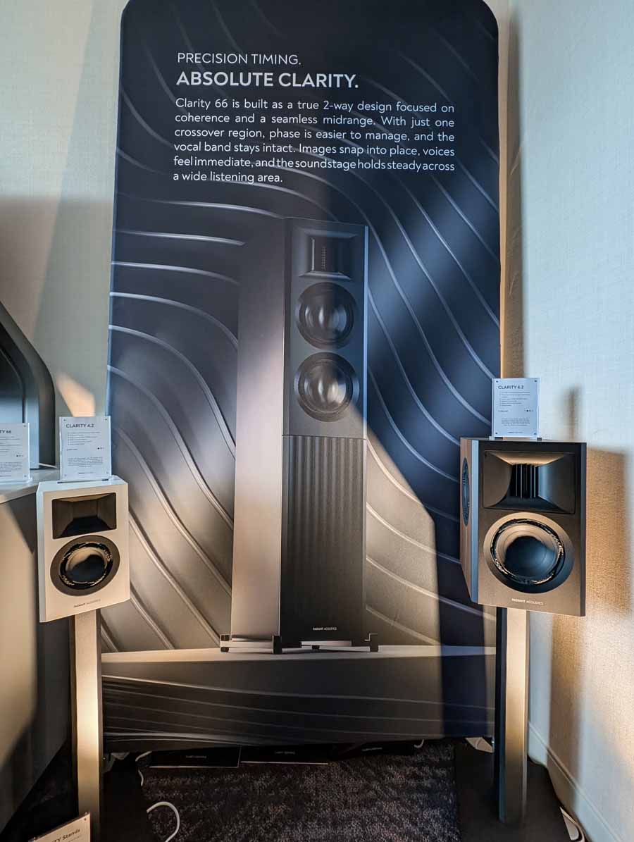 Radiant were showcasing their new Clarity 66 floorstanders, powered by the Lyngdorf TDAI-2210 integrated streaming amplifier. They also displayed the smaller Clarity 6.2 and 4.2 bookshelf models, alongside dedicated Clarity stands.