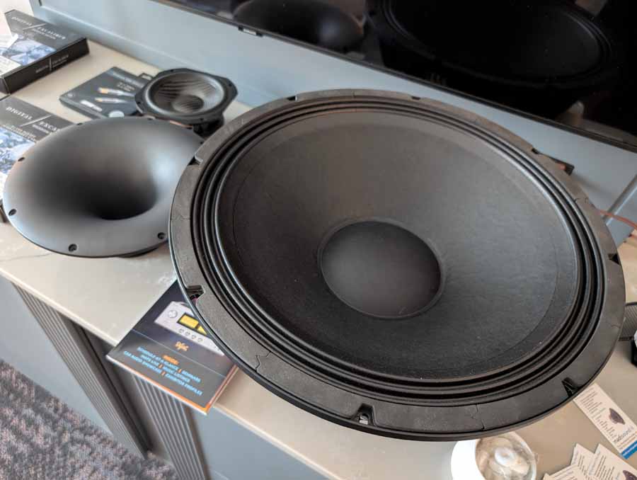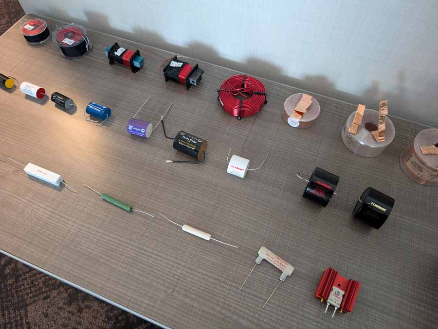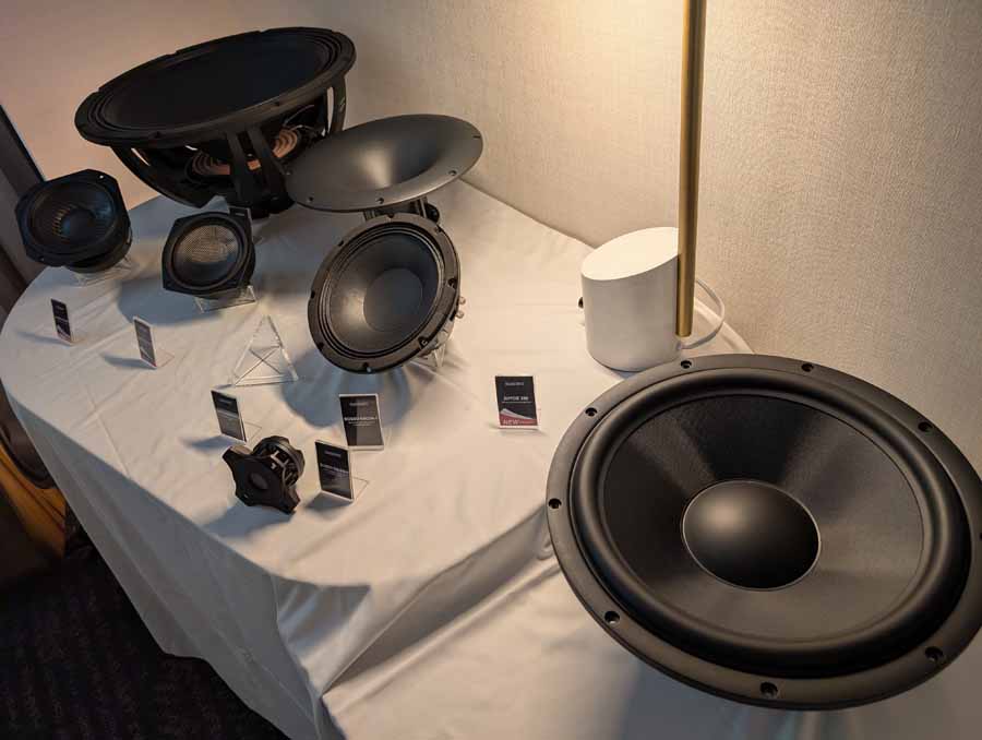 Madisound had a range of drivers from various manufacturers on display, alongside a couple of pairs of speakers made with some of those drivers. There were also some other assorted electronic components on display in this room.