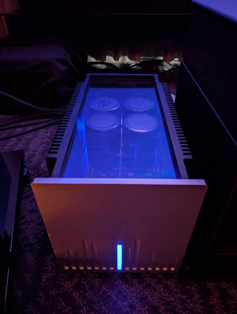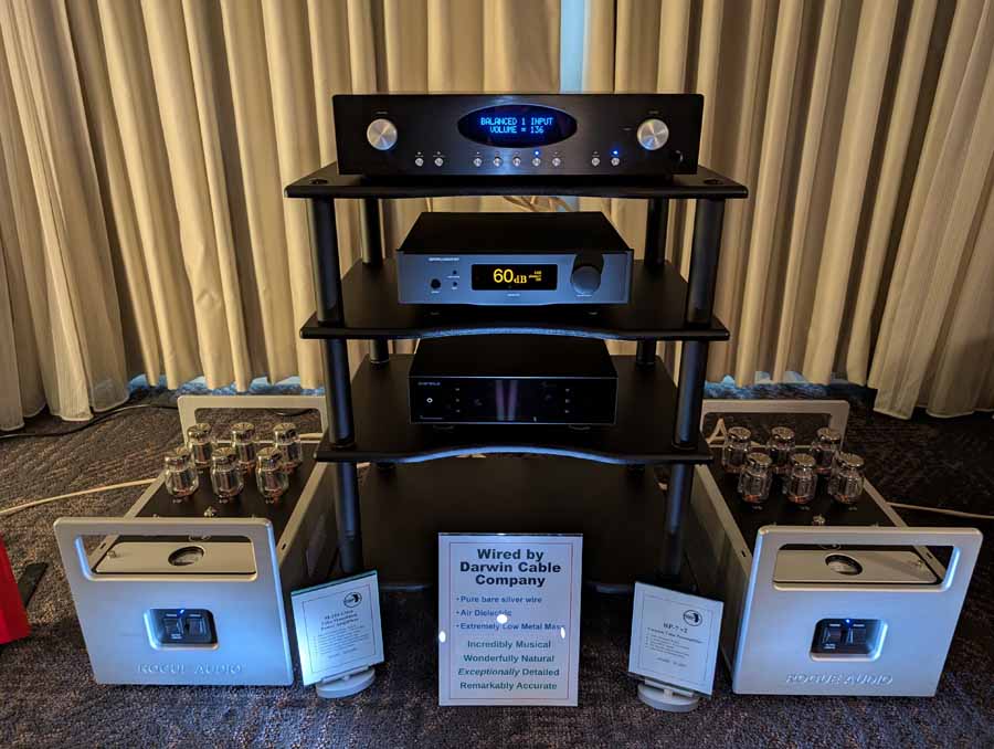 In here you had the Rogue Audio M-250 monoblock amplifiers paired with the Rogue Audio RP-7 v2 preamplifier, driving the Magnepan 2.7x speakers. The system featured an Eversolo T-8 streamer and Garlubidor Divinity DAC, with Darwin Cable Company Natural 2 and Enlightenment Extreme cabling throughout.