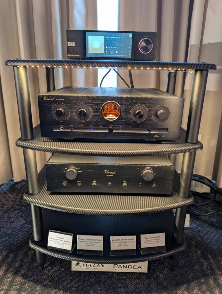 In Room 390, you had the Vincent Audio SV-237MKII integrated amplifier driving the Fyne Audio 501s floorstanding speakers in Walnut. The system featured an Eversolo DMP-A6 Master Edition Gen 2 as the digital source, with AudioQuest Rocket 88 speaker cables and Pangea Audio power distribution and racking throughout.