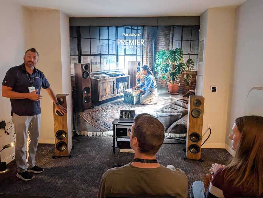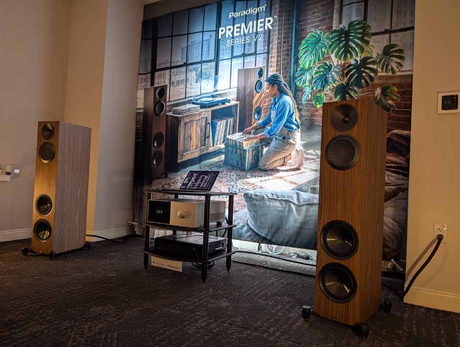 Here you had the Anthem STR integrated amplifier driving the new Paradigm Premier V2 820 floorstanding speakers. The system featured Anthem Room Correction (ARC) and an Essentials Sub 10 for low-end reinforcement, with the entire setup wired and power-conditioned by AudioQuest.