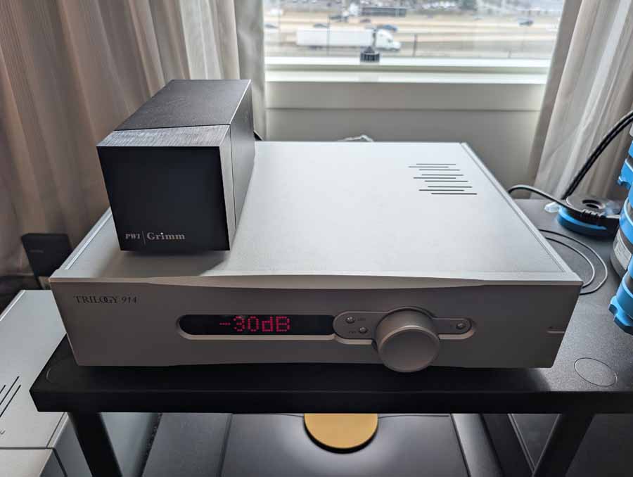 In the first 2WA room you had the Trilogy 994 monoblock amplifiers paired with the Trilogy 914 preamplifier, driving the Aequo Ensium loudspeakers. The system featured a digital front end including the Ideon Absolute DAC, Absolute Time, and Absolute Stream, alongside a Grimm MU1 server. For analogue playback, the room utilised a VPI Avenger turntable with a Grimm Phono pre-amp, with the entire setup connected via Wire World cabling.
