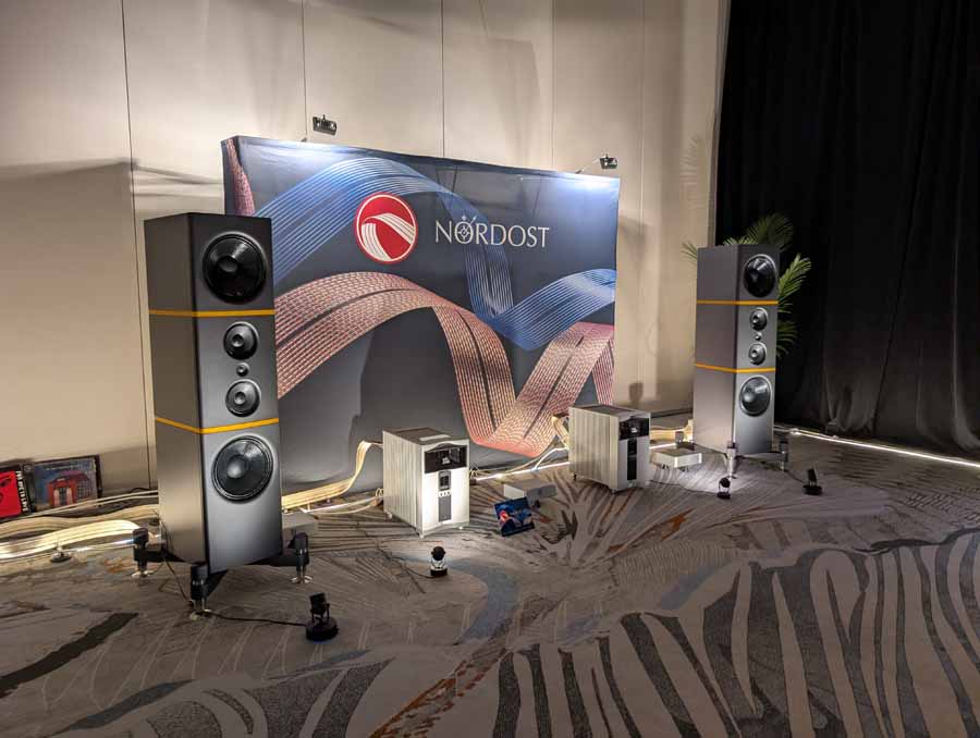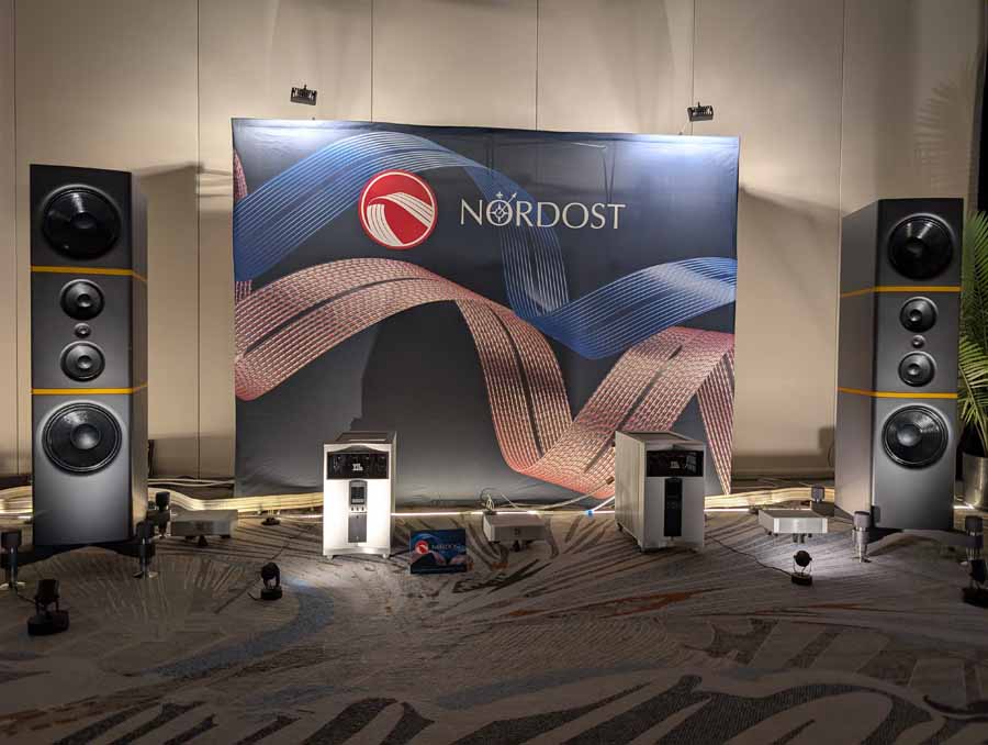Nordost had partnered with VTL and Stenheim and had a high-end analogue and digital system featuring the VPI Avenger Direct Turntable and dCS Vivaldi Apex DAC, Vivaldi Upsampler, and Vivaldi Master Clock. The electronics consisted of the VTL TP-6.5 Series II Signature Phono Stage, TL-7.5 Series III Reference Preamplifier, and the first US showing of VTL’s new Lohengrin 400 Watt Reference Monoblock amplifiers, which we heard at Munich in their prototype incarnation. They were driving the Stenheim Reference Ultime Two SX speakers. The system included a full suite of Nordost cabling and power products, including including Odin Gold cabling, QBase Reference Power Distribution and Qnet7 switch.