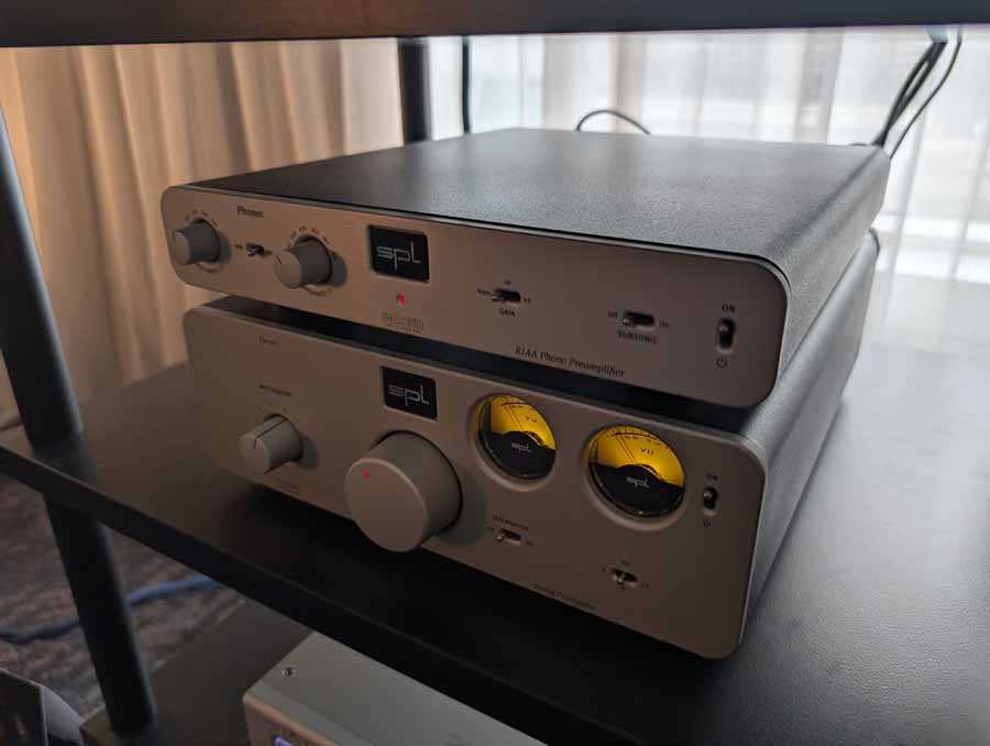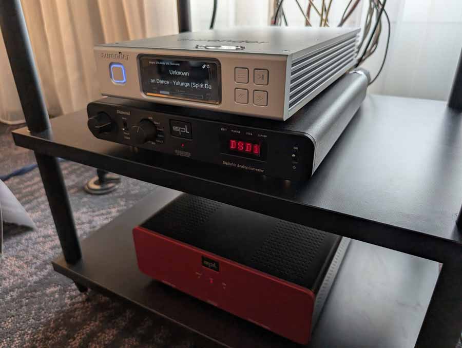 In the second 2WA room you had the SPL S800 amplifier paired with the SPL Elector preamplifier, driving a choice of Falcon LS3/5A Gold or Falcon M20 speakers (the M20 were playing when we visited the room). The setup featured an Aurender digital source feeding an SPL Diamond DAC, along with a Pear Audio Capt Handy turntable and SPL Phonos pre-amp for analogue playback, all integrated with Argent Pür cabling