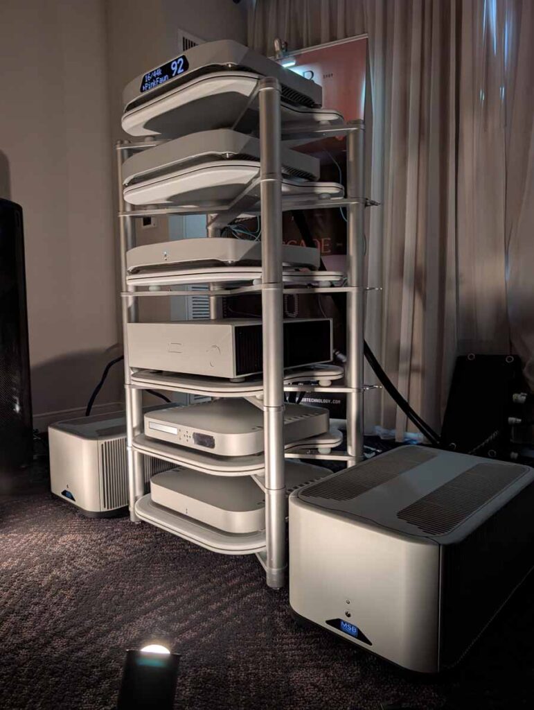 In the second REL room you had their S/550 subs in a line-array setup, with a pair of Wilson Watt Puppy speakers, Dan D’Agostino Momentum integrated amp, and Wadax Studio Player as the source – all on Seismion isolation platforms. Cabling and mains conditioning was from Shunyata.
