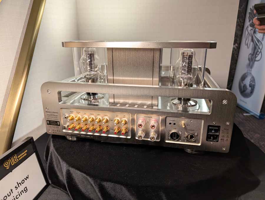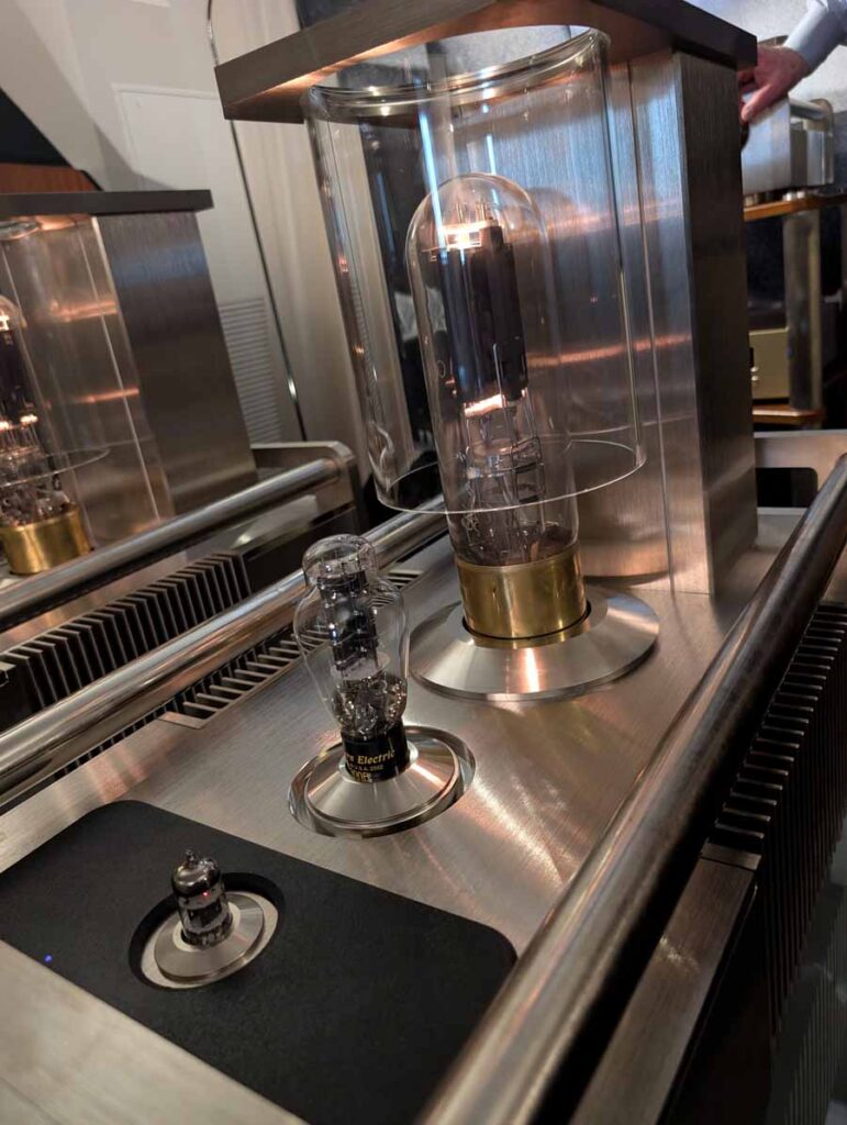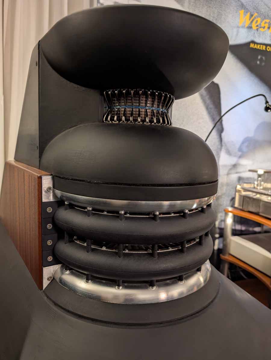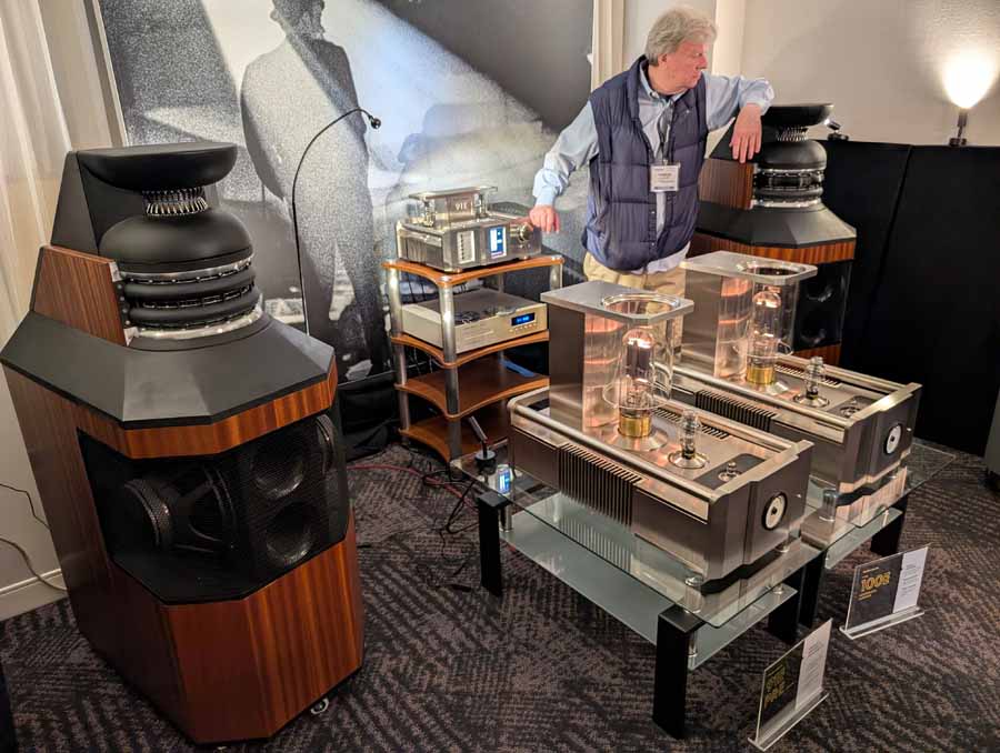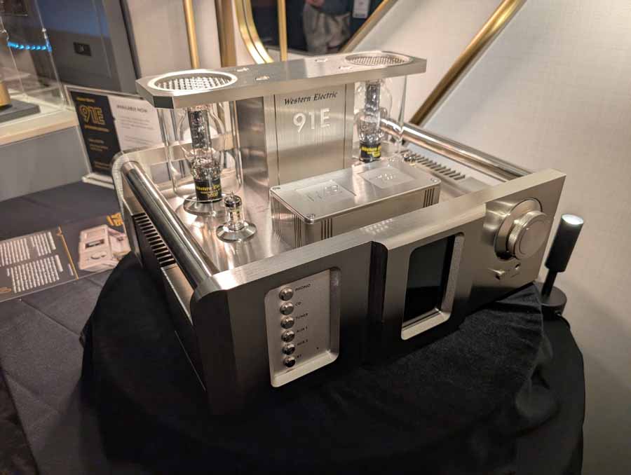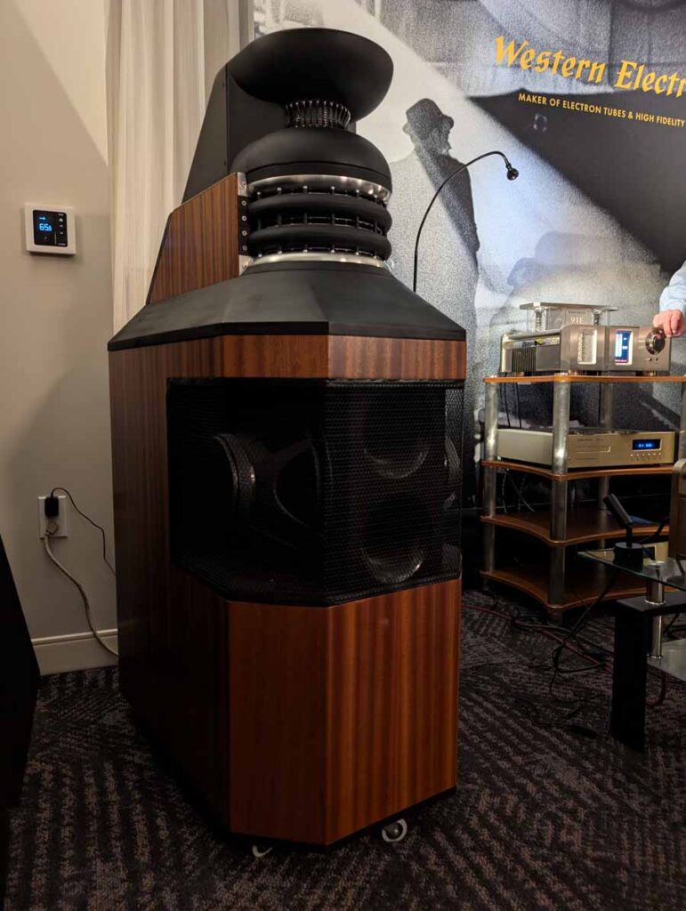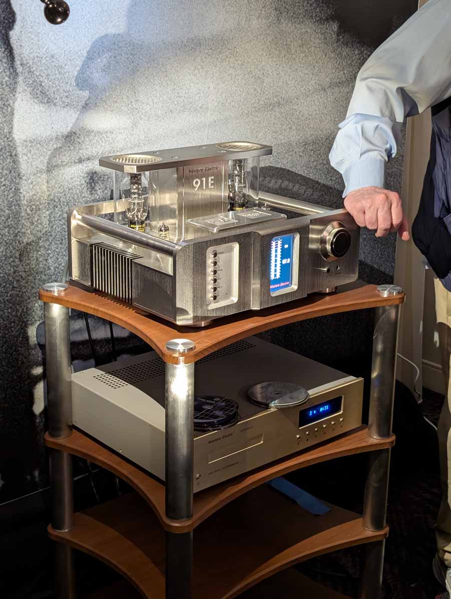 In here you had a pair of Western Electric 100E monoblock amplifiers paired with the Western Electric 91E preamplifier, driving the Western Electric A2 loudspeakers. The system featured the Western Electric 203C CD player as a digital source, showcasing the company’s new flagship triode electronics and high-dispersion AMT driver technology.