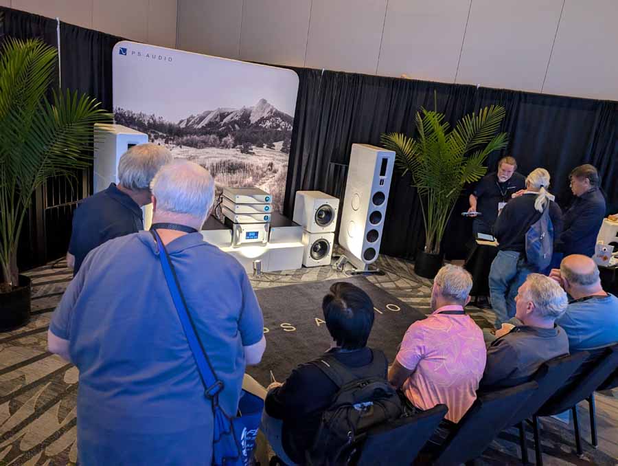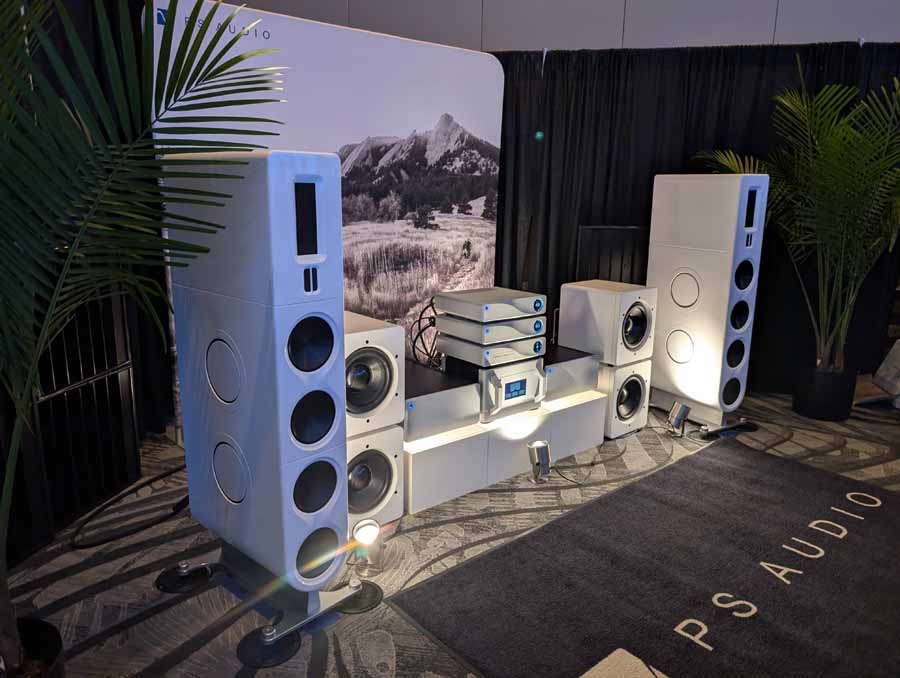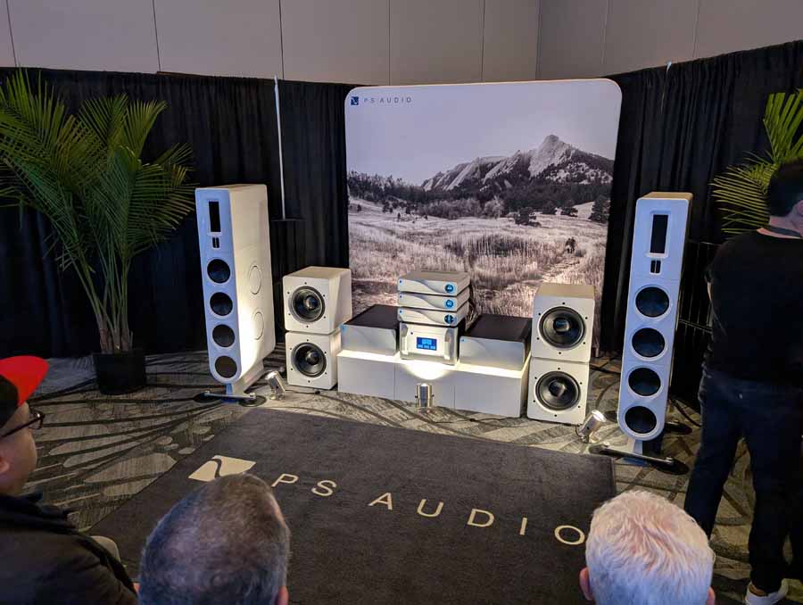 PS Audio showcased a flagship system featuring the PMG Signature SACD Transport, PMG Signature 512 DAC with Streamer, and PMG Signature Preamplifier. The power was delivered by a pair of PMG Signature 800 Monoblocks, driving the Aspen FR30 loudspeakers with support from Foundry F12 subwoofers. Power was provided by the P20 PowerPlant regenerator, and the entire setup was hooked up AudioQuest Suite. The room also featured the Aspen FR20, FR10, and FR5 (with stands) loudspeakers on display.