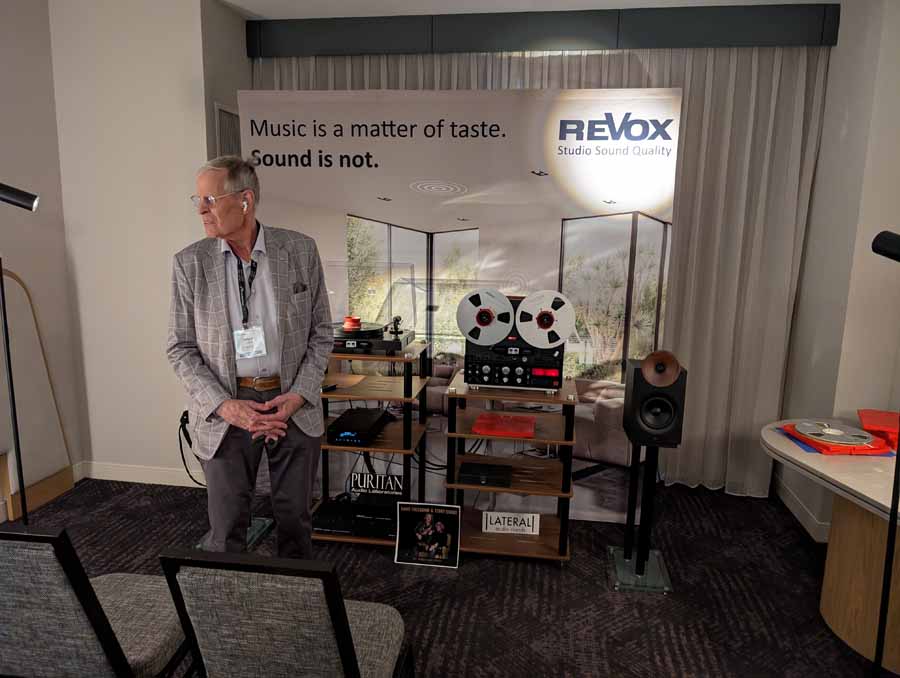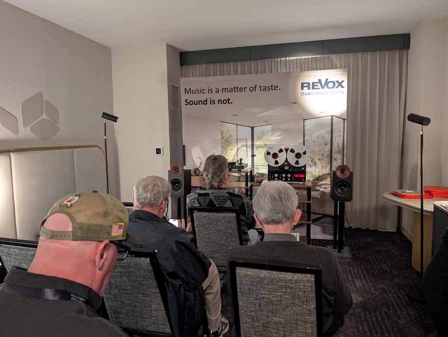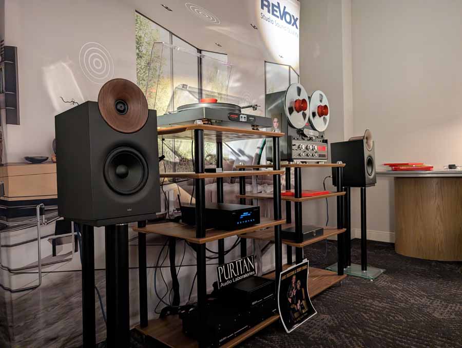 Revox had their ReVox StudioMaster M500 integrated amplifier driving the Aretai Contra 100S speakers with Walnut waveguides. The room featured a comprehensive analogue source selection, including the ReVox B77 MKIII reel-to-reel tape deck and the ReVox T77 turntable fitted with an Ortofon Black S cartridge. The system was supported by a Puritan 156XX-AC power conditioner and housed on a Lateral Cadenz-VR audio stand, they were using Transparent ULTRA XLR interconnects and Cardas SE9-MP speaker cabling.
