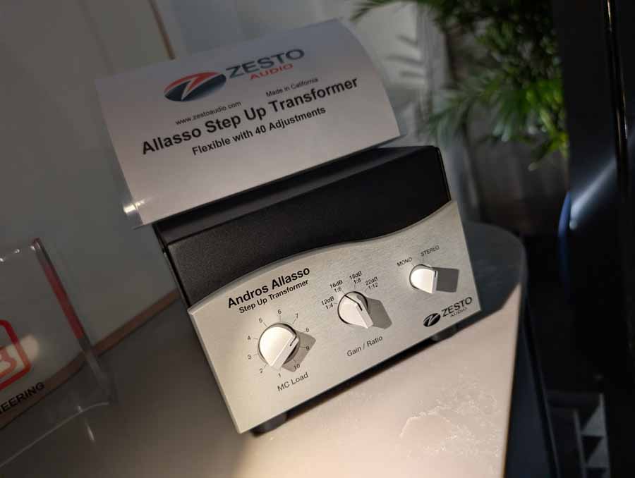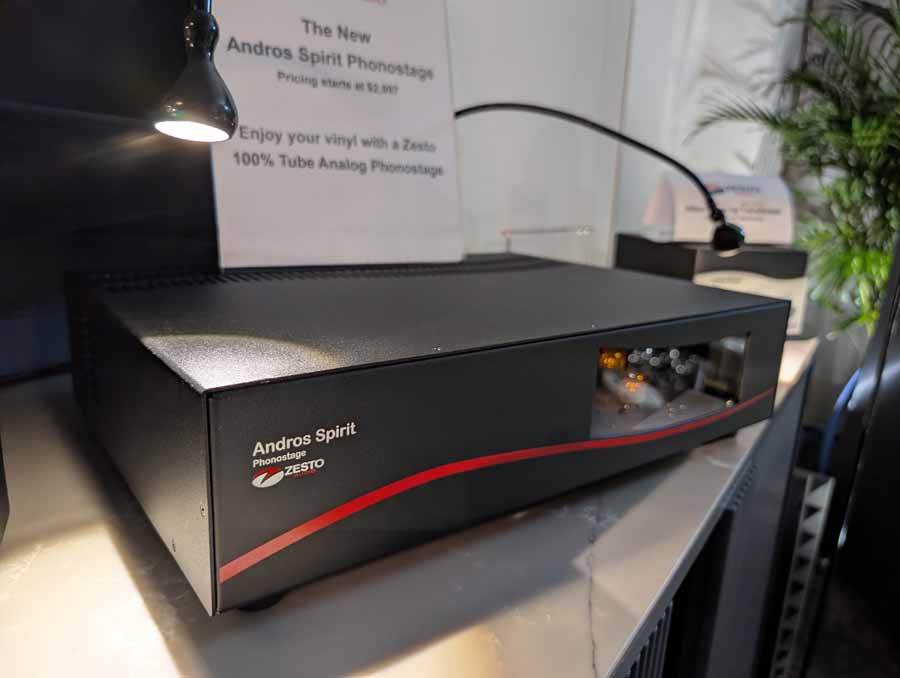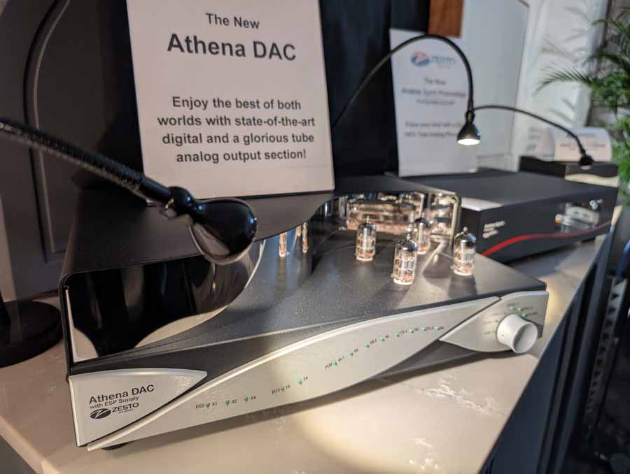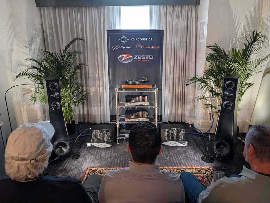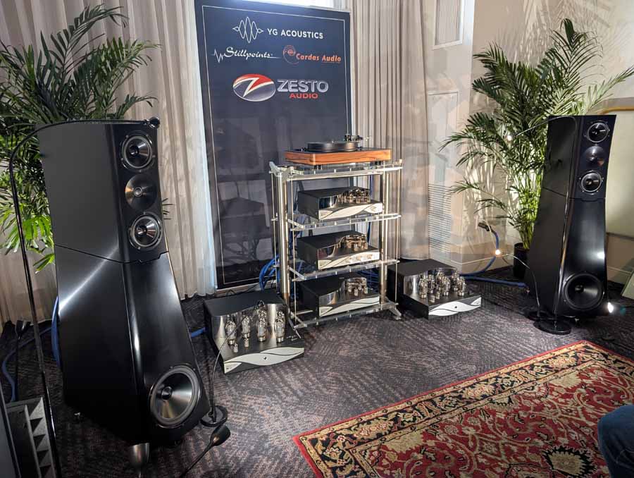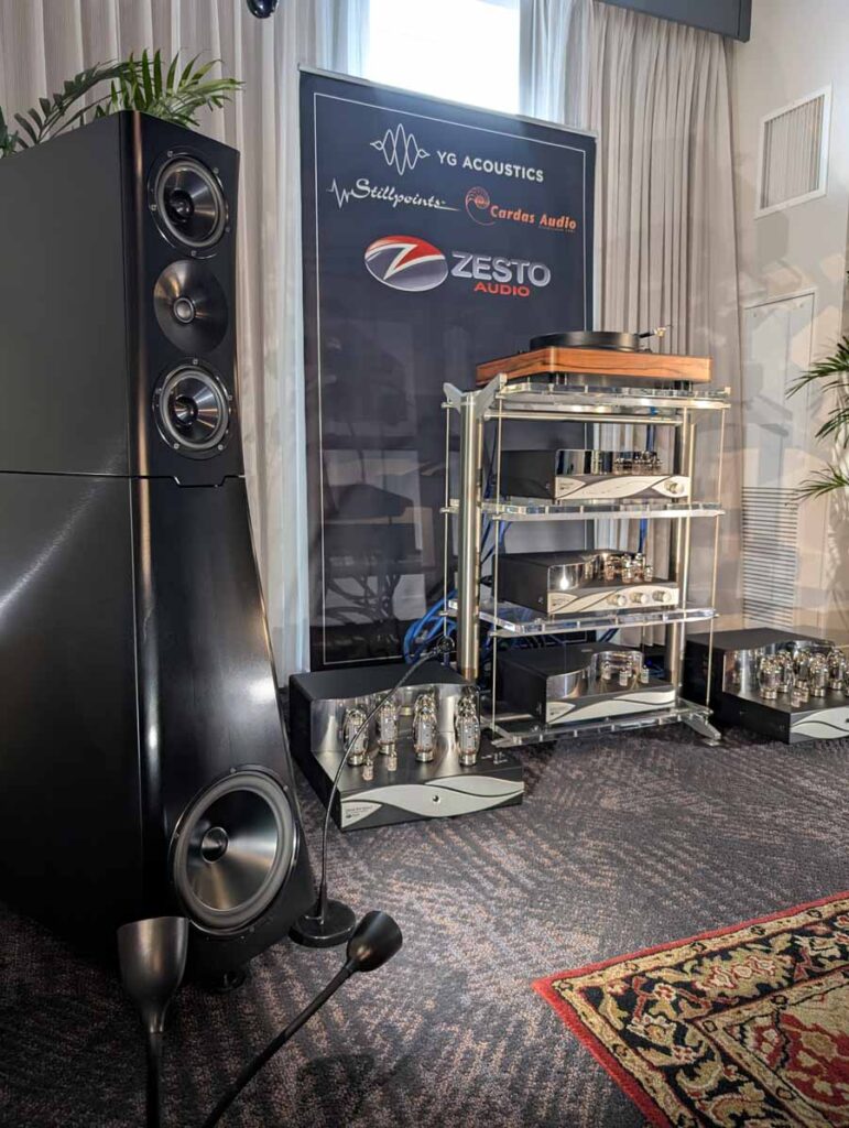 Here you had the Zesto Audio Eros 500 monoblock amplifiers driving YG Acoustics Sonja 3.2 speakers, with Andros Deluxe II phono stage, and Leto Ultra II Line pre-amp. The system also featured the new Zesto Audio Athena tube DAC, demonstrating a full Zesto Audio system. They were using Cardas Clear Beyond cabling, Stillpoints rack, Aperture acoustics isolation feet, and Dr Feickert turntable with Tri-Planar tonearm.
